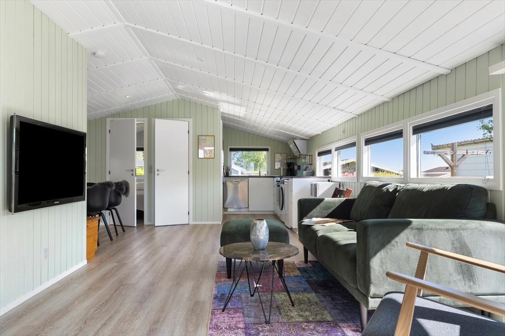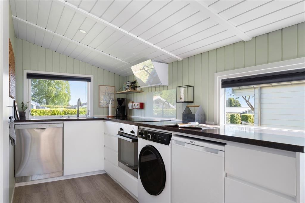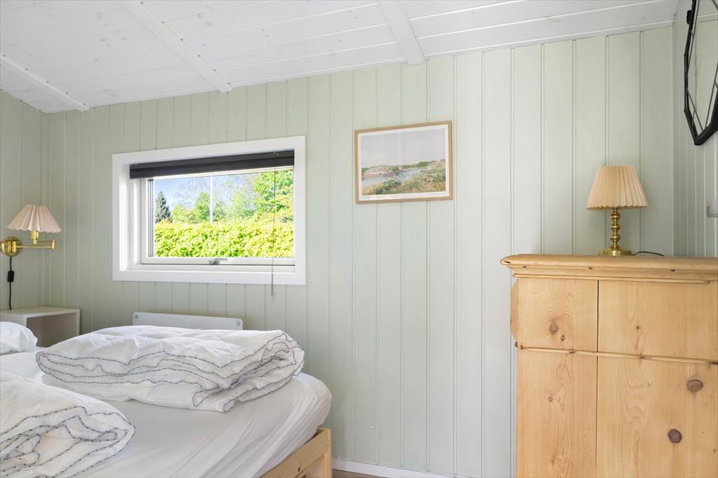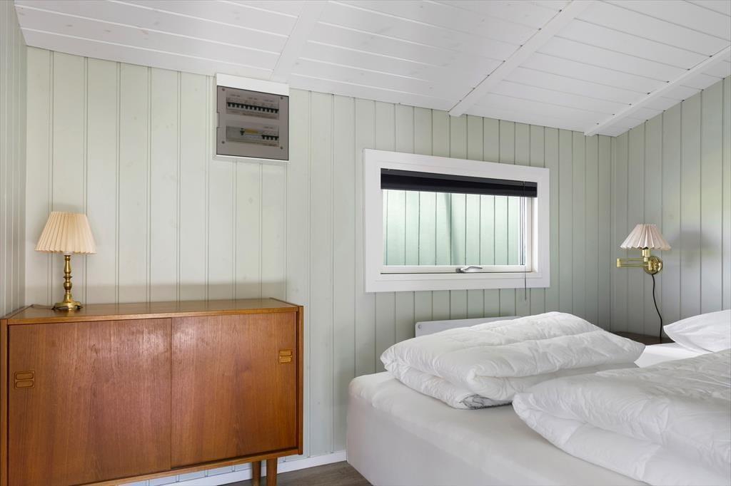 Når du træder ind i sommerhuset, mødes du af et lyst og luftigt rum med loft til kip og en rolig atmosfære, der med det samme får dig ned i tempo. Indretningen er moderne og smagfuld med en åben planløsning, hvor køkken, spiseplads og stue smelter sammen og skaber de perfekte rammer for hyggelige stunder med god mad, grin og brætspil. Det naturlige lys strømmer ind gennem store vinduespartier og fremhæver husets lyse farver og enkle æstetik. Overalt er der små detaljer, der understøtter følelsen af hjemlig hygge og afslapning, og i soveværelserne kan du trække dig tilbage og nyde roen, når feriedagen går på hæld. Her får du en tryg og rar base til din ferie – uanset om du er til lange strand dage, udflugter eller ren afslapning med en god bog i sofaen.