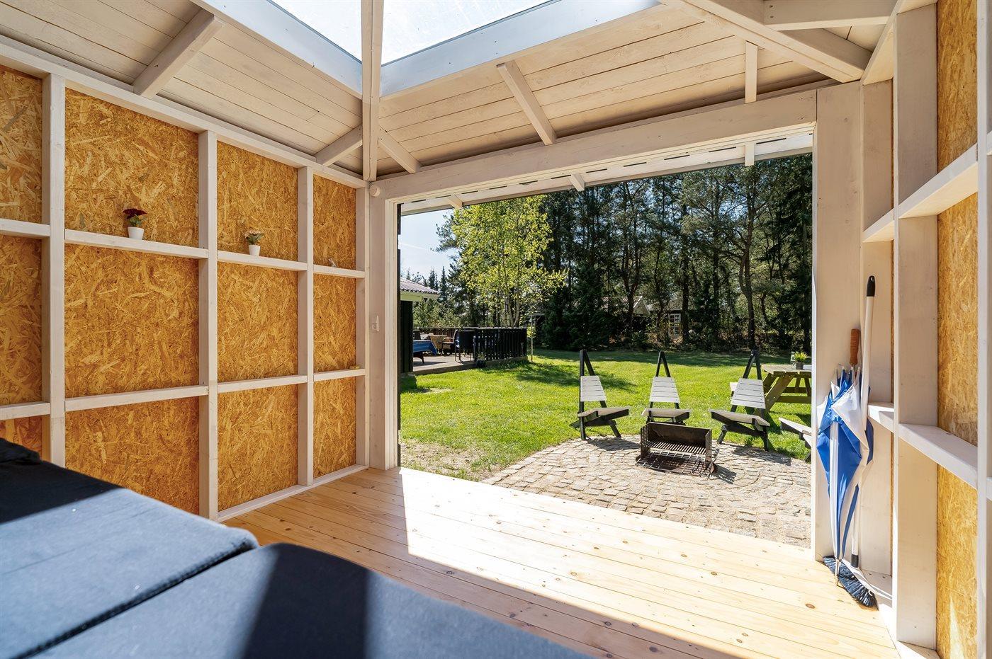 Velholdt sommerhus i roligt område nær hav og golfbane med overdækket terrasse og oplader til elbil.