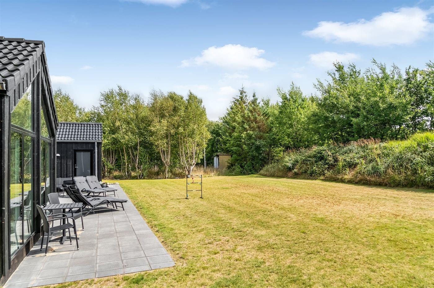 Huset byder på en skøn, rummelig terrasse, hvor der altid er mulighed for at finde læ i et af de mange hyggelige hjørner. Her kan I nyde solrige dage, tænde op i grillen og samle familien til dejlige måltider under åben himmel. Den store græsplæne giver god plads til leg, spil og afslapning, uanset om det er med boldspil eller en rolig stund i solen.