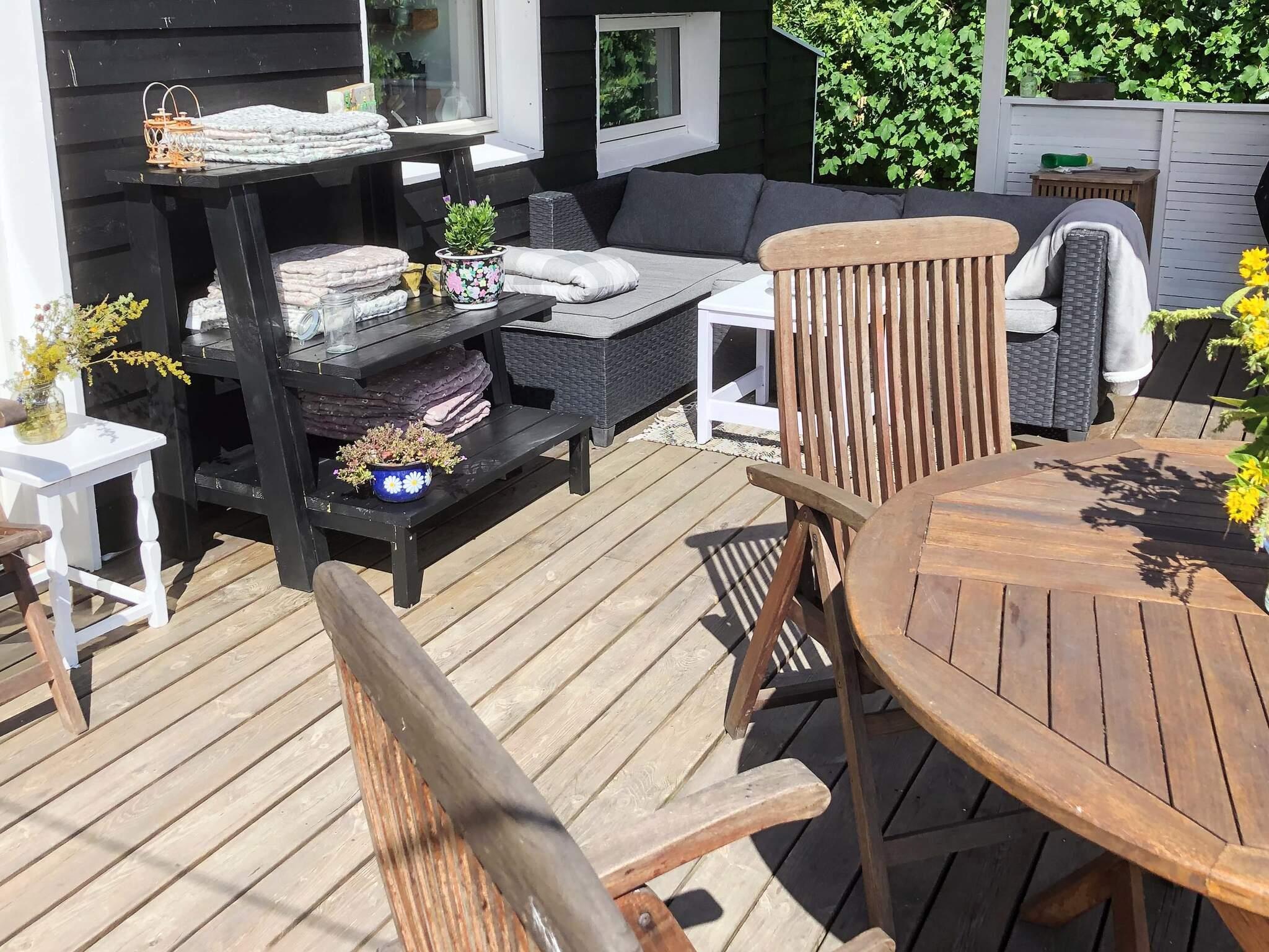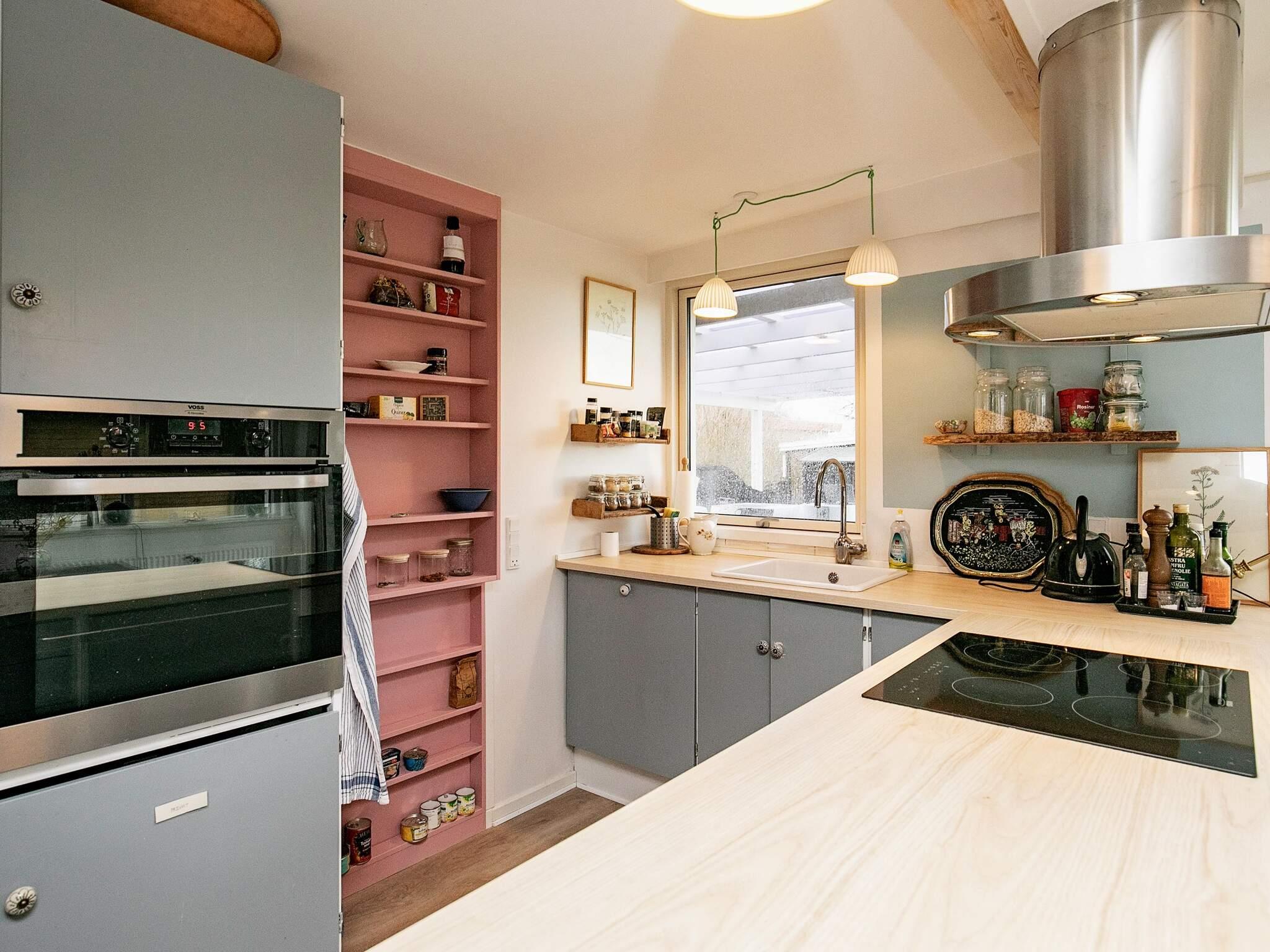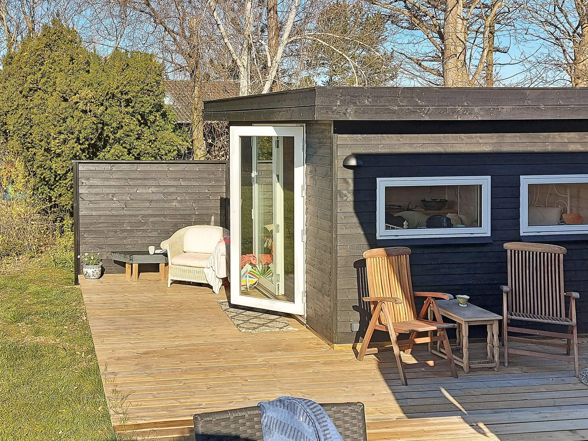 Åbent køkken med nyere hårde hvidevarer, brændeovn, B&O fjernsyn og Apple-TV. Der er ingen tv-kanaler i huset. Tv kan forbindes til eget medbragte udstyr. Soveværelse ved stuen med glasdør for at give et godt lysindfald. Herudover soverum med en 1,5 mands dobbeltseng. Der er både vaskemaskine og tørretumbler. På terrassen kan udsigten over mark og skov nydes, og om aftenen solnedgangen.