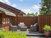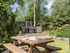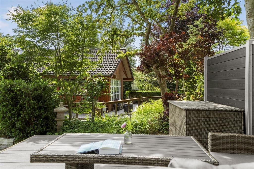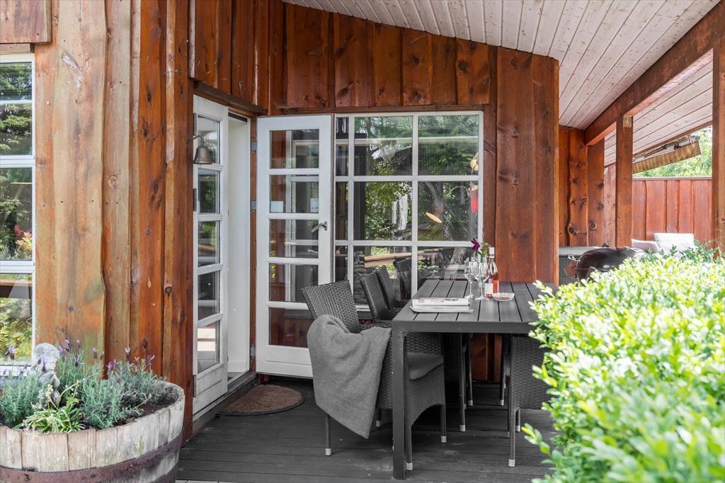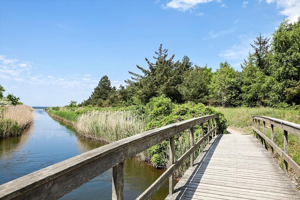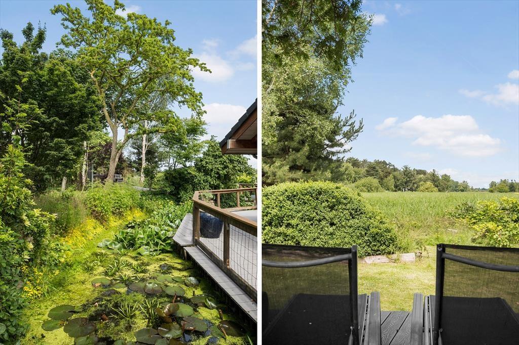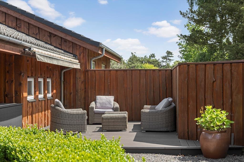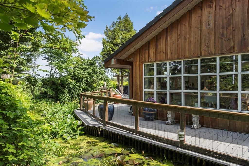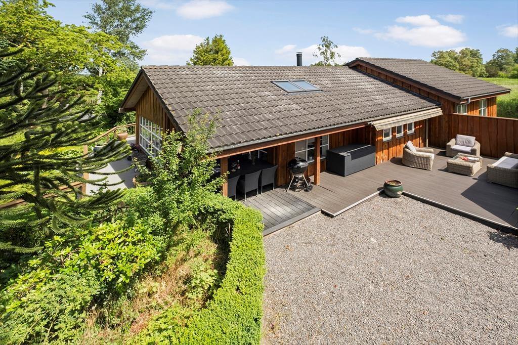 Huset har en 2300 m2 grund med en idyllisk have med en å og fiskedam, samt flere terrasser og pavilloner, så man altid kan finde sol eller læ. Ved feriehuset er der vildmarksbad, shelter, bålplads, havemøbler, liggestole, parasol og grill.