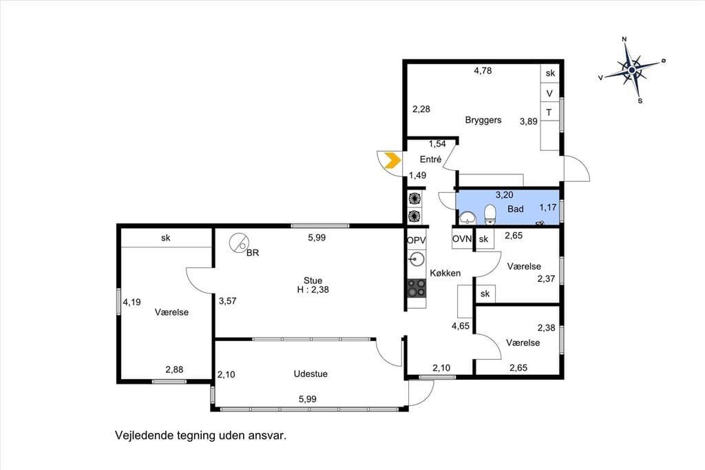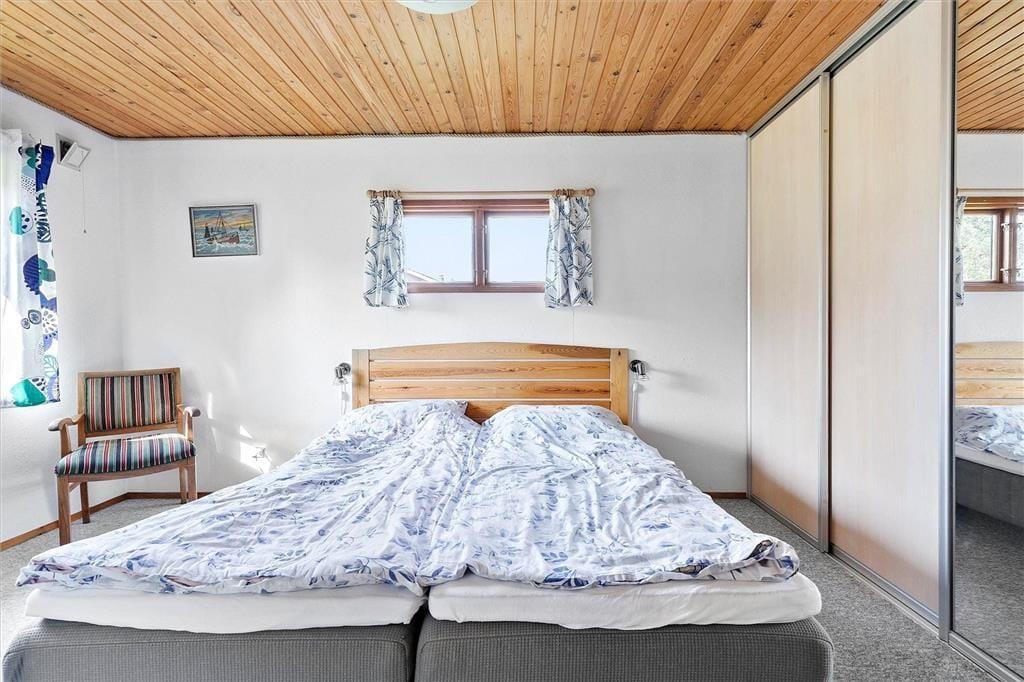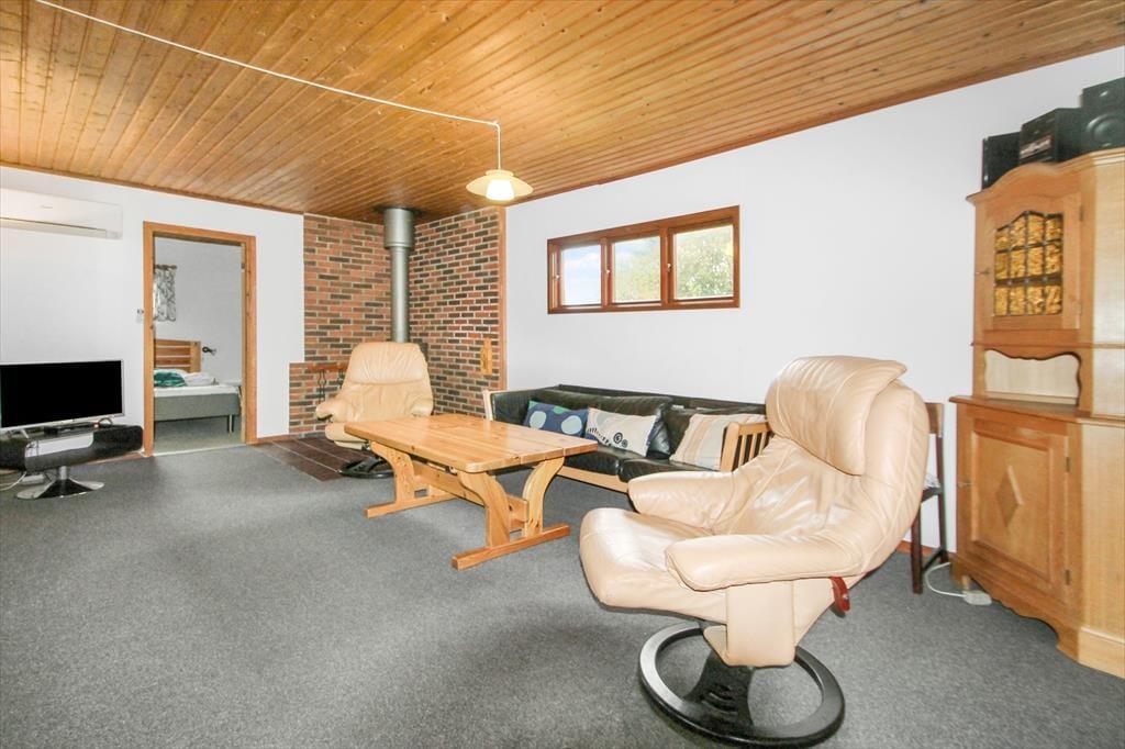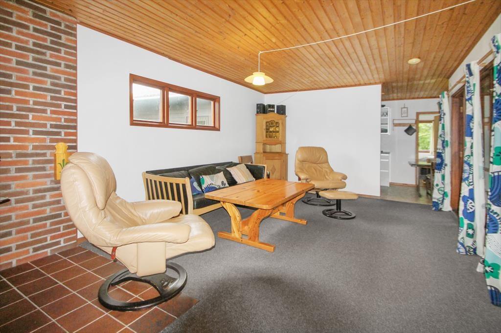 Helårsanvendeligt sommerhus som er indrettet med separat køkken og opholdsstue. Nyere lyst Køkken som indeholder indbygget ovn, kogeplader med induktion, opvaskemaskine, mikroovn og god spiseplads. Entre med køleskab med fryser. Opholdsstue med udgang til skøn udestue indeholder brændeovn, sofa, lænestole og tv med danske, svenske, norske og tyske kanaler. Badeværelse med bruseniche, klinkegulv og gulvvarme. Bryggers med vaskemaskine og tørretumbler. Tre soveværelser, to med dobbeltsenge og et med en dobbelt sovesofa Huset opvarmes med varmepumpe, Brændeovn og elvarme.