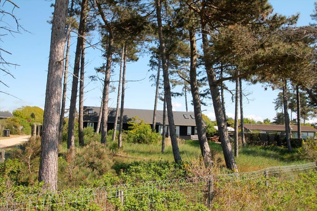Huset har en 1408 m2 naturgrund, hvor der er en lukket have/grund med en åben træterrasse, hvorfra der er en skøn panoramaudsigt til havet og udsigt til natur. Den store vilde have i forgrunden skaber en følelse af at være omgivet af naturen. Ved feriehuset er der havemøbler liggestole og gasgrill.