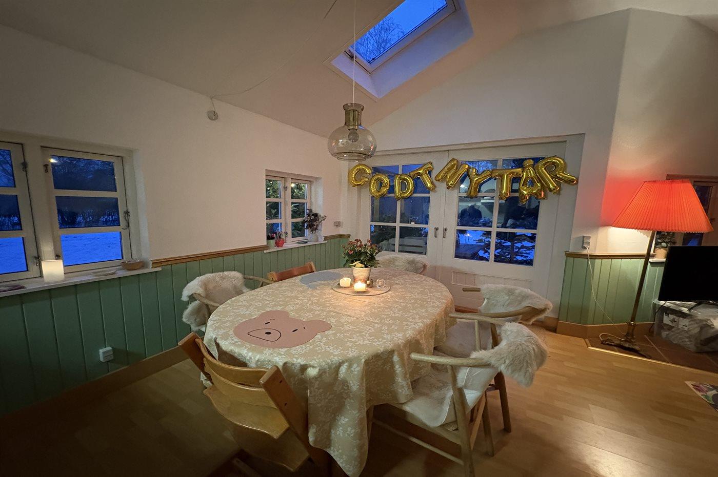 Stue, spiseplads og køkken er ud i ét med god mulighed for at være sammen og hygge sig og herfra er udgang til den overdækkede terrasse og til den store have.