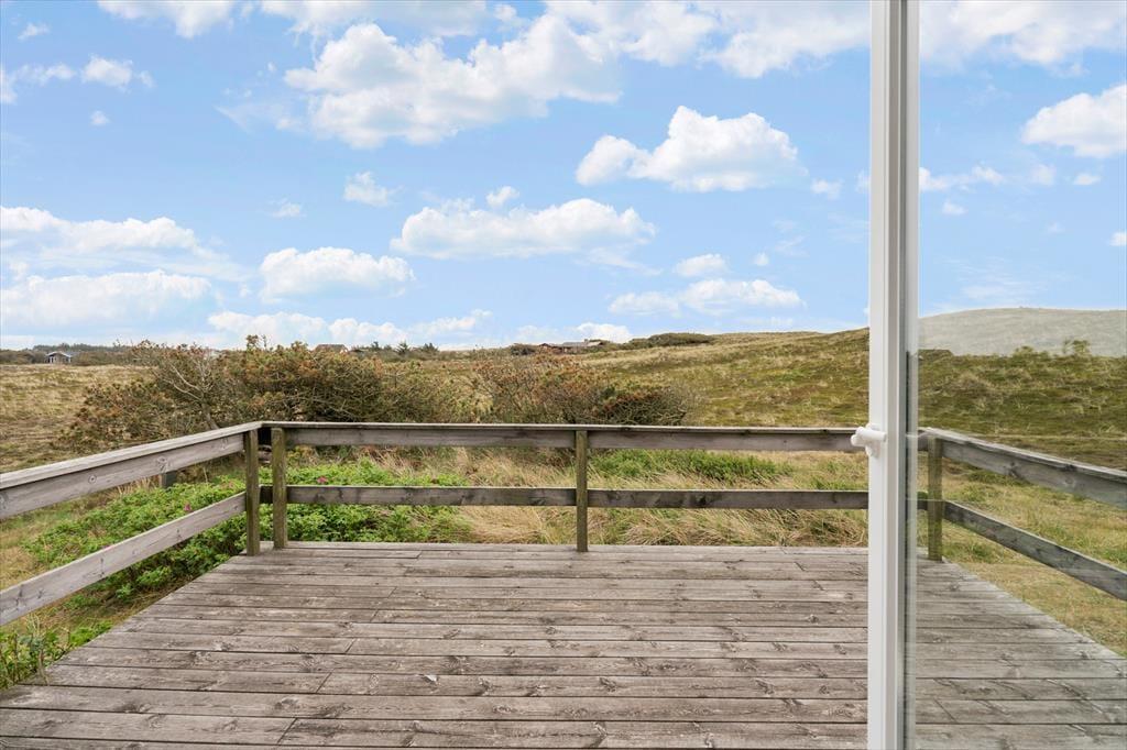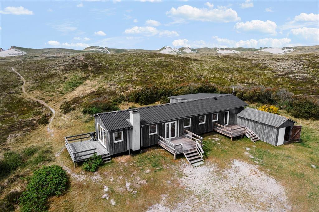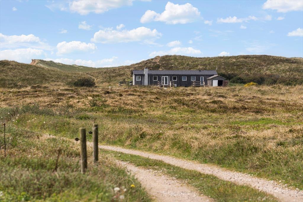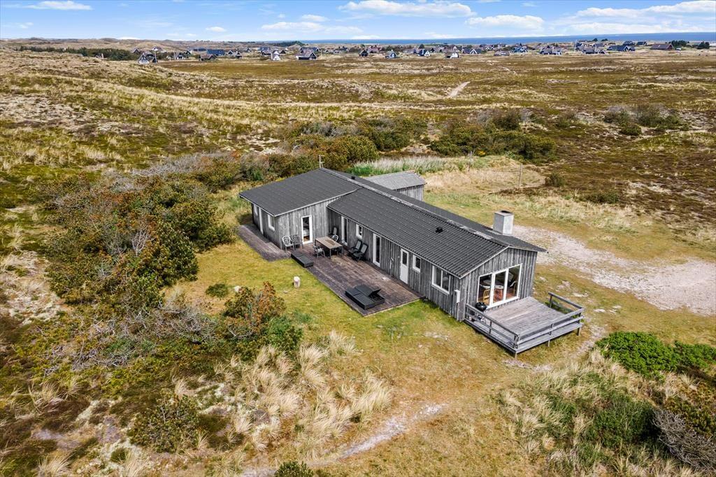 Drømmer I om at have masser af plads omkring jer og smuk natur til alle sider, når I holder ferie? Så skal I sætte kursen mod dette hyggelige træsommerhus, der ligger på vidtstrakt naturgrund på næsten 15 hektar. Vesterhavet og Bjerregård Strand venter bare 400 meter væk, og mod øst kan I nyde den smukke udsigt over det åbne land mod Ringkøbing Fjord.