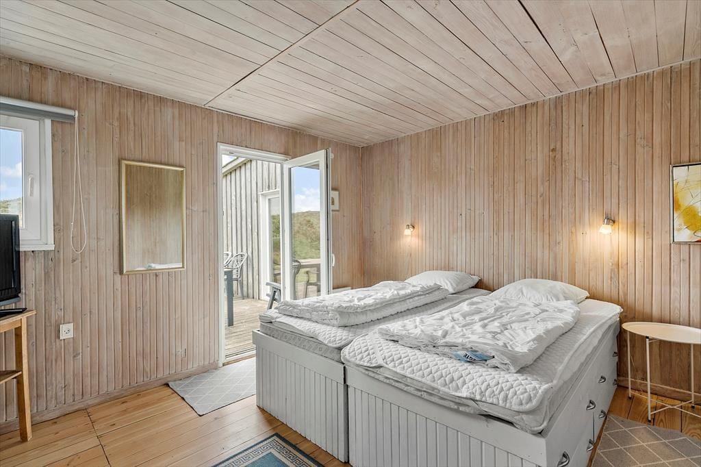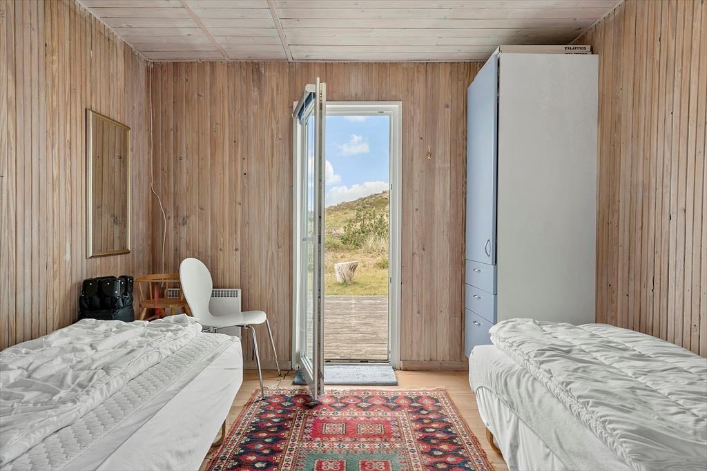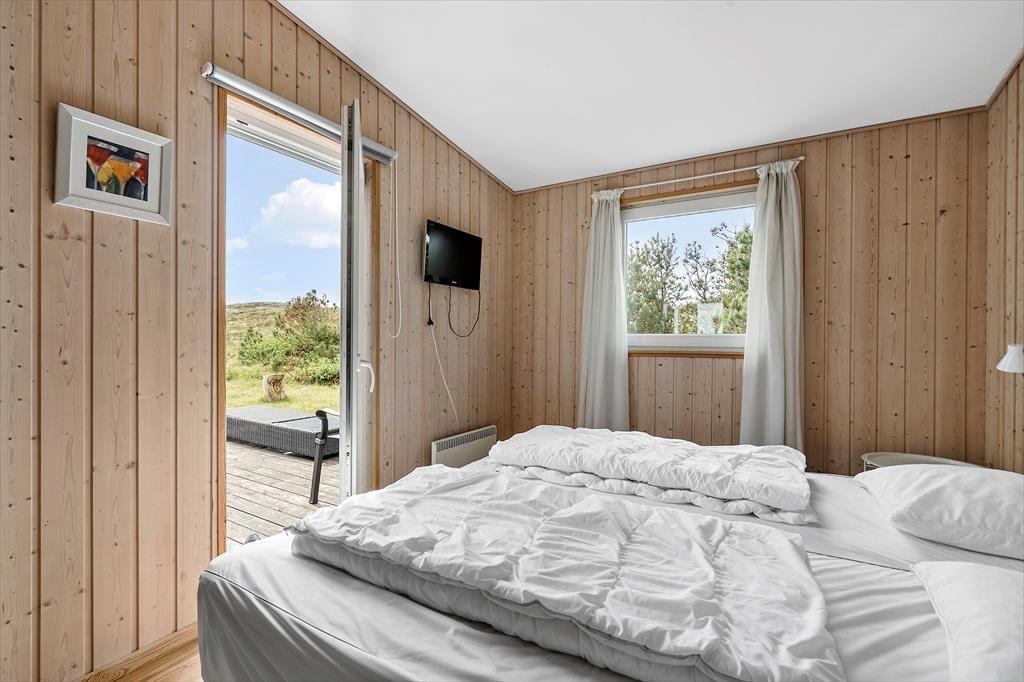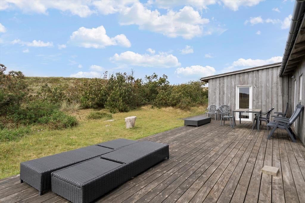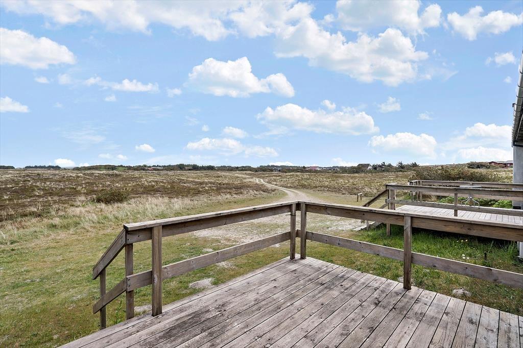Drømmer I om at have masser af plads omkring jer og smuk natur til alle sider, når I holder ferie? Så skal I sætte kursen mod dette hyggelige træsommerhus, der ligger på vidtstrakt naturgrund på næsten 15 hektar. Vesterhavet og Bjerregård Strand venter bare 400 meter væk, og mod øst kan I nyde den smukke udsigt over det åbne land mod Ringkøbing Fjord.