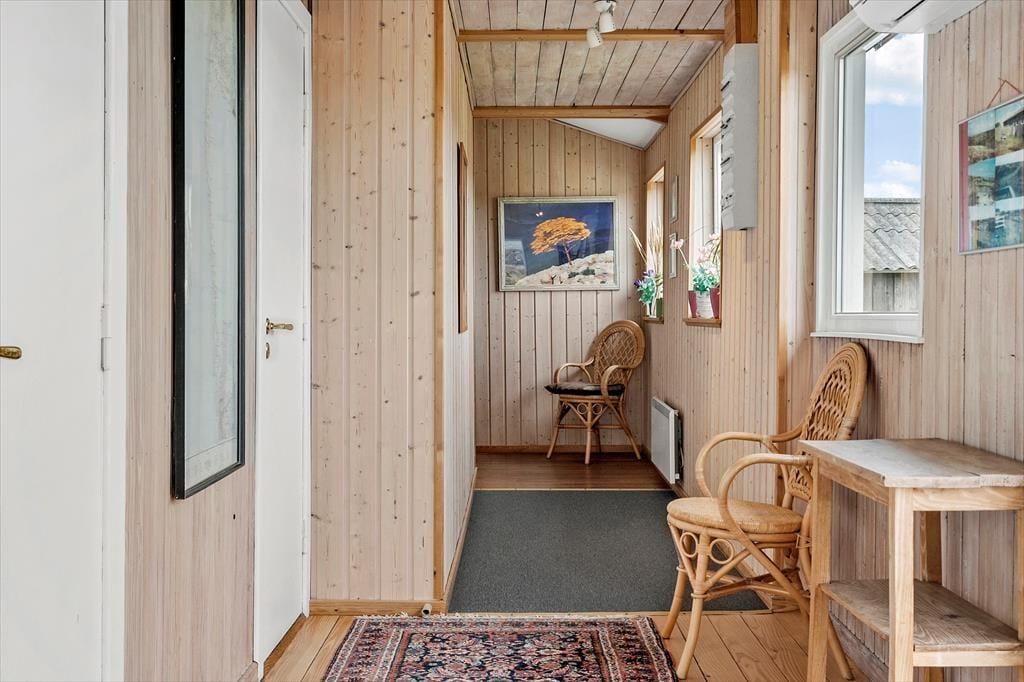 Ikke kun fra stuen, men fra alle soveværelser og badeværelset har I direkte adgang til det fri. Med andre ord kan I hurtigt smutte ud for at trække frisk luft og nyde solen på terrasserne, der ligger både øst, syd og vest for sommerhuset. Takket være grundens imponerende størrelse er der langt til naboerne, og I kan være helt jer selv, når I slikker sol i liggestolene, griller og tager de naturskønne omgivelser helt ind. Hvis I medbringer et ladekabel, er der CEE-stik til elbilen, og har I egen havkajak eller lignende, kan I glæde jer over at have brugsret til en lille fjordhavn.