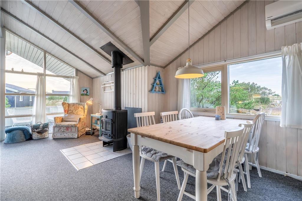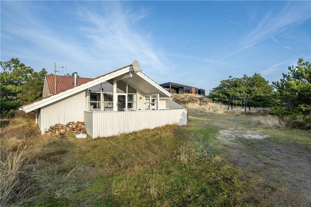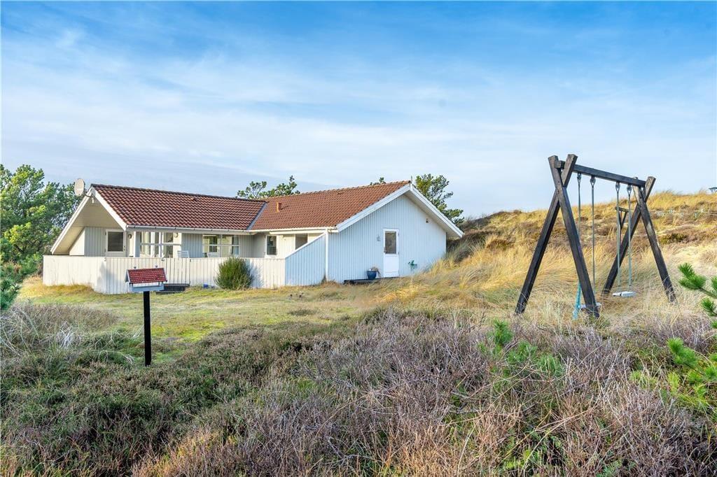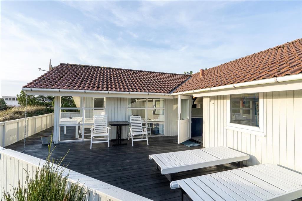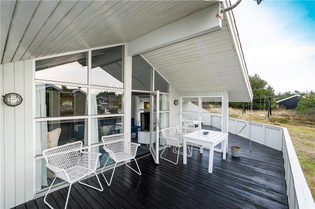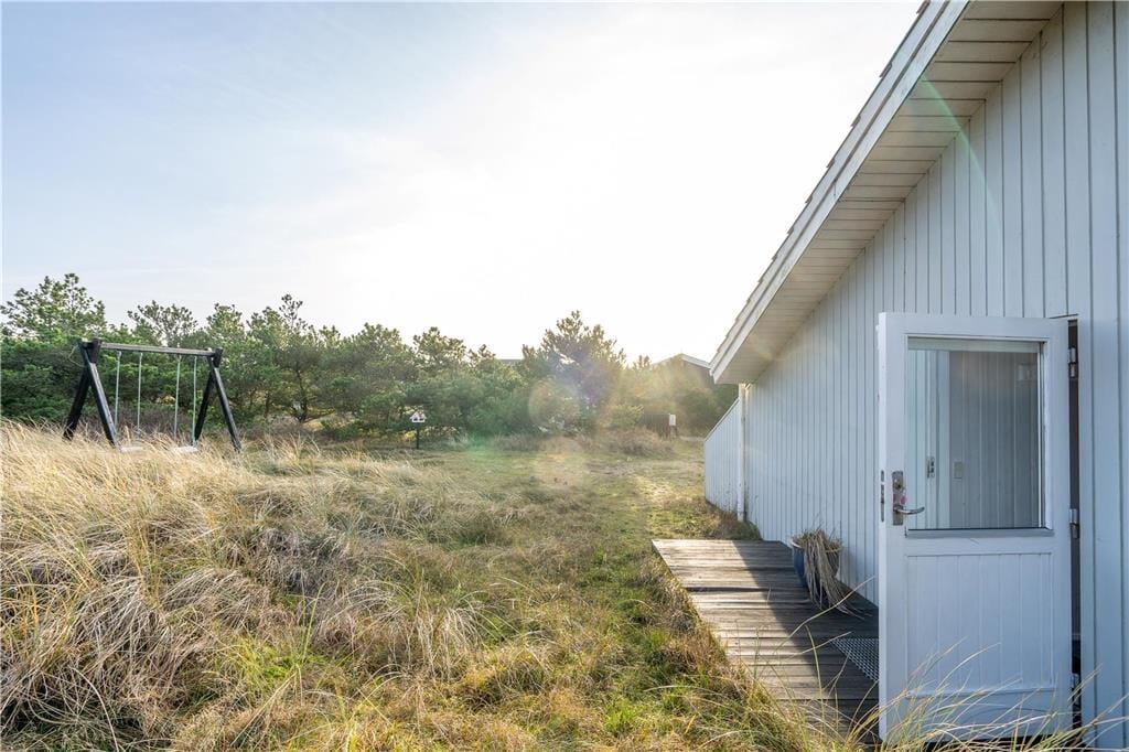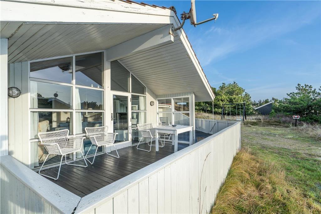 I får også en skøn ramme om ferielivet ude på den 50 m2 store træterrasse, der er orienteret mod sydøst. Terrassen er lukket og delvist overdækket, og mod vest sørger både huset og klitgrundens beplantning for læ, så I kan finde en skøn opholdsplads, når I vender hjem efter strandturen. Der er for øvrigt en gynge til børnene og en tørresnor på den kuperede, lyngbeklædte grund.