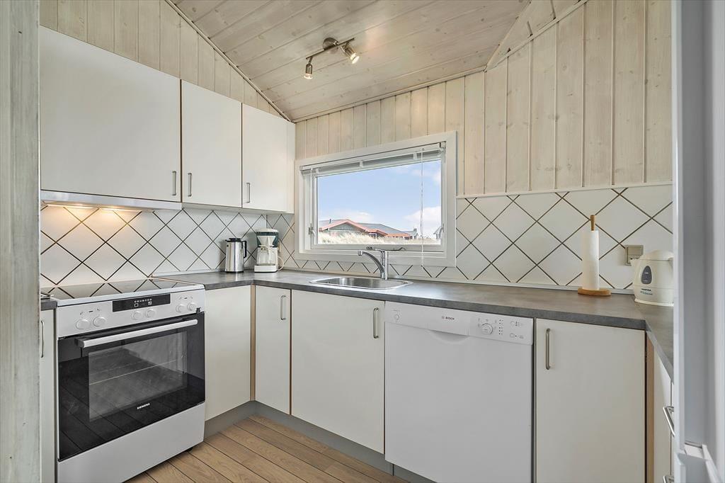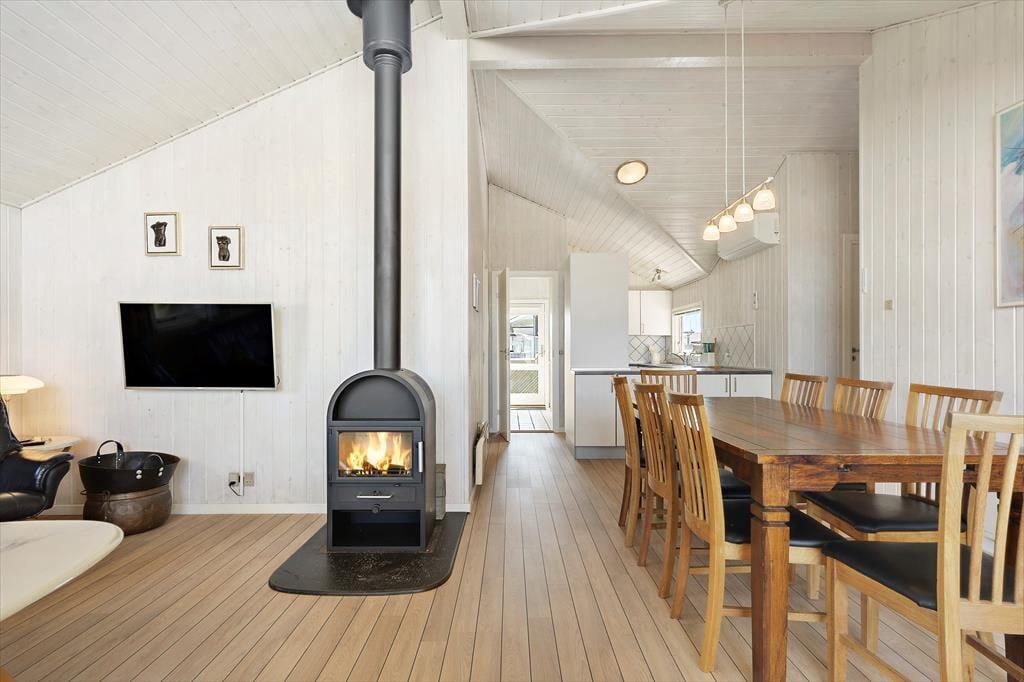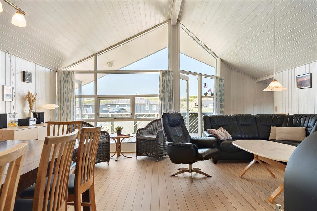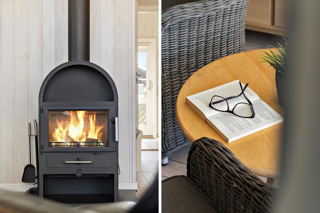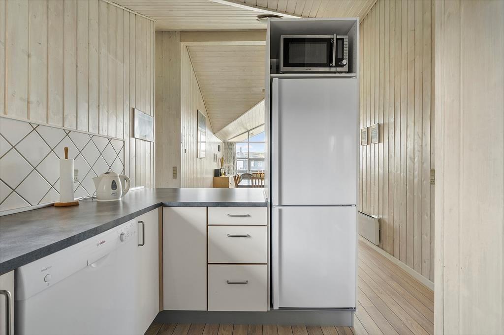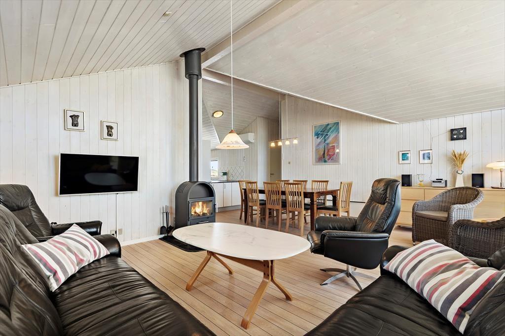 Ved ankomsten til sommerhuset giver hoveddøren adgang til et rummeligt bryggers med vaskemaskine, tørretumbler og god plads til overtøj og sko. Herfra kan I fortsætte ind i opholdsafdelingen, hvor køkken og stue er forenet. Gennem stuens store vinduesparti har I udsigt mod vest ud mod klitterne, hvilket er med til at højne feriefornemmelsen, når I sidder samlet om spisebordet eller slapper af i sofaen nær brændeovnen. En alkove fungerer som hyggekrog i løbet af dagen, og om aftenen kan I rede op til to personer – måske mest oplagt til to børn, der synes det er hyggeligt at have forældrene i nærheden, når det er sengetid. Planløsningen byder derudover på fire soveværelser, og de to badeværelser er også med til at gøre sommerhuset delevenligt for to familier. Det største badeværelse har i øvrigt spabad og sauna, så feriedagene kan byde på wellness og tilbagelænet afslapning.