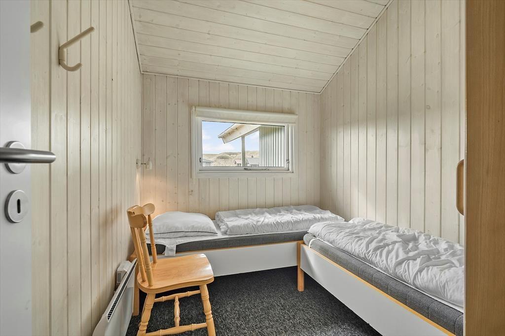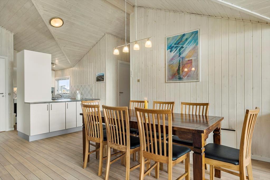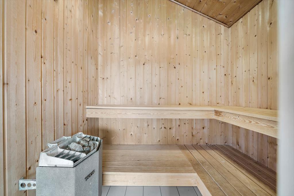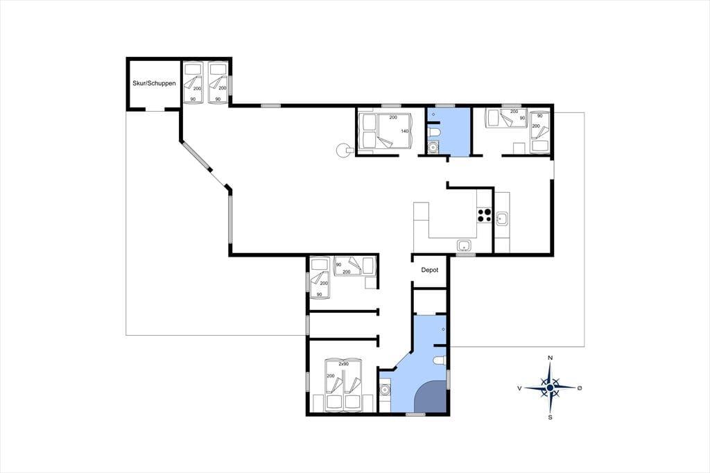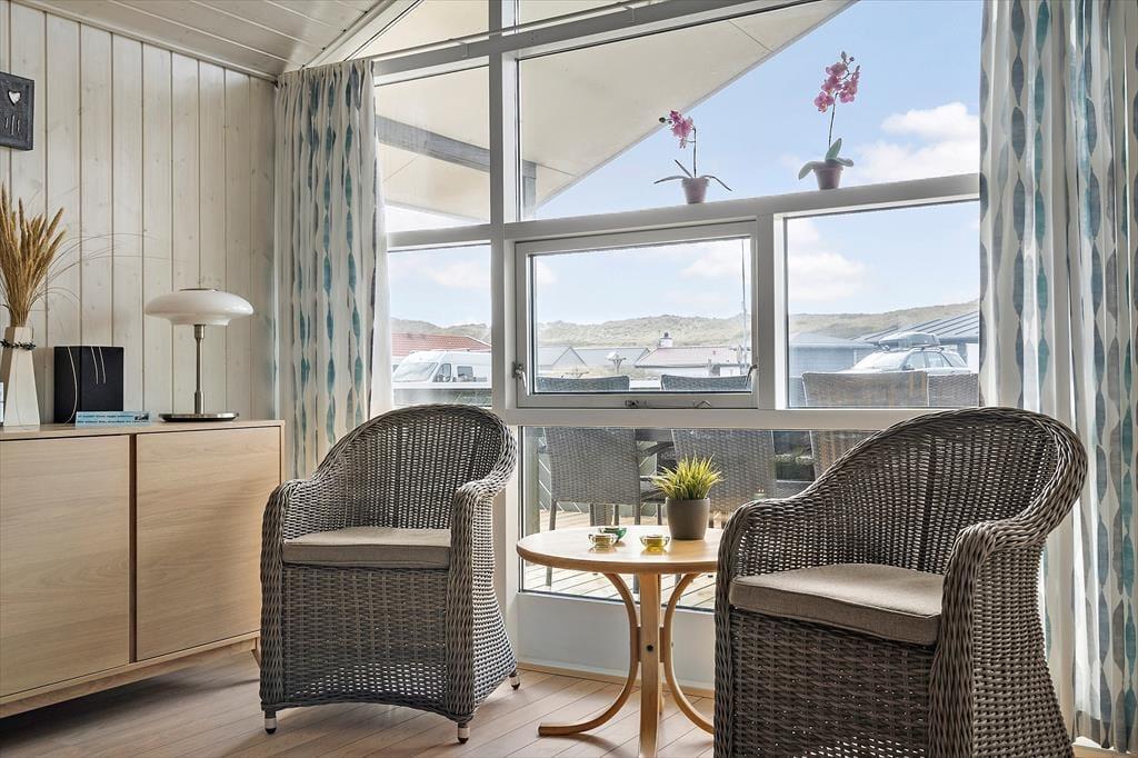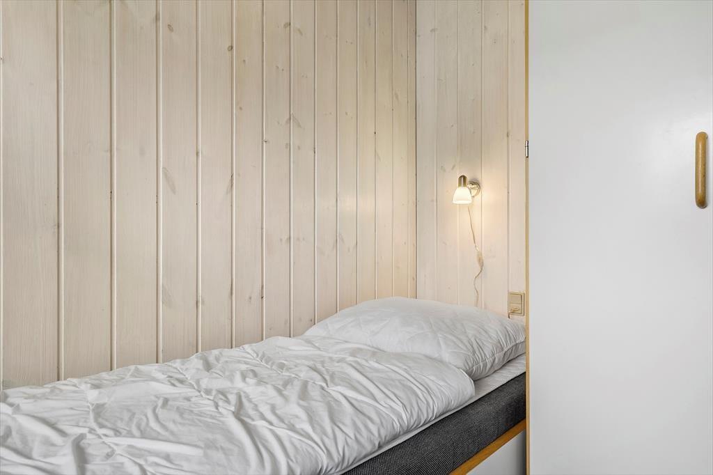 Ved ankomsten til sommerhuset giver hoveddøren adgang til et rummeligt bryggers med vaskemaskine, tørretumbler og god plads til overtøj og sko. Herfra kan I fortsætte ind i opholdsafdelingen, hvor køkken og stue er forenet. Gennem stuens store vinduesparti har I udsigt mod vest ud mod klitterne, hvilket er med til at højne feriefornemmelsen, når I sidder samlet om spisebordet eller slapper af i sofaen nær brændeovnen. En alkove fungerer som hyggekrog i løbet af dagen, og om aftenen kan I rede op til to personer – måske mest oplagt til to børn, der synes det er hyggeligt at have forældrene i nærheden, når det er sengetid. Planløsningen byder derudover på fire soveværelser, og de to badeværelser er også med til at gøre sommerhuset delevenligt for to familier. Det største badeværelse har i øvrigt spabad og sauna, så feriedagene kan byde på wellness og tilbagelænet afslapning.