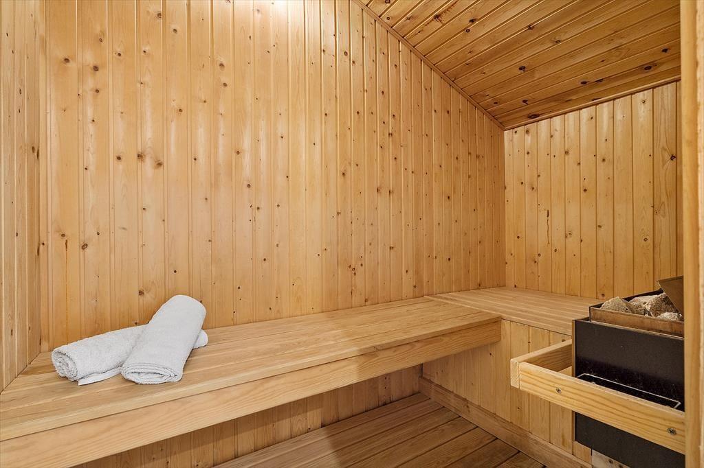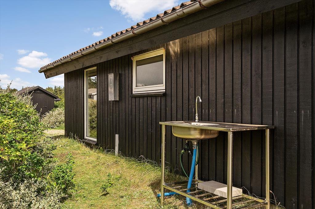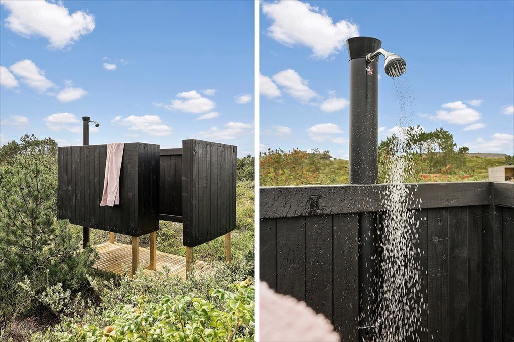 Der er også en udendørs bruser med solopvarmet varmt vand (ellers koldt) til afskylning på en varm dag efter en svømmetur i havet eller efter en tur i saunaen.
