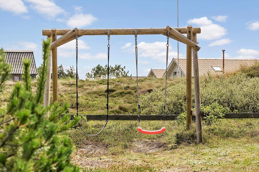 Fra stuen har I direkte adgang til et overdækket areal, der ligger som del af sommerhusets store og godt afskærmede terrasse. Den kan lukkes af med havelåger i begge ender, så hvis I har små børn eller hunden med på ferie, får de en tryg ramme om det udendørs driverliv. Til børnene er der for øvrigt både sandkasse og gyngestativ på naturgrunden, og der er også et bord-bænke-sæt, hvor I kan hygge jer med eftermiddagskaffen.