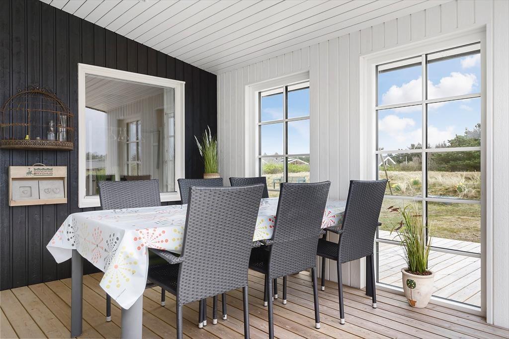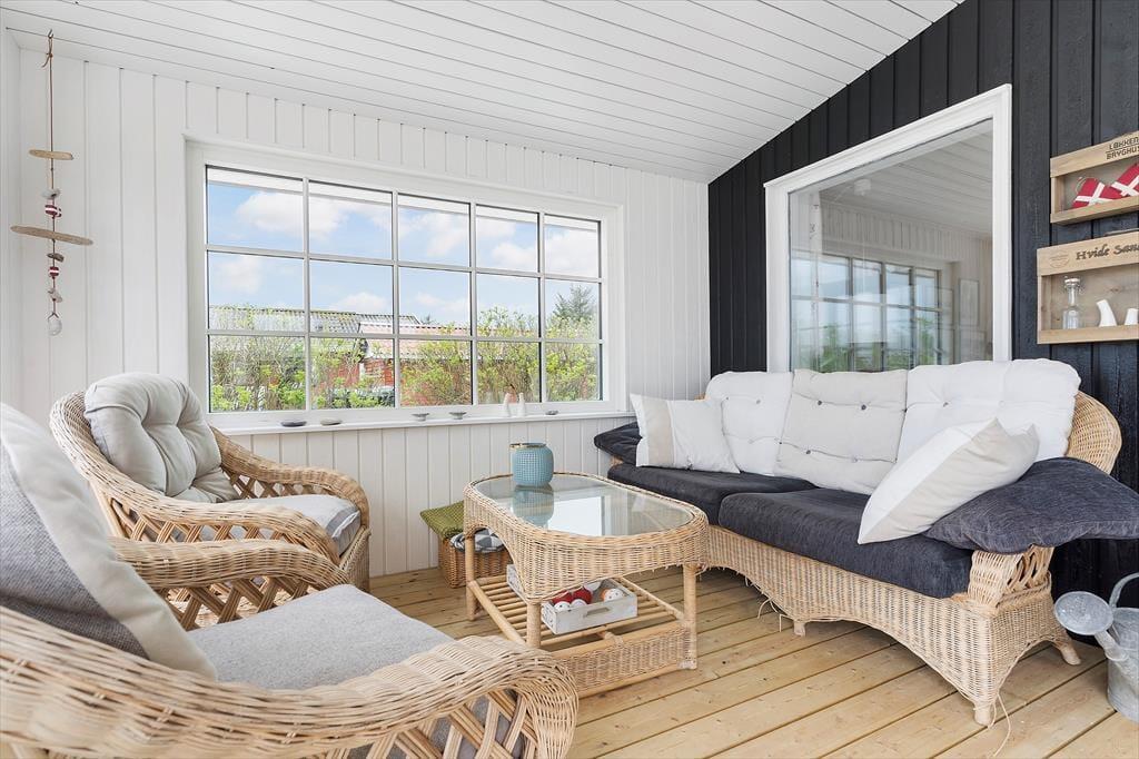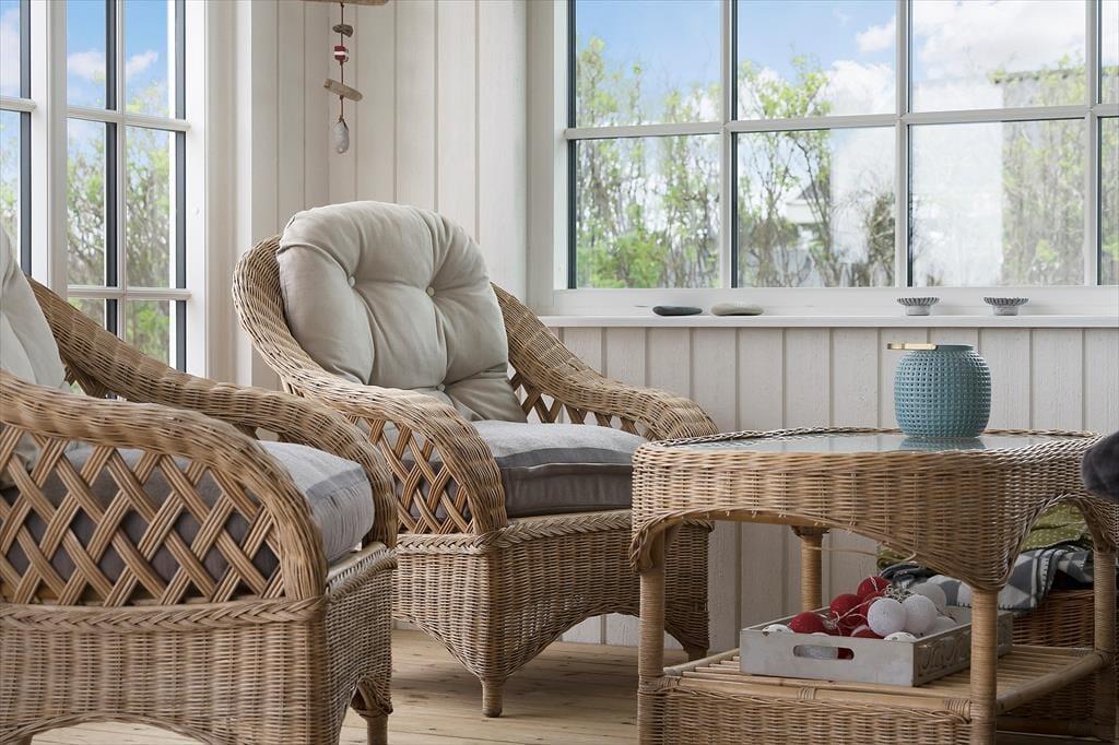 Den overdækkede og godt afskærmede terrasse er den perfekte overgang mellem ude og inde, for her kan I sidde i læ for vind og i ly for aftendug, men stadig ude i den friske luft. Der er både loungemøbler og spisebord – og hvis I hellere vil opholde jer helt ude i det fri, har I selvfølgelig også gode havemøbler til rådighed på det store og åbne terrassemiljø på 100 m2, der strækker sig over 3 sider af huset. Grunden byder på gyngestativ til de små og hvis I har surfudstyr, fiskegrej eller cykler med, er det rart, at husets skur kan aflåses.