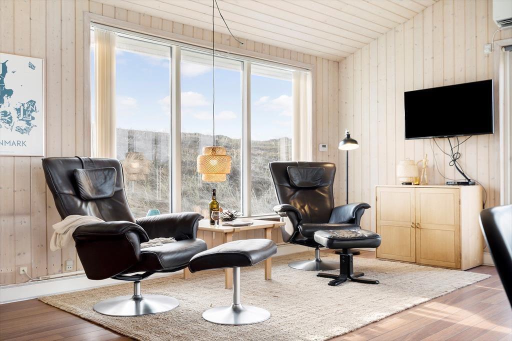 De smukke naturomgivelser indbyder til, at I tager dagene med ro og bare nyder ferien på tilbagelænet vis. Sommerhusets indretning lægger bestemt også op til et komfortabelt driverliv, for det er skønt at slappe af i husets to opholdsrum og på de tre soveværelser – ja, selv på det ene af de to badeværelser er der sauna, så her kan I også koble af og få varme i hele kroppen. Et veludstyret køkken ligger i åben forbindelse med den ene stue, der har brændeovn, loft til kip og et stort vinduesparti vendt ud mod klitterne. Også den anden stue er udstyret med store vinduer, så sol og natur bliver inviteret lige indenfor.