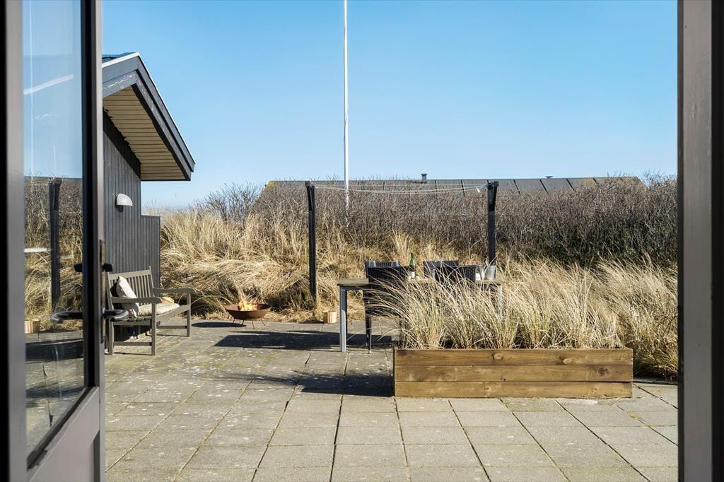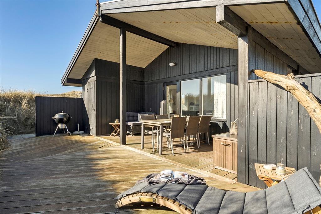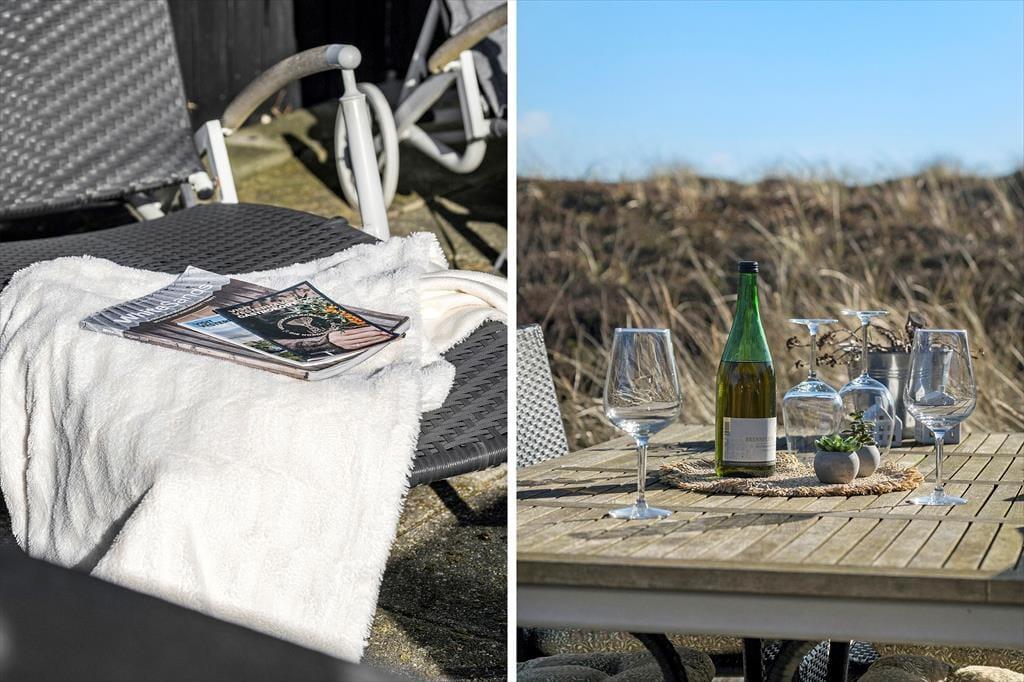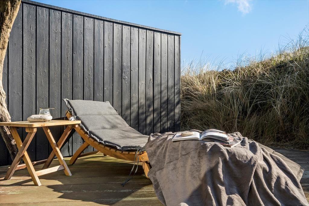 Udenfor kan du virkelig mærke feriestemningen. Den store, halv overdækkede terrasse er perfekt til lange måltider i godt selskab, hvor I kan nyde den friske luft. Har du lyst til at solbade, er der masser af plads til at slappe af på de liggestole, som står klar til dig. Med terrassen vendt mod sydøst kan du nyde solen hele dagen, mens en let brise fra havet skaber den perfekte stemning. Efter en dag på stranden er det en fornøjelse at lade kroppen slappe af i saunaen eller nyde en grillmiddag under åben himmel. Og husk, du kan tage hunden med på turen, så den kan løbe frit på terrassen, mens du slapper af.