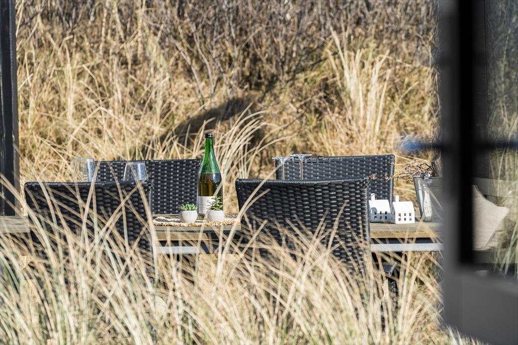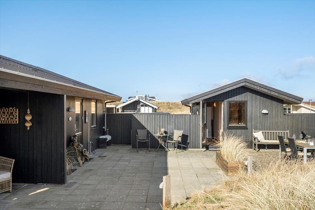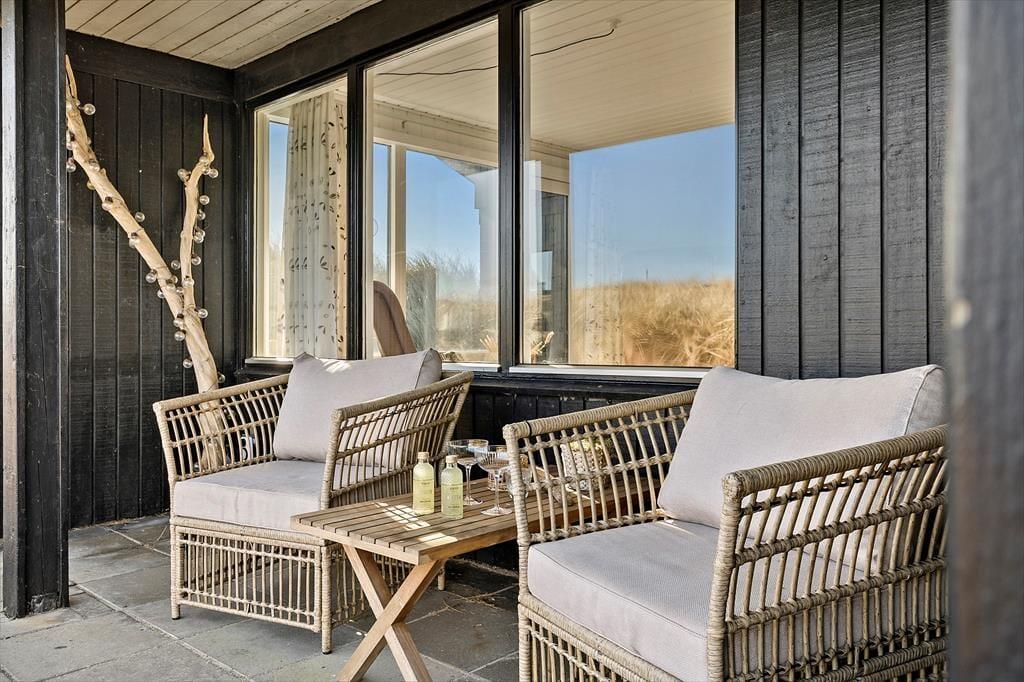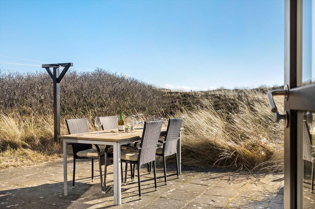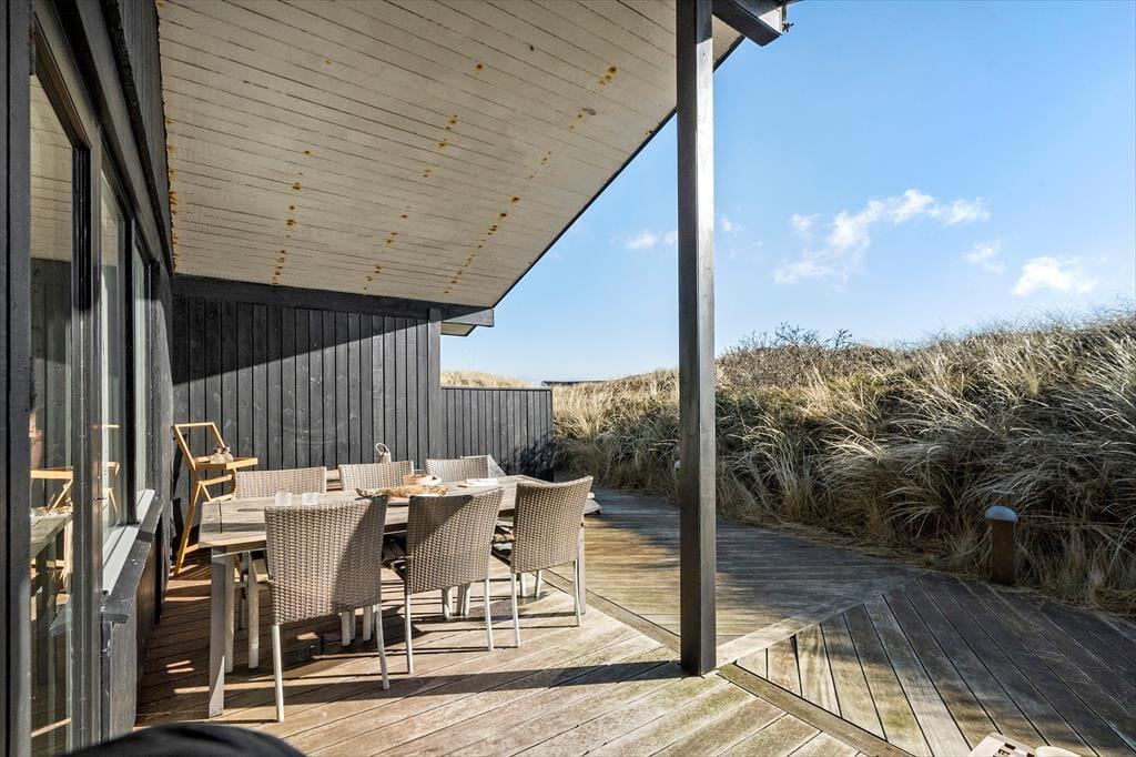 Udenfor kan du virkelig mærke feriestemningen. Den store, halv overdækkede terrasse er perfekt til lange måltider i godt selskab, hvor I kan nyde den friske luft. Har du lyst til at solbade, er der masser af plads til at slappe af på de liggestole, som står klar til dig. Med terrassen vendt mod sydøst kan du nyde solen hele dagen, mens en let brise fra havet skaber den perfekte stemning. Efter en dag på stranden er det en fornøjelse at lade kroppen slappe af i saunaen eller nyde en grillmiddag under åben himmel. Og husk, du kan tage hunden med på turen, så den kan løbe frit på terrassen, mens du slapper af.