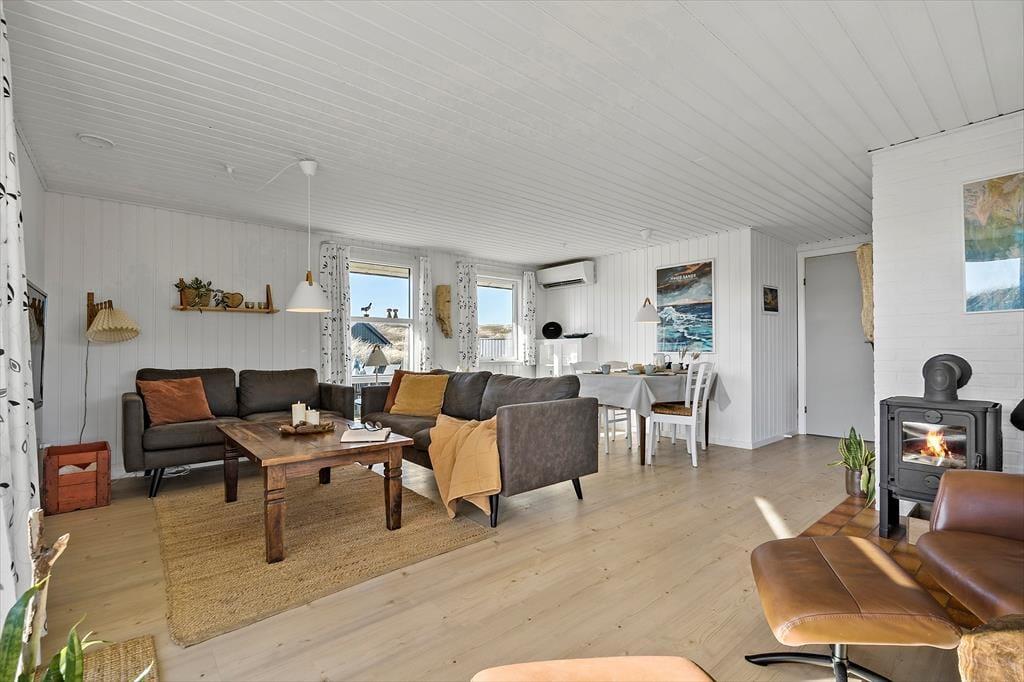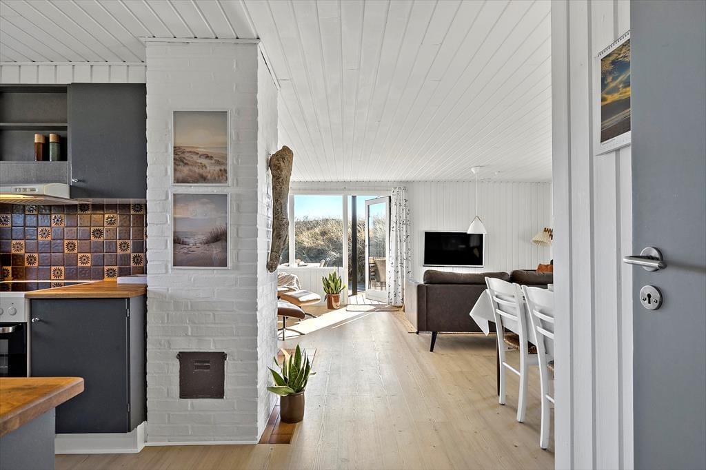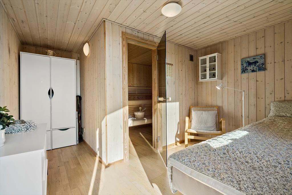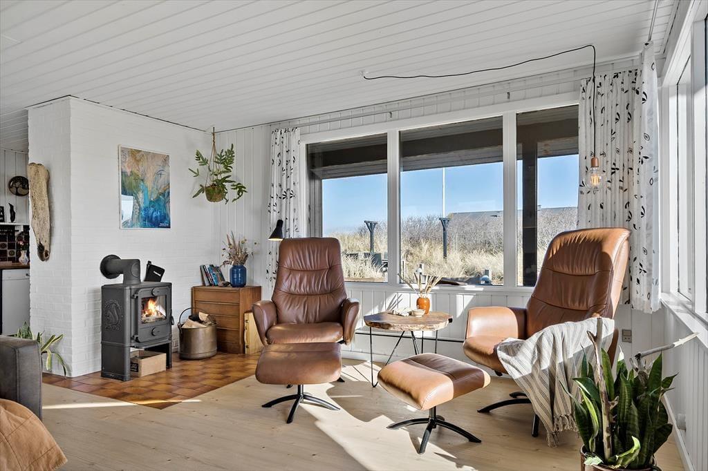 Indendørs byder sommerhuset på en varm og indbydende atmosfære. I den åbne opholdsafdeling, hvor køkken og stue smelter sammen, kan du nyde hyggelige stunder med dem, du holder af. Her knitrer brændeovnen i baggrunden, og du kan næsten mærke varmen sprede sig, mens du slapper af med en god bog eller ser en film. De lyse farver og den enkle indretning gør, at du hurtigt føler dig hjemme i dette sommerhus, hvor der er plads til at trække sig tilbage, men også mulighed for at være sammen. For ekstra luksus kan du forkæle dig selv med et afslappende ophold i saunaen i det lille anneks, som giver en dejlig varme på kølige dage.
