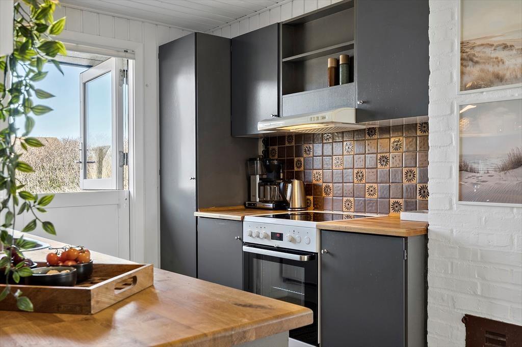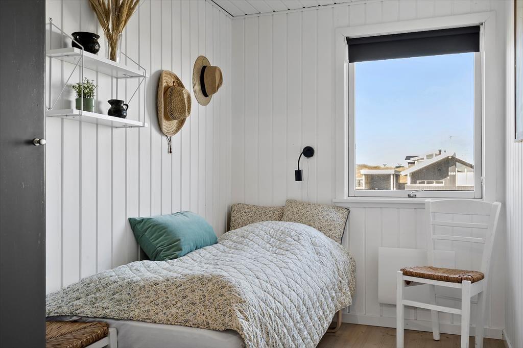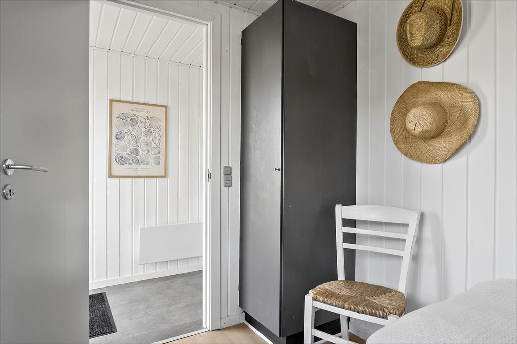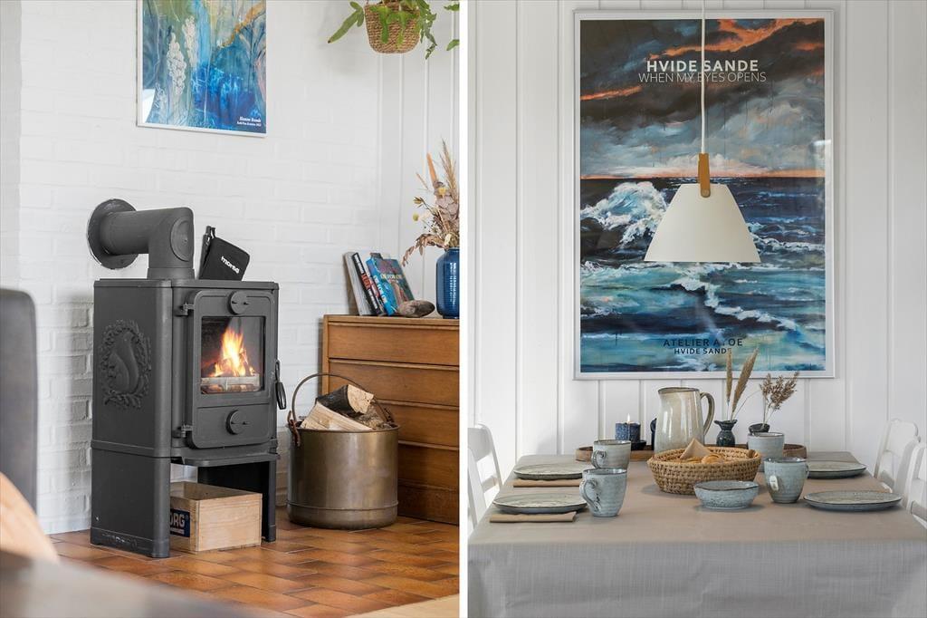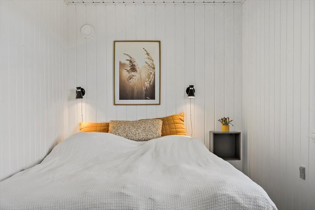 Indendørs byder sommerhuset på en varm og indbydende atmosfære. I den åbne opholdsafdeling, hvor køkken og stue smelter sammen, kan du nyde hyggelige stunder med dem, du holder af. Her knitrer brændeovnen i baggrunden, og du kan næsten mærke varmen sprede sig, mens du slapper af med en god bog eller ser en film. De lyse farver og den enkle indretning gør, at du hurtigt føler dig hjemme i dette sommerhus, hvor der er plads til at trække sig tilbage, men også mulighed for at være sammen. For ekstra luksus kan du forkæle dig selv med et afslappende ophold i saunaen i det lille anneks, som giver en dejlig varme på kølige dage.