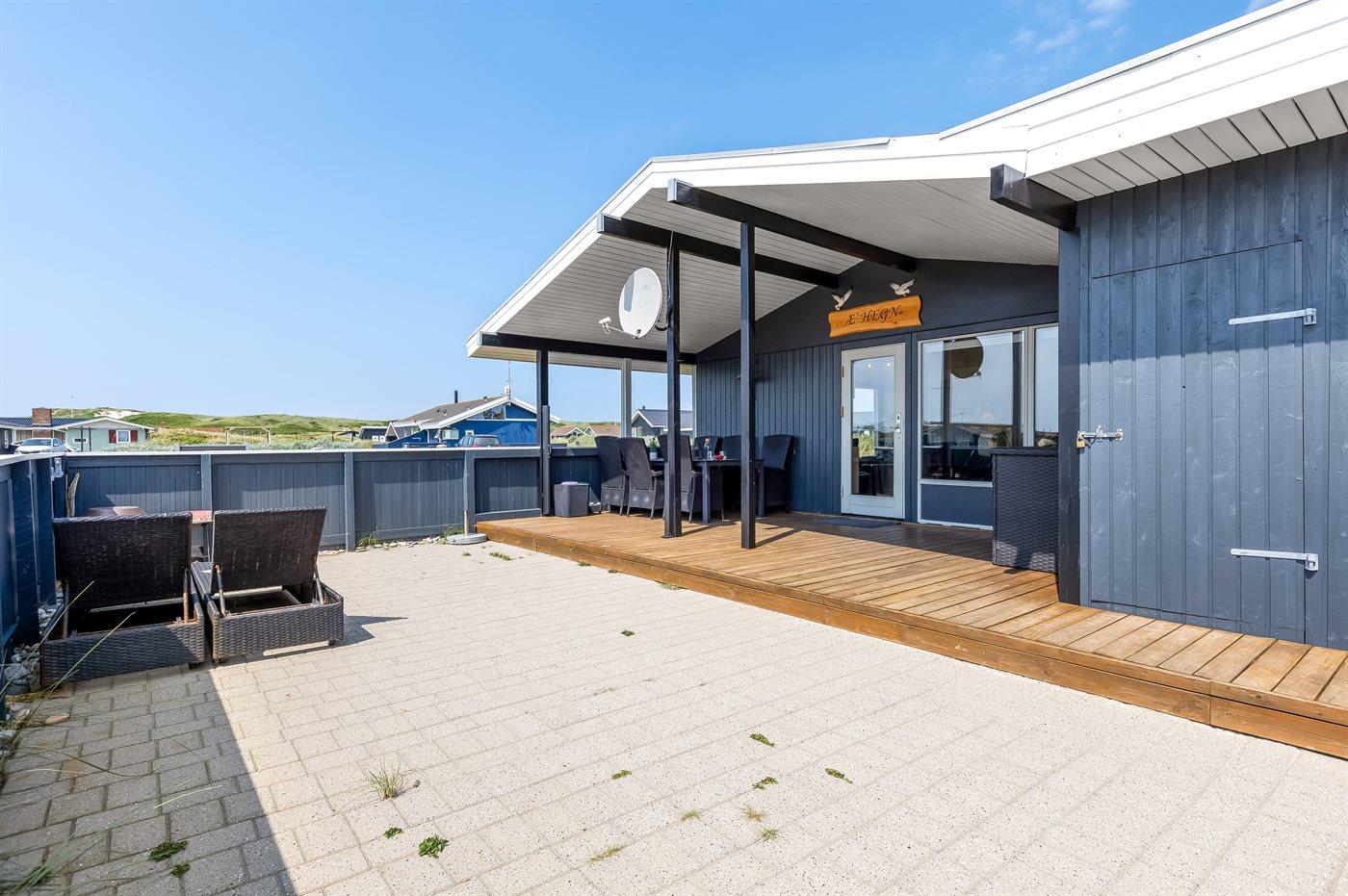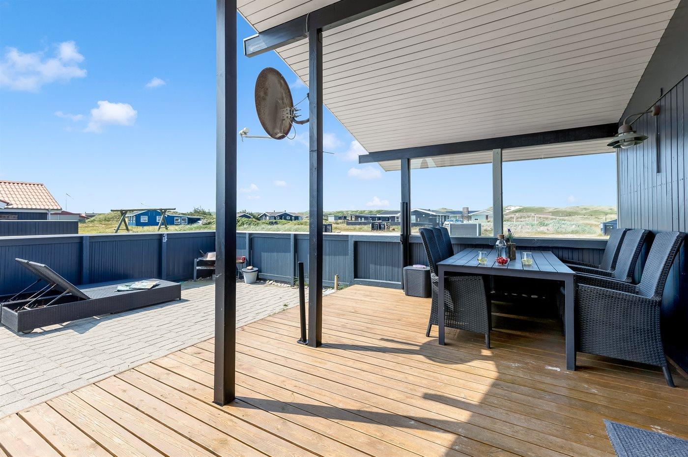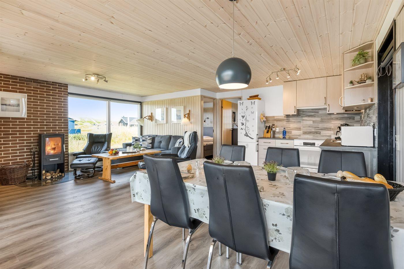 Når i sidder i det hyggelige og smukt indrettede køkken-alrum, har i den skønneste udsigt over det smukke klitlandskab, og når vejret er godt og i rykker ud på den store overdækkede og indhegnede terrasse…så rykker den fantastiske udsigt heldigvis med.