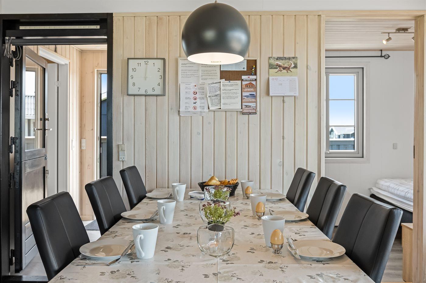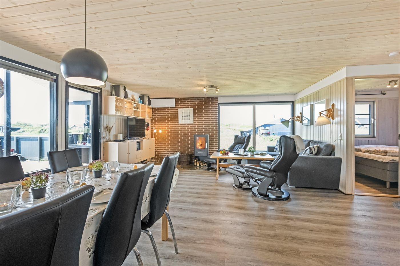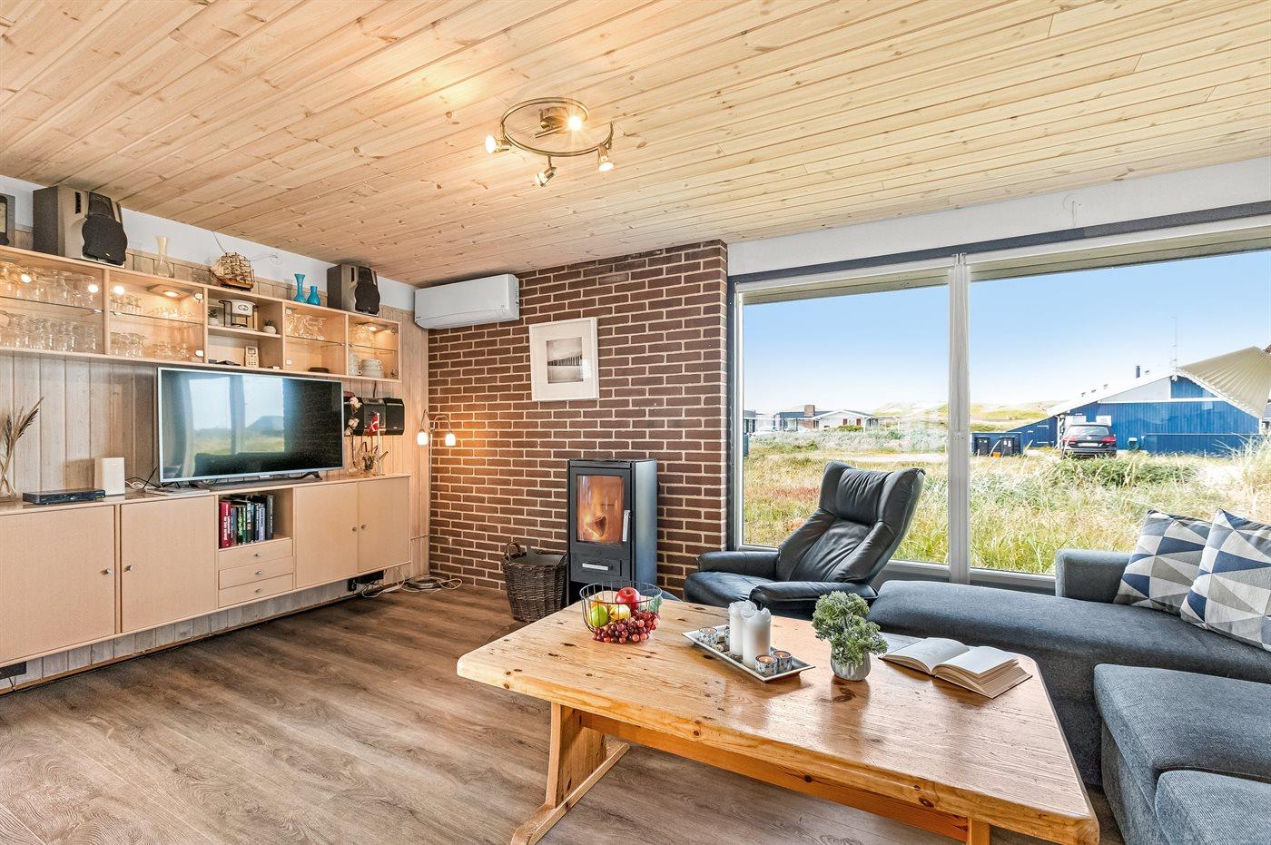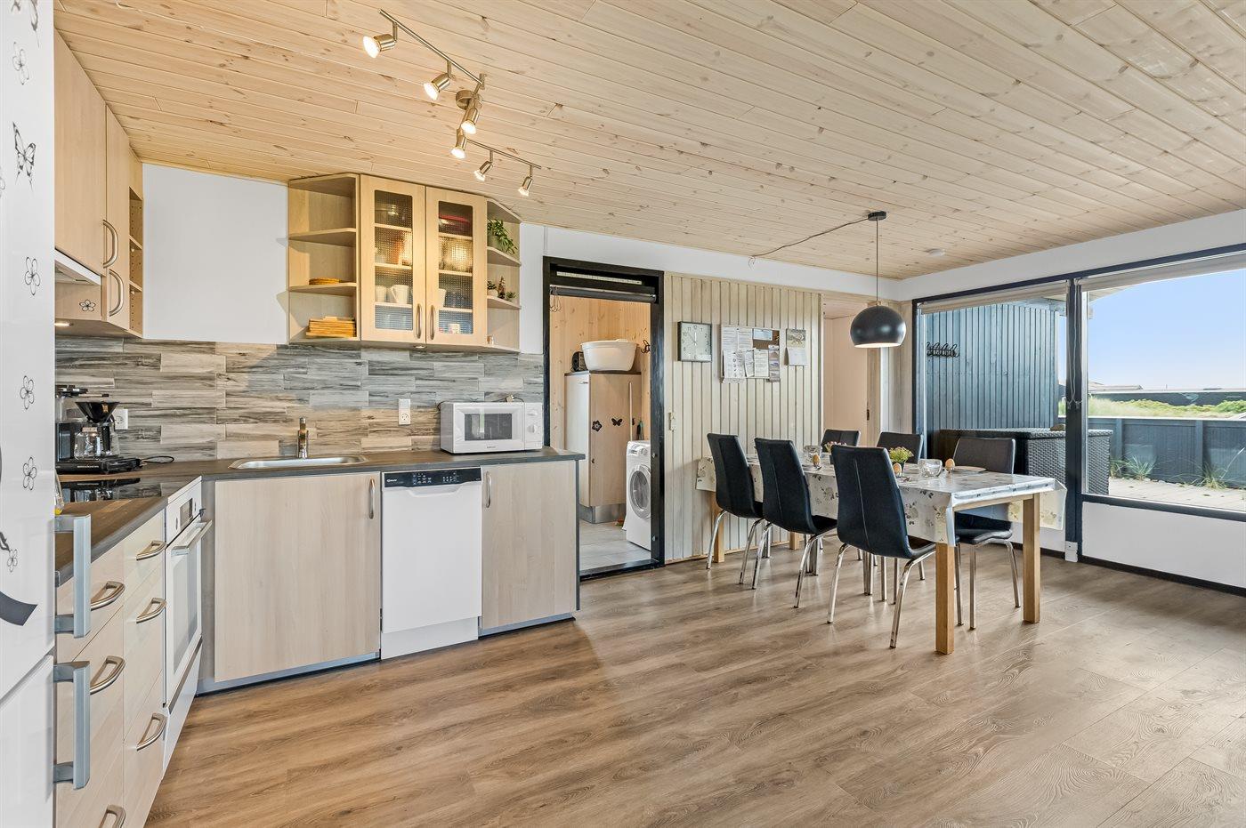 Når i sidder i det hyggelige og smukt indrettede køkken-alrum, har i den skønneste udsigt over det smukke klitlandskab, og når vejret er godt og i rykker ud på den store overdækkede og indhegnede terrasse…så rykker den fantastiske udsigt heldigvis med.