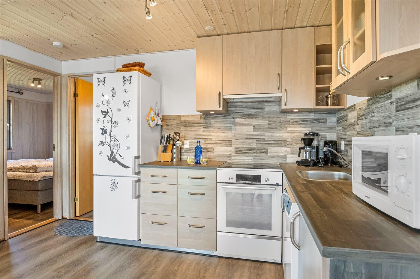 Køkkenet er udstyret med 1 køleskab. Der er 4 induktionskogeplader, varmluftovn, mikrobølgeovn, Airfryer samt opvaskemaskine.