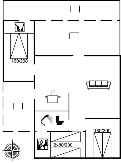Der er i alt 3 soveværelser. Sovepladserne fordeler sig på: 4 sovepladser i dobbeltsenge. 2 sovepladser i enkeltsenge.