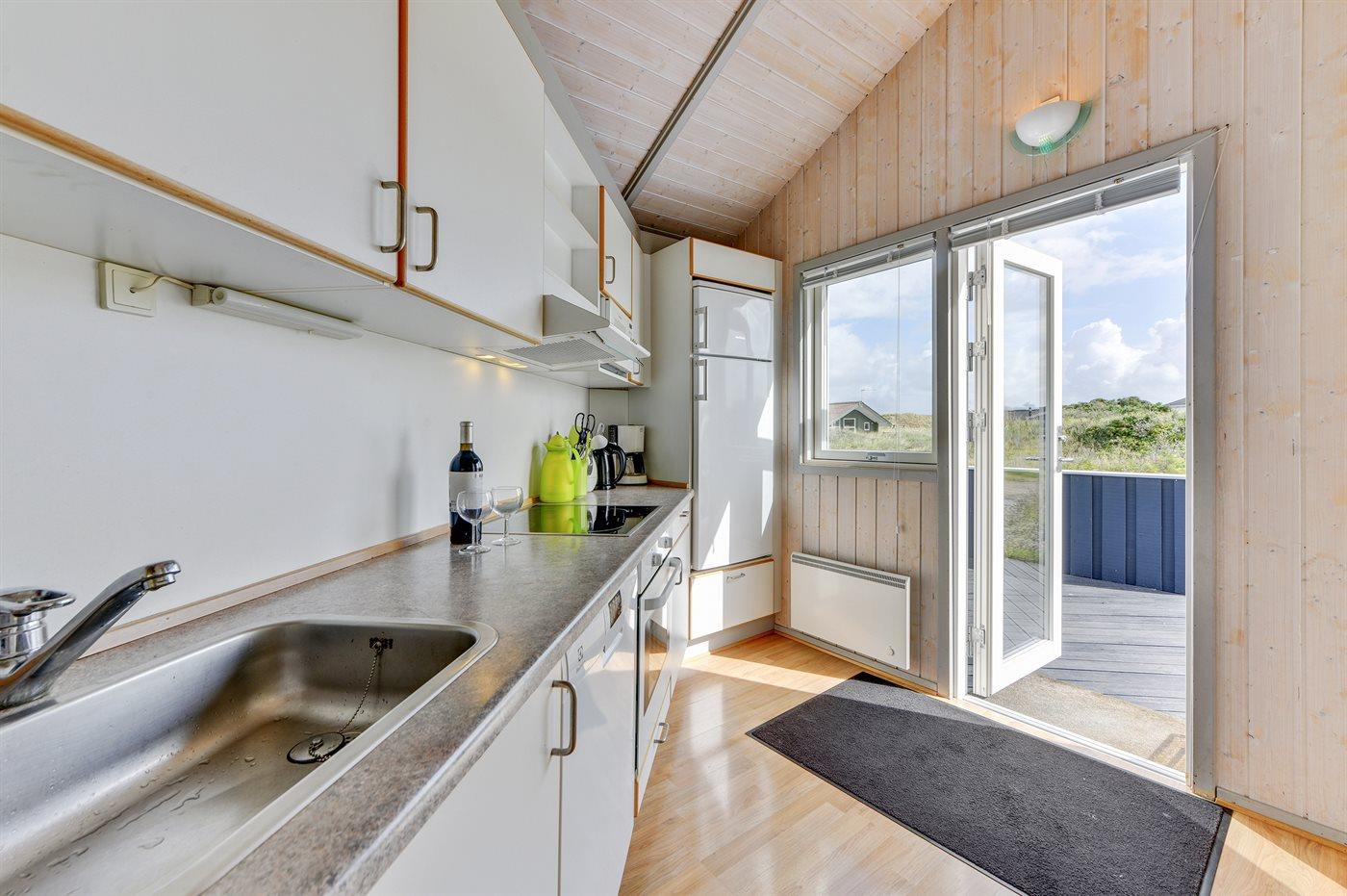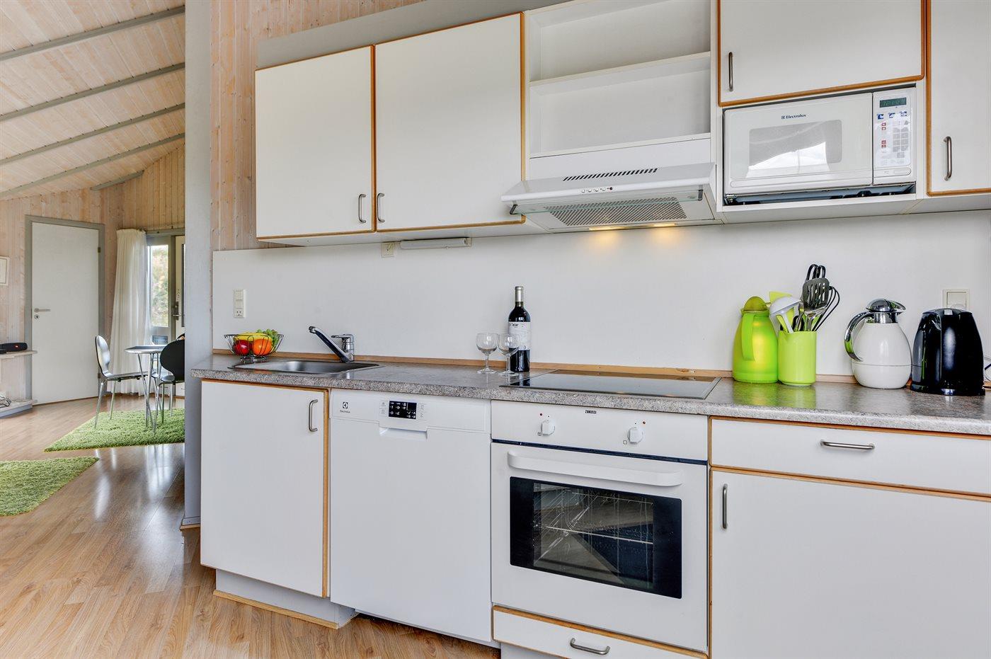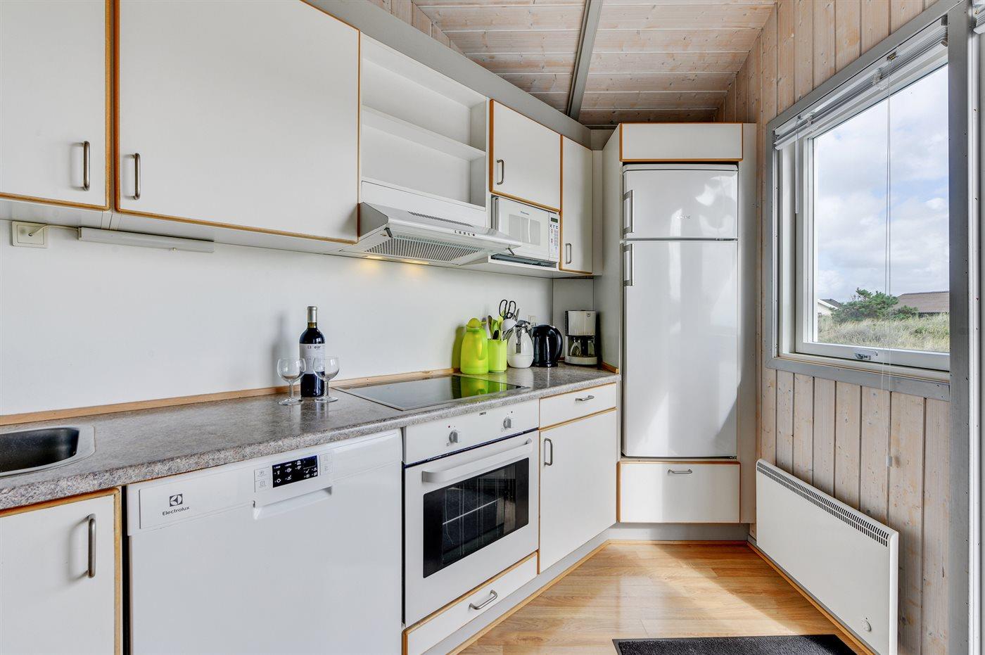 Køkkenet er udstyret med 1 køleskab. Der er 4 keramiske kogeplader, varmluftovn, mikrobølgeovn samt opvaskemaskine.