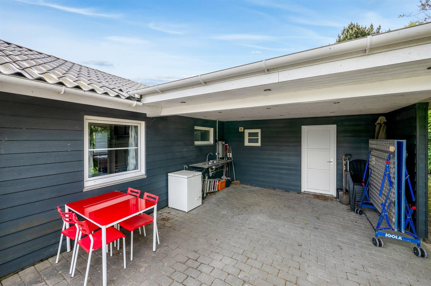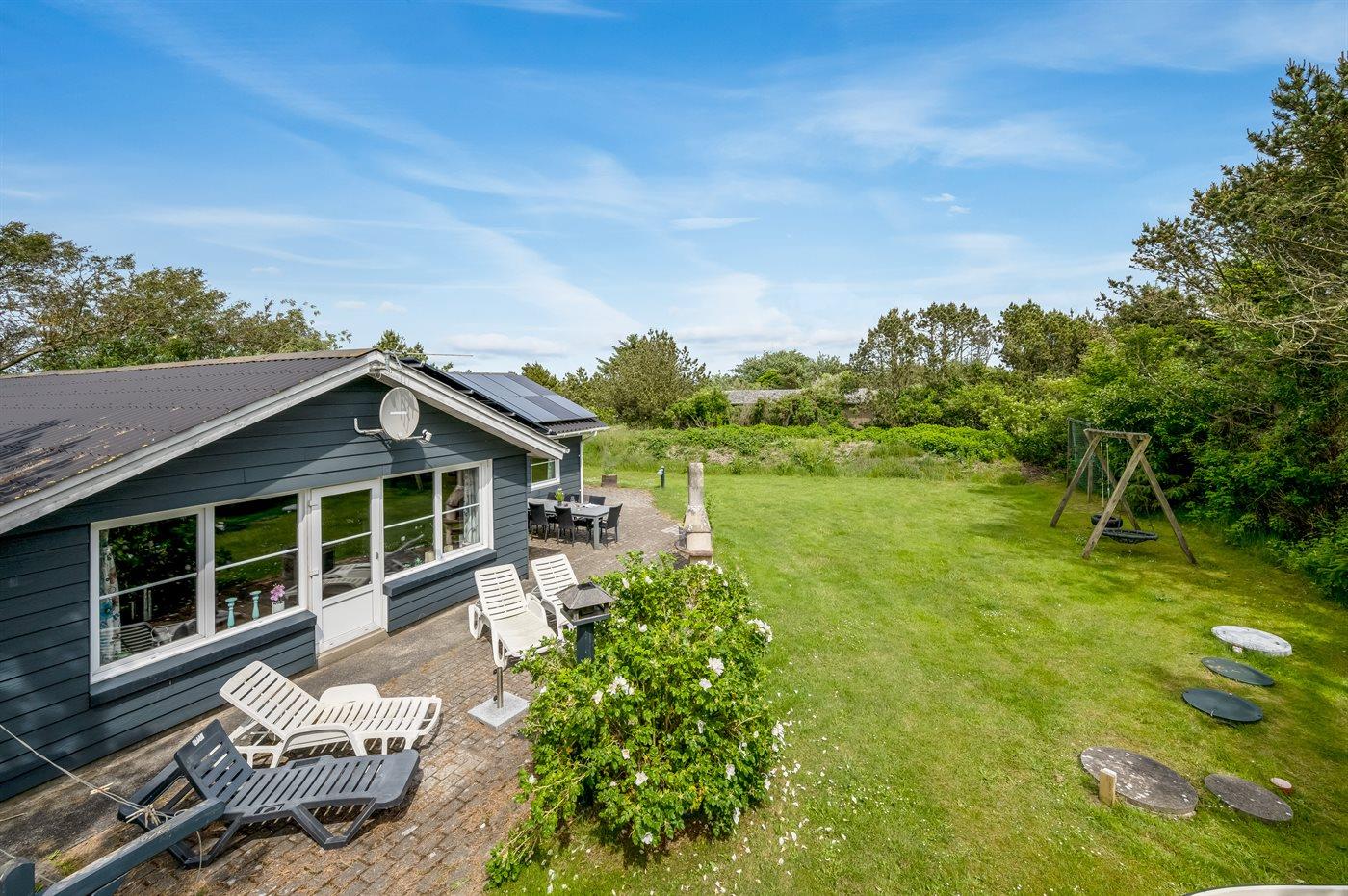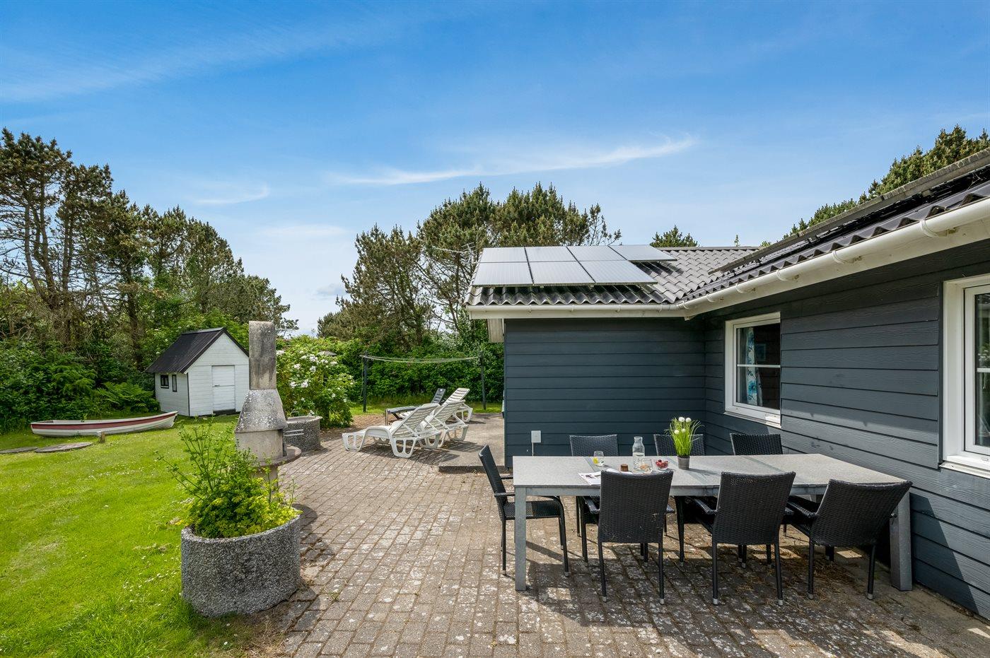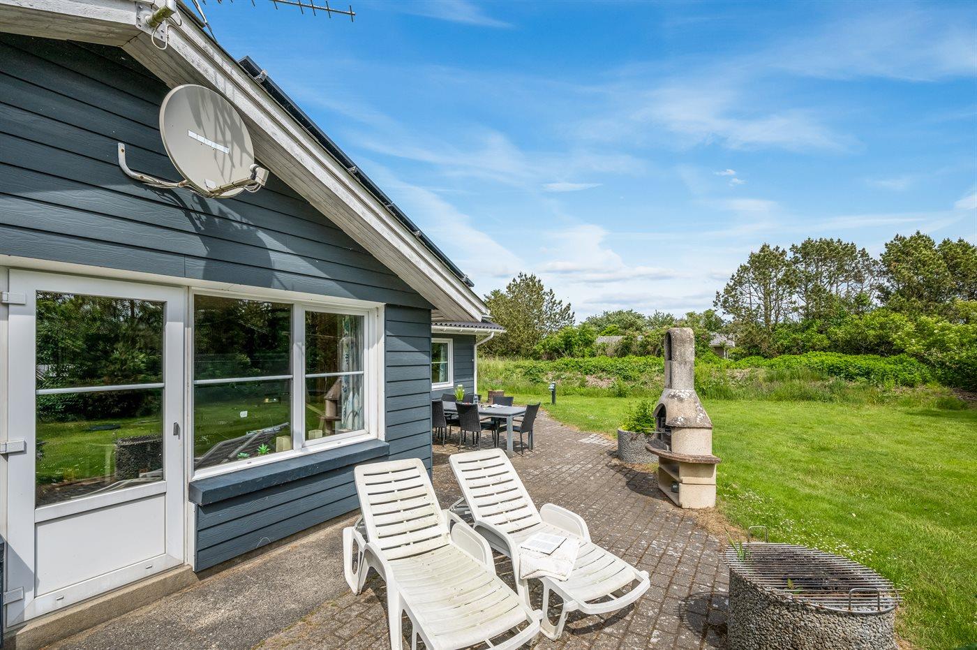 Ferieboligen er beliggende på en 1200 m² stor naturgrund. Der er 700 m til havet. Der er 1000 m til fjorden. Nærmeste forretning er beliggende i en afstand af 300 m. Der er en golfbane i en afstand af 20000 m. Til ferieboligen hører 100 m² terrasseareal. Gynge. Sandkasse. Legehus. Fodboldmål. Bålsted. På lune aftener sørger en udendørs pejs for hyggelig stemning. Der er ikke grill til rådighed. Der er mulighed for at tilberede maden udendørs i udekøkkenet. Der er carport til rådighed. Parkering ved ferieboligen.