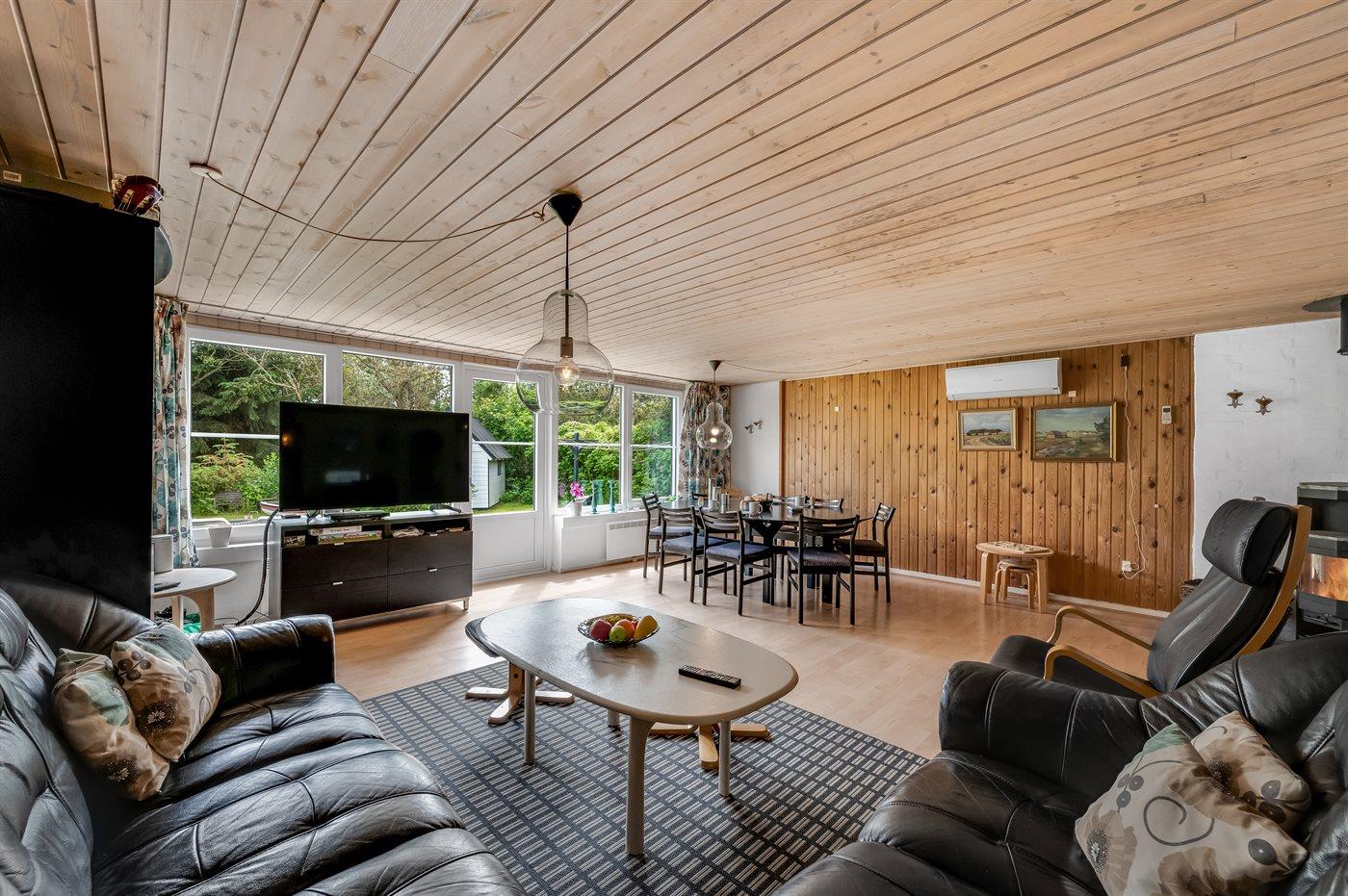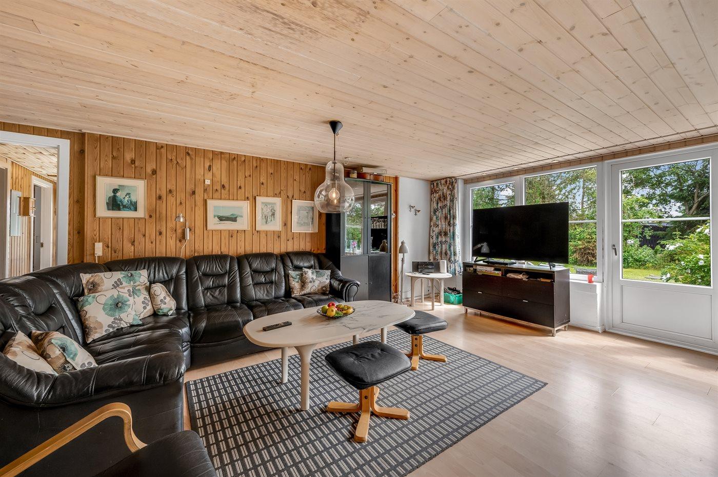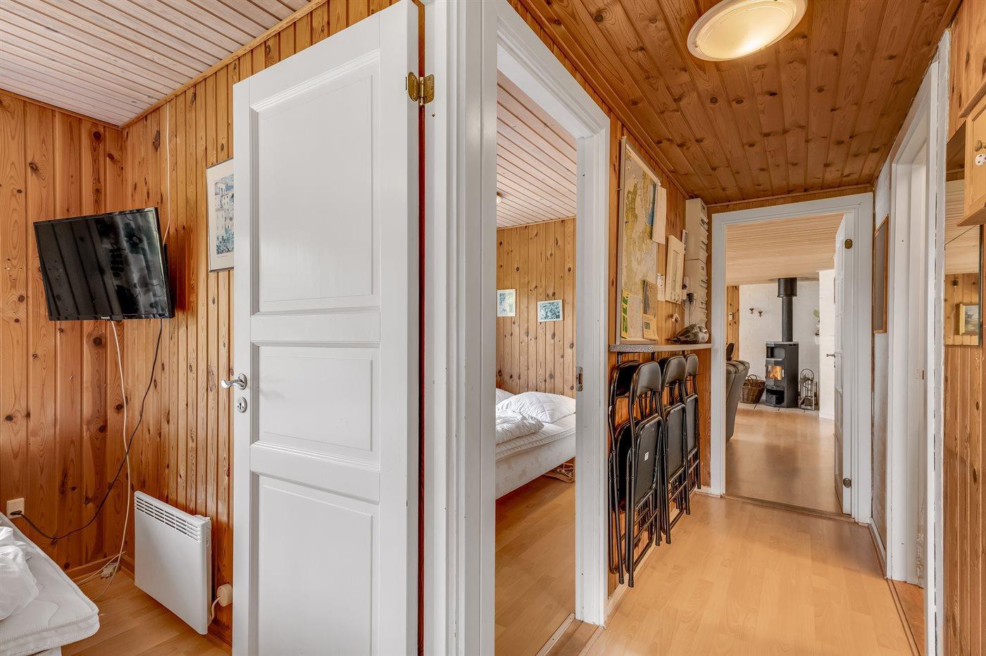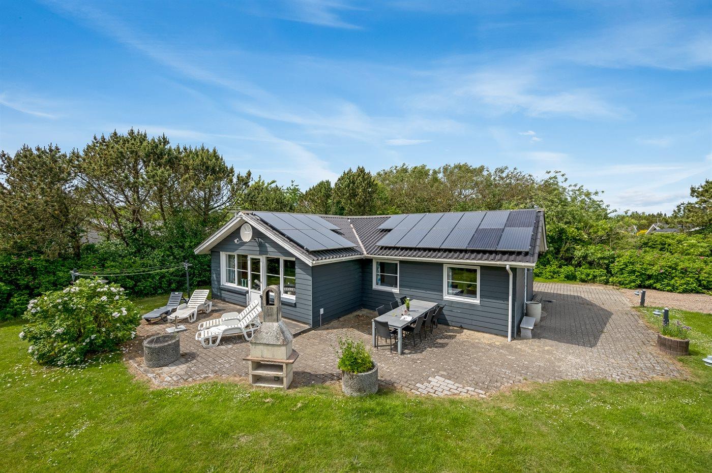 Ferieboligen er beliggende på en 1200 m² stor naturgrund. Der er 700 m til havet. Der er 1000 m til fjorden. Nærmeste forretning er beliggende i en afstand af 300 m. Der er en golfbane i en afstand af 20000 m. Til ferieboligen hører 100 m² terrasseareal. Gynge. Sandkasse. Legehus. Fodboldmål. Bålsted. På lune aftener sørger en udendørs pejs for hyggelig stemning. Der er ikke grill til rådighed. Der er mulighed for at tilberede maden udendørs i udekøkkenet. Der er carport til rådighed. Parkering ved ferieboligen.