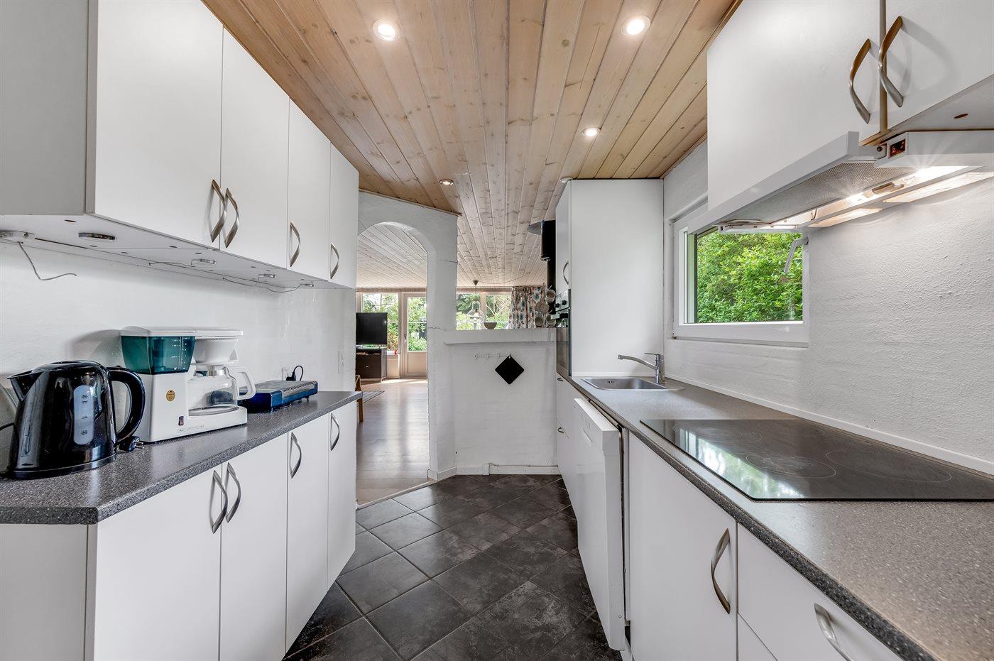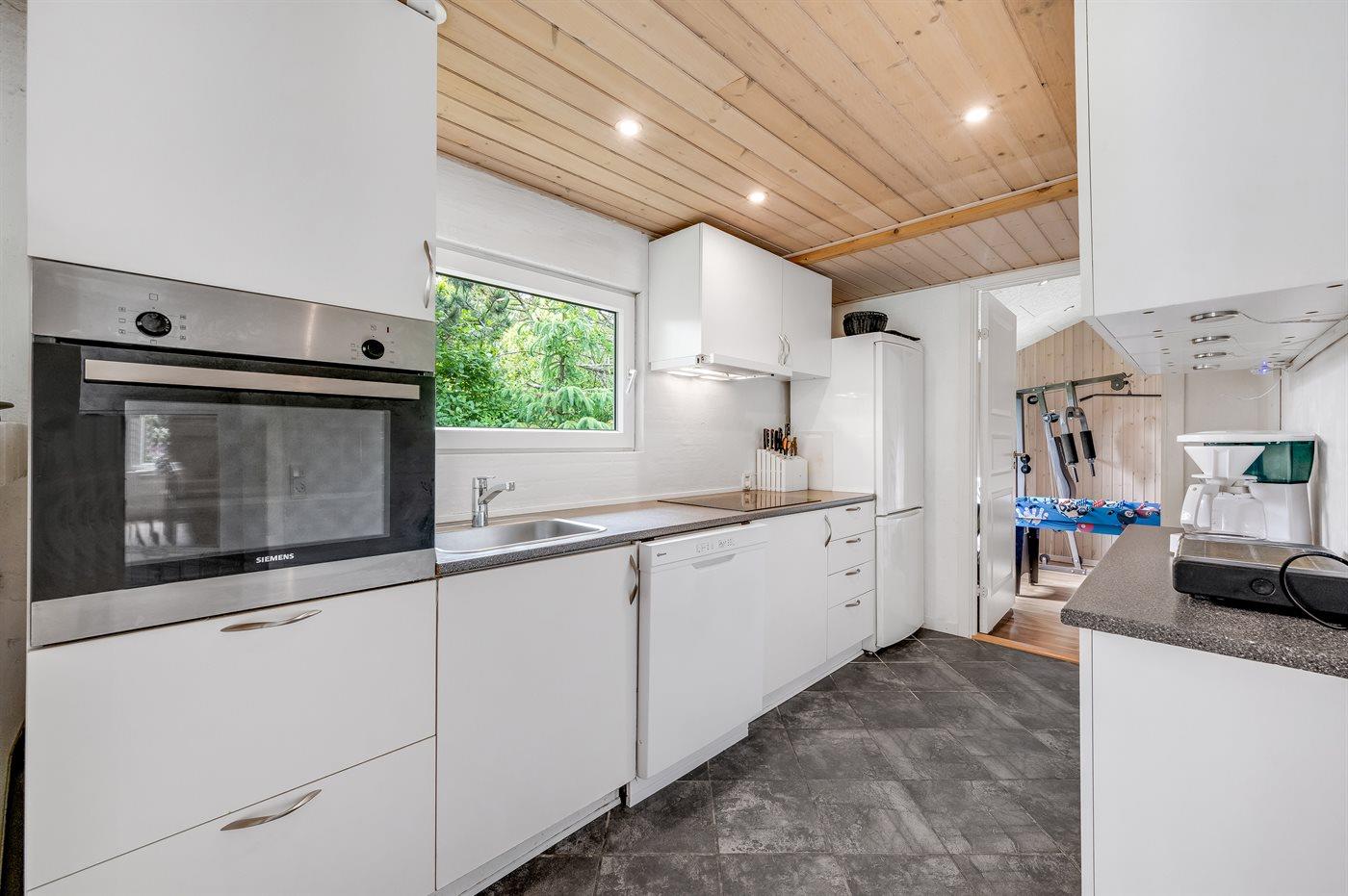 Køkkenet er udstyret med 1 køleskab. Der er 4 keramiske kogeplader, varmluftovn, mikrobølgeovn samt opvaskemaskine.
