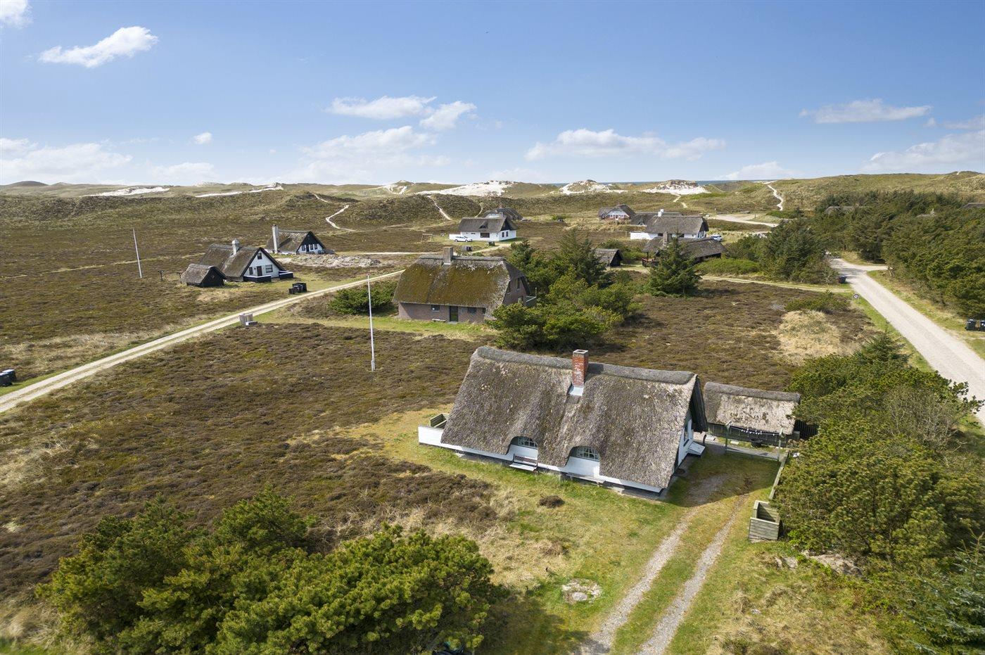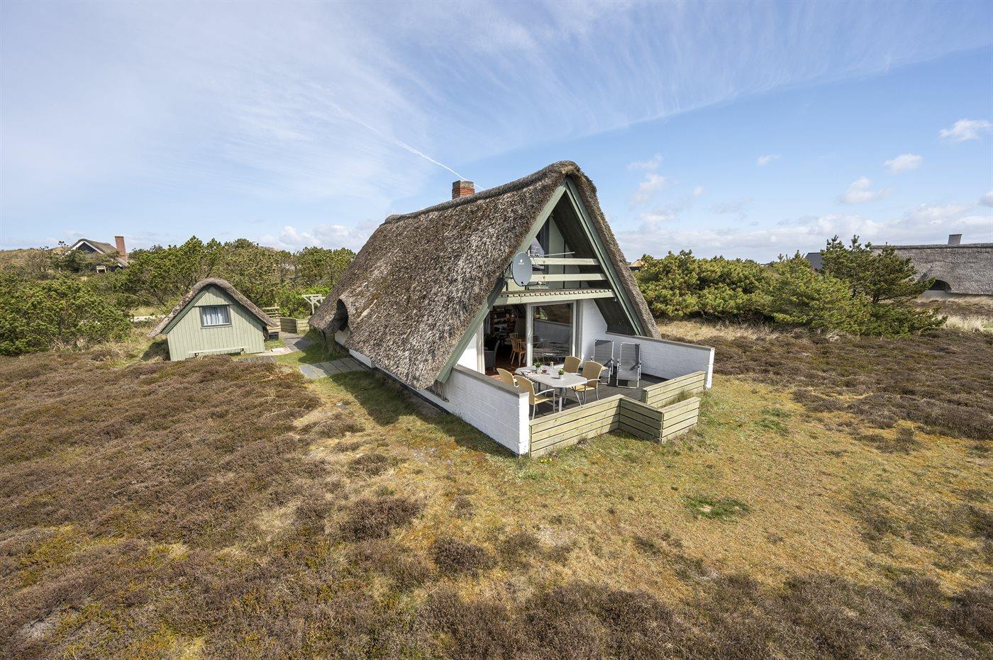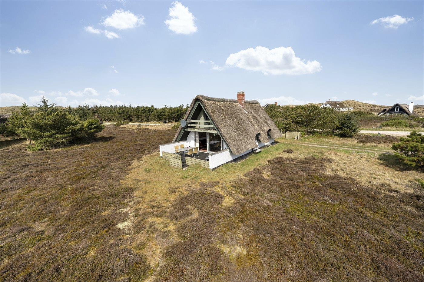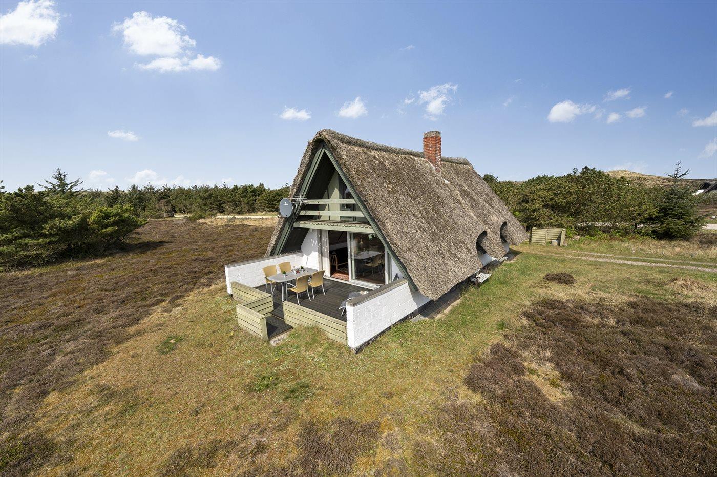 Hyggeligt 2-etagers sommerhus i sten med stråtag, bygget i 1972 og løbende renoveret, senest i 2011. Huset ligger på en naturgrund med skøn udsigt til dejligt lynglandskab - kun 500 m fra den dejlige sandstrand. Til huset hører åben terrasse med havemøbler. Det funktionelle køkken, med bl.a. opvaskemaskine, komfur med keramiske kogeplader og køleskab med separat fryser, er kombineret med stuen, som bl.a. indeholder brændeovn, DVD-afspiller og TV med parabol (digital). Badeværelse med gulvvarme og bruser. Via en vindeltrappe finder I soveværelserne på 1. sal.; 1 med dobbeltseng og 1 med 3 enkeltsenge. Af yderligere udstyr kan gratis, trådløs internetforbindelse (computer skal medbringes), vaskemaskine, barneseng og høj barnestol nævnes. Sandkasse og gynge på grunden.
