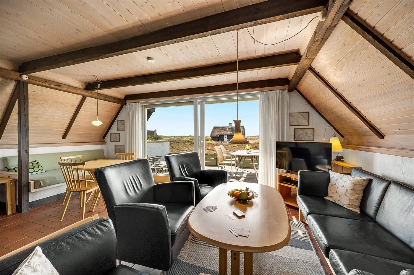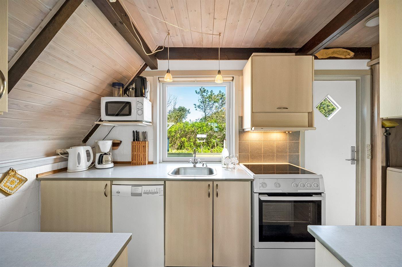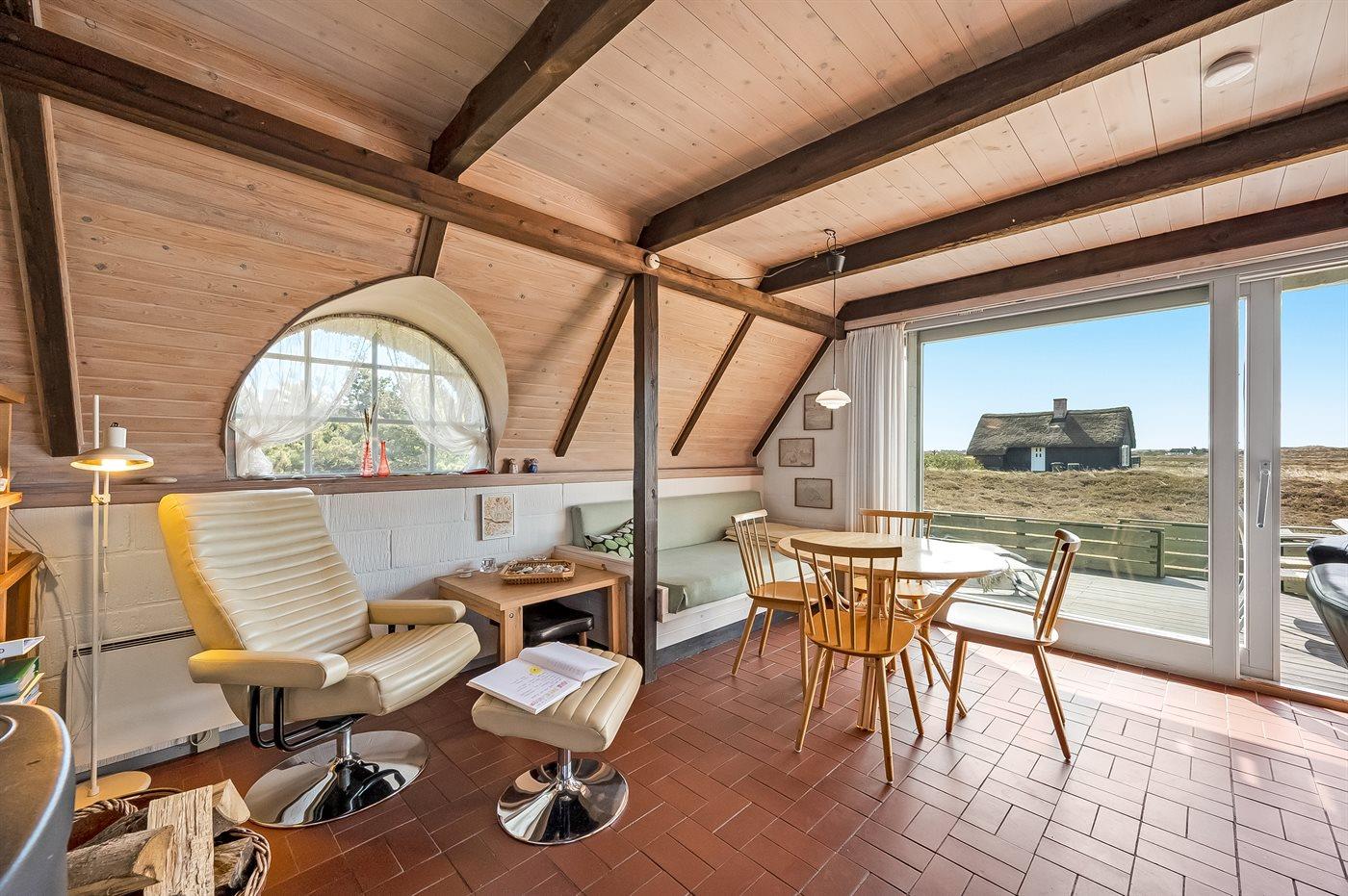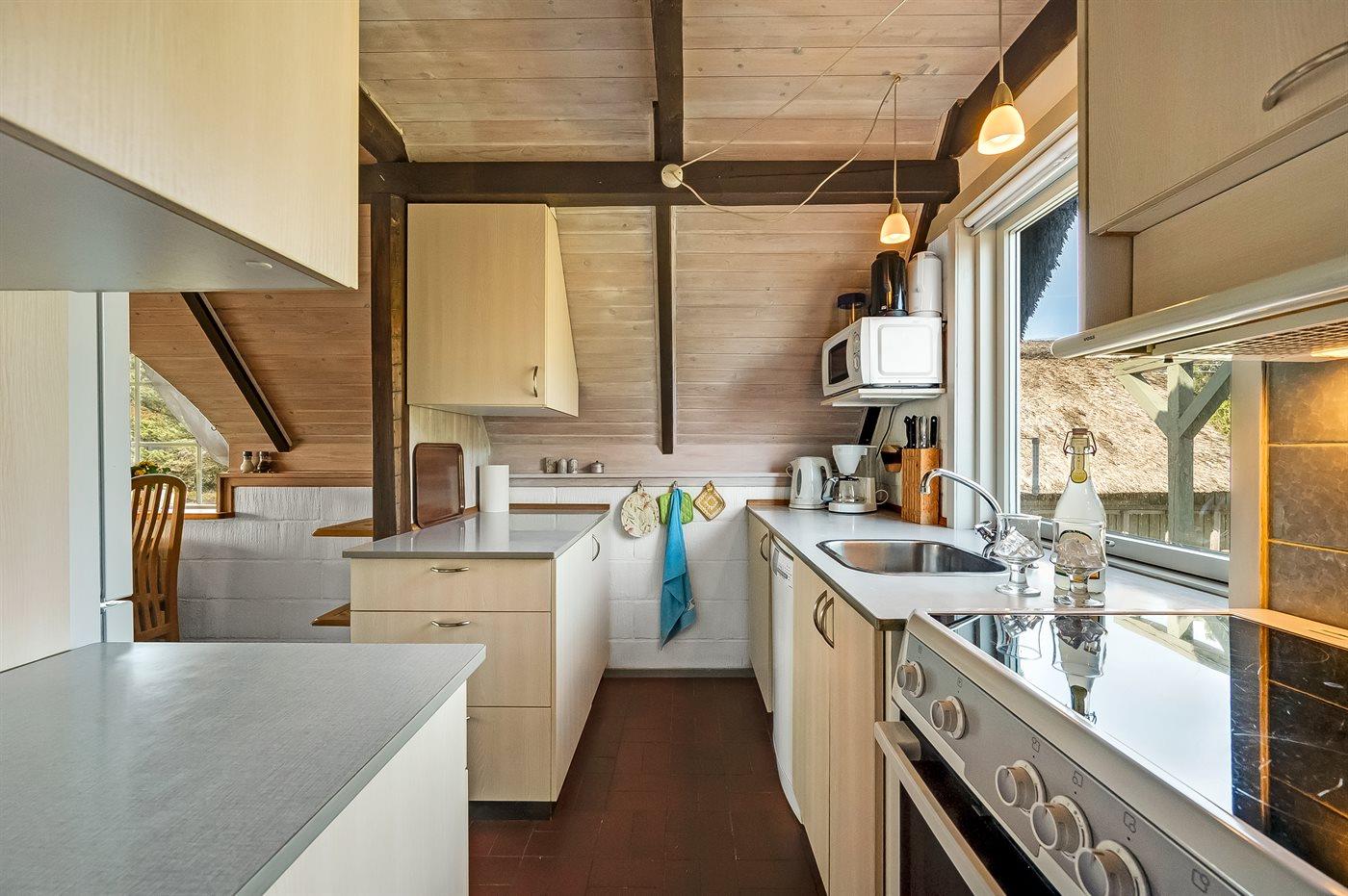 Hyggeligt 2-etagers sommerhus i sten med stråtag, bygget i 1972 og løbende renoveret, senest i 2011. Huset ligger på en naturgrund med skøn udsigt til dejligt lynglandskab - kun 500 m fra den dejlige sandstrand. Til huset hører åben terrasse med havemøbler. Det funktionelle køkken, med bl.a. opvaskemaskine, komfur med keramiske kogeplader og køleskab med separat fryser, er kombineret med stuen, som bl.a. indeholder brændeovn, DVD-afspiller og TV med parabol (digital). Badeværelse med gulvvarme og bruser. Via en vindeltrappe finder I soveværelserne på 1. sal.; 1 med dobbeltseng og 1 med 3 enkeltsenge. Af yderligere udstyr kan gratis, trådløs internetforbindelse (computer skal medbringes), vaskemaskine, barneseng og høj barnestol nævnes. Sandkasse og gynge på grunden.