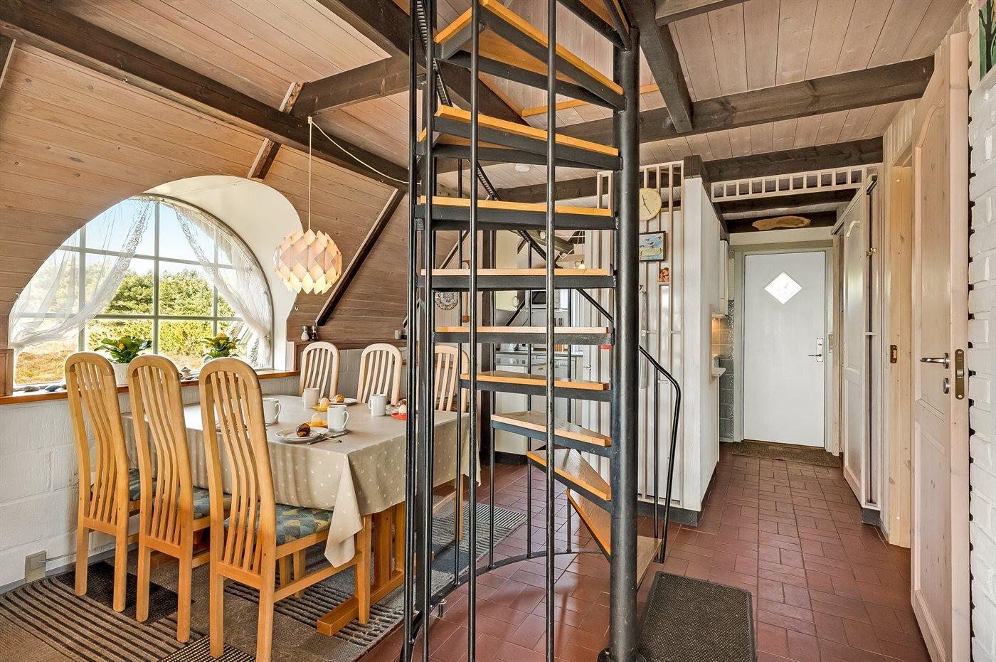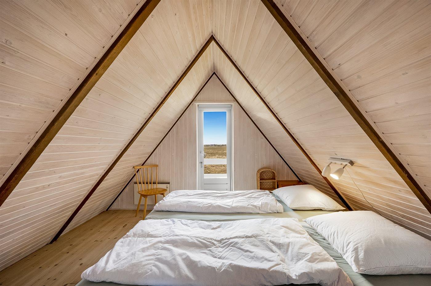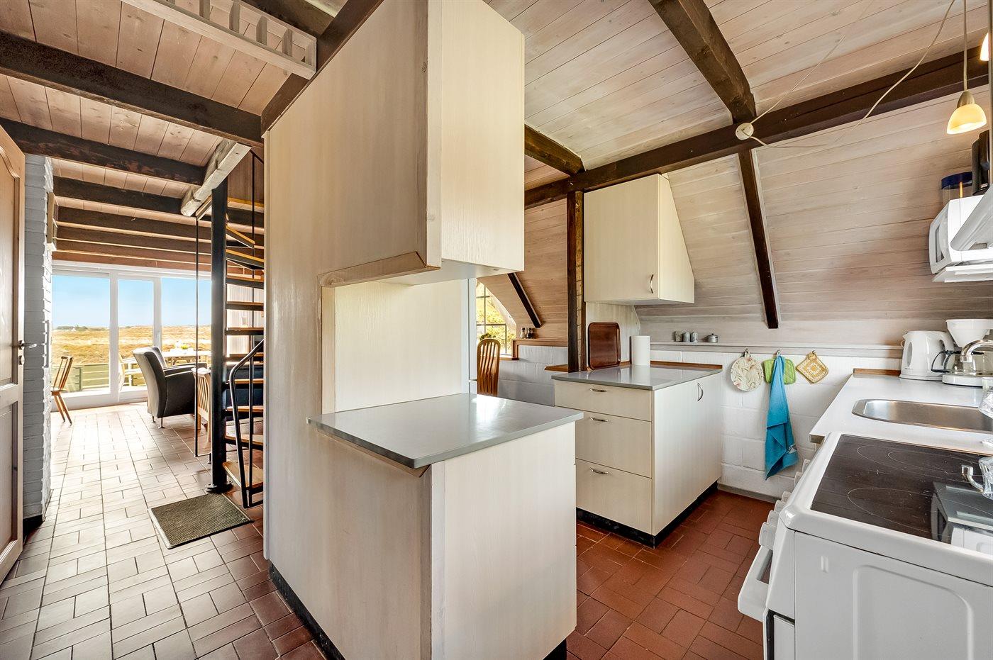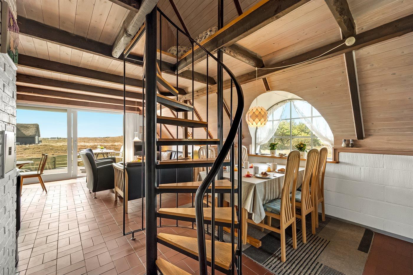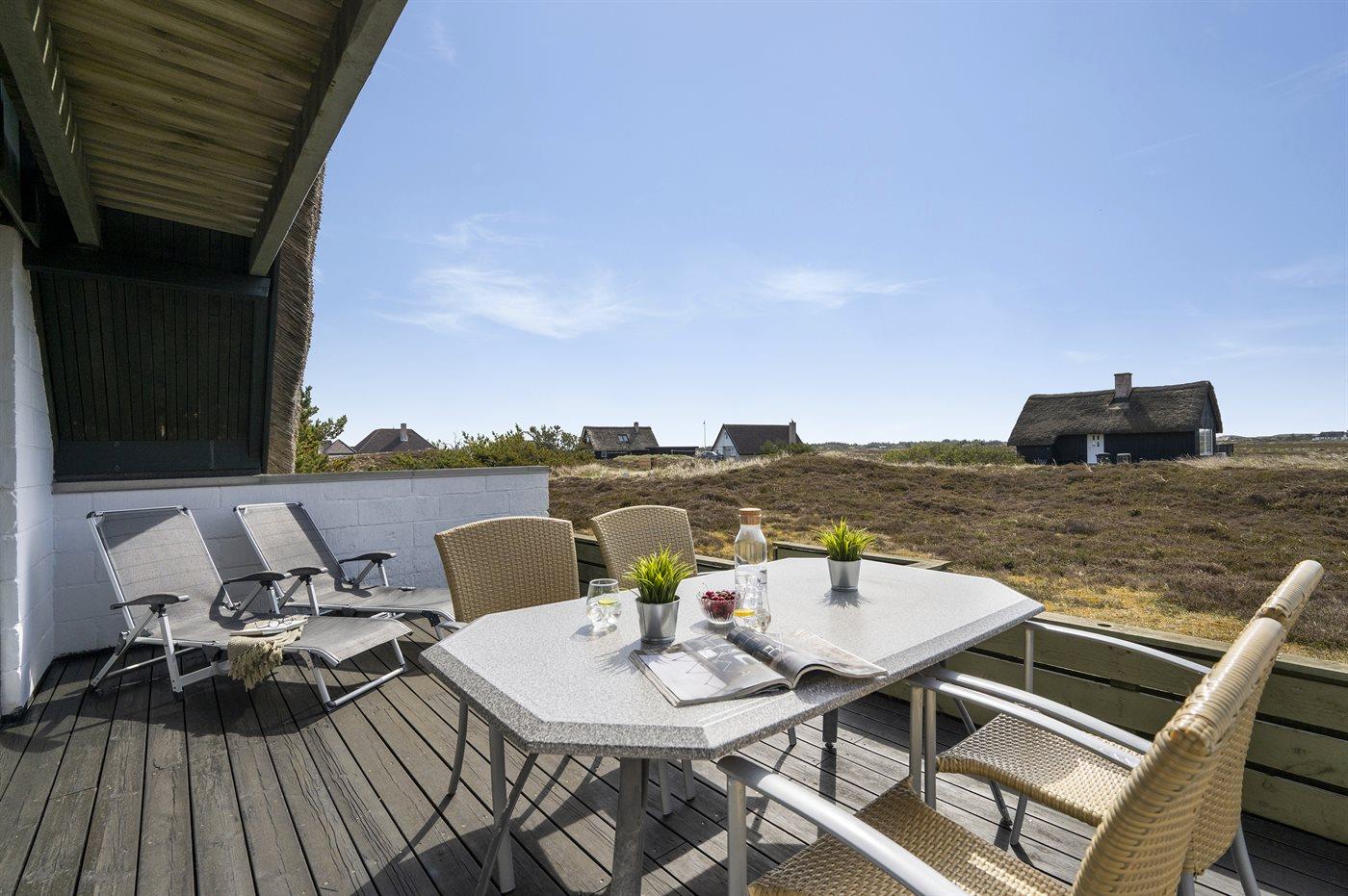Hyggeligt 2-etagers sommerhus i sten med stråtag, bygget i 1972 og løbende renoveret, senest i 2011. Huset ligger på en naturgrund med skøn udsigt til dejligt lynglandskab - kun 500 m fra den dejlige sandstrand. Til huset hører åben terrasse med havemøbler. Det funktionelle køkken, med bl.a. opvaskemaskine, komfur med keramiske kogeplader og køleskab med separat fryser, er kombineret med stuen, som bl.a. indeholder brændeovn, DVD-afspiller og TV med parabol (digital). Badeværelse med gulvvarme og bruser. Via en vindeltrappe finder I soveværelserne på 1. sal.; 1 med dobbeltseng og 1 med 3 enkeltsenge. Af yderligere udstyr kan gratis, trådløs internetforbindelse (computer skal medbringes), vaskemaskine, barneseng og høj barnestol nævnes. Sandkasse og gynge på grunden.
