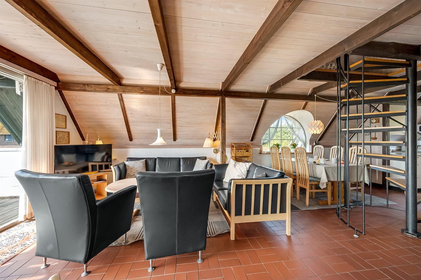 Hyggeligt 2-etagers sommerhus med stråtag nær sandstrand og lynglandskab, perfekt til afslapning i naturskønne omgivelser.