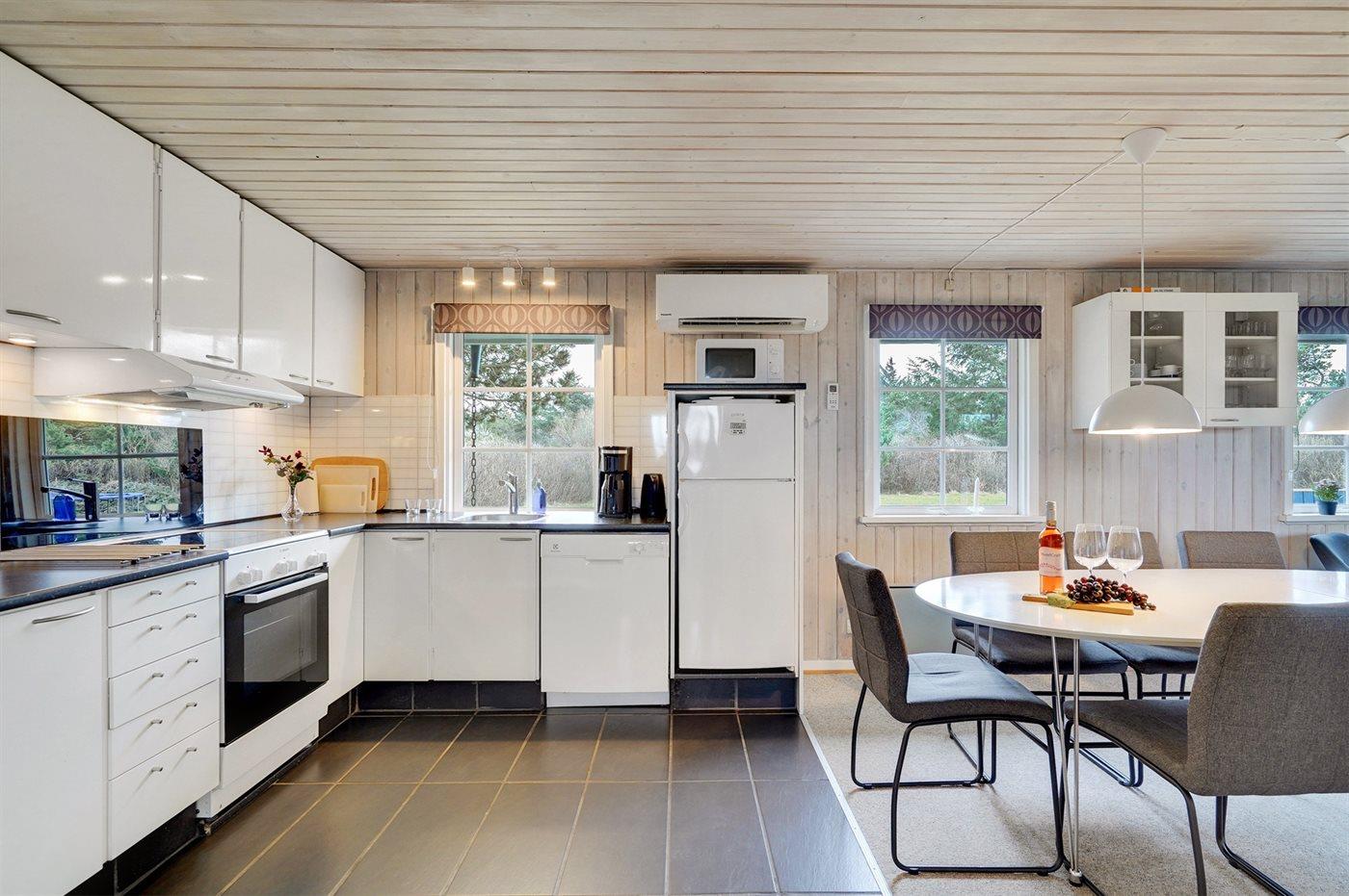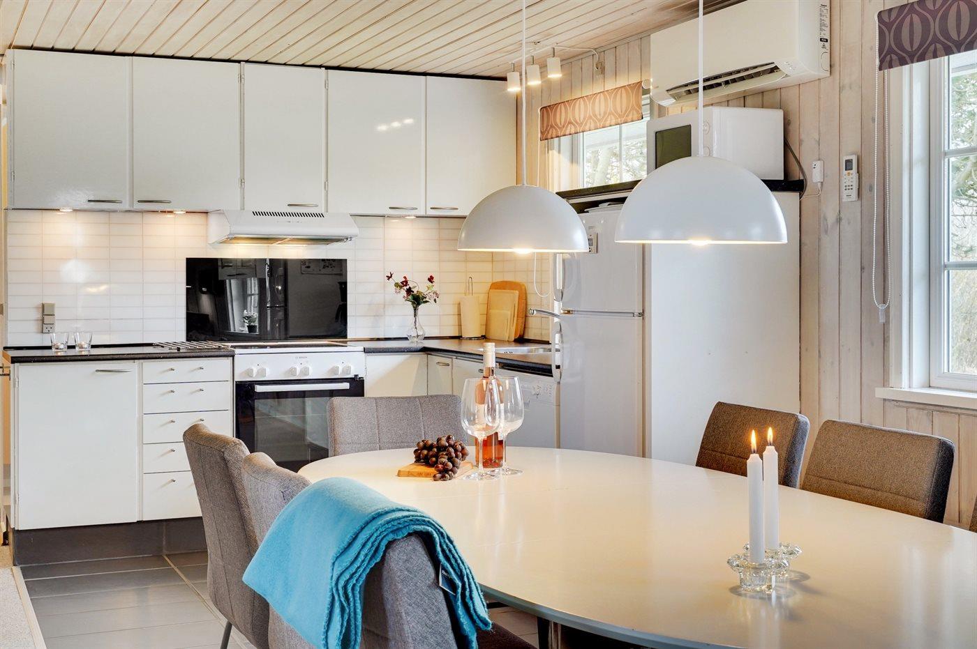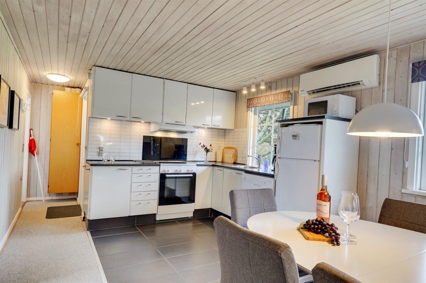 Køkkenet er udstyret med 1 køleskab. Der er 4 keramiske kogeplader, bageovn, mikrobølgeovn samt opvaskemaskine.