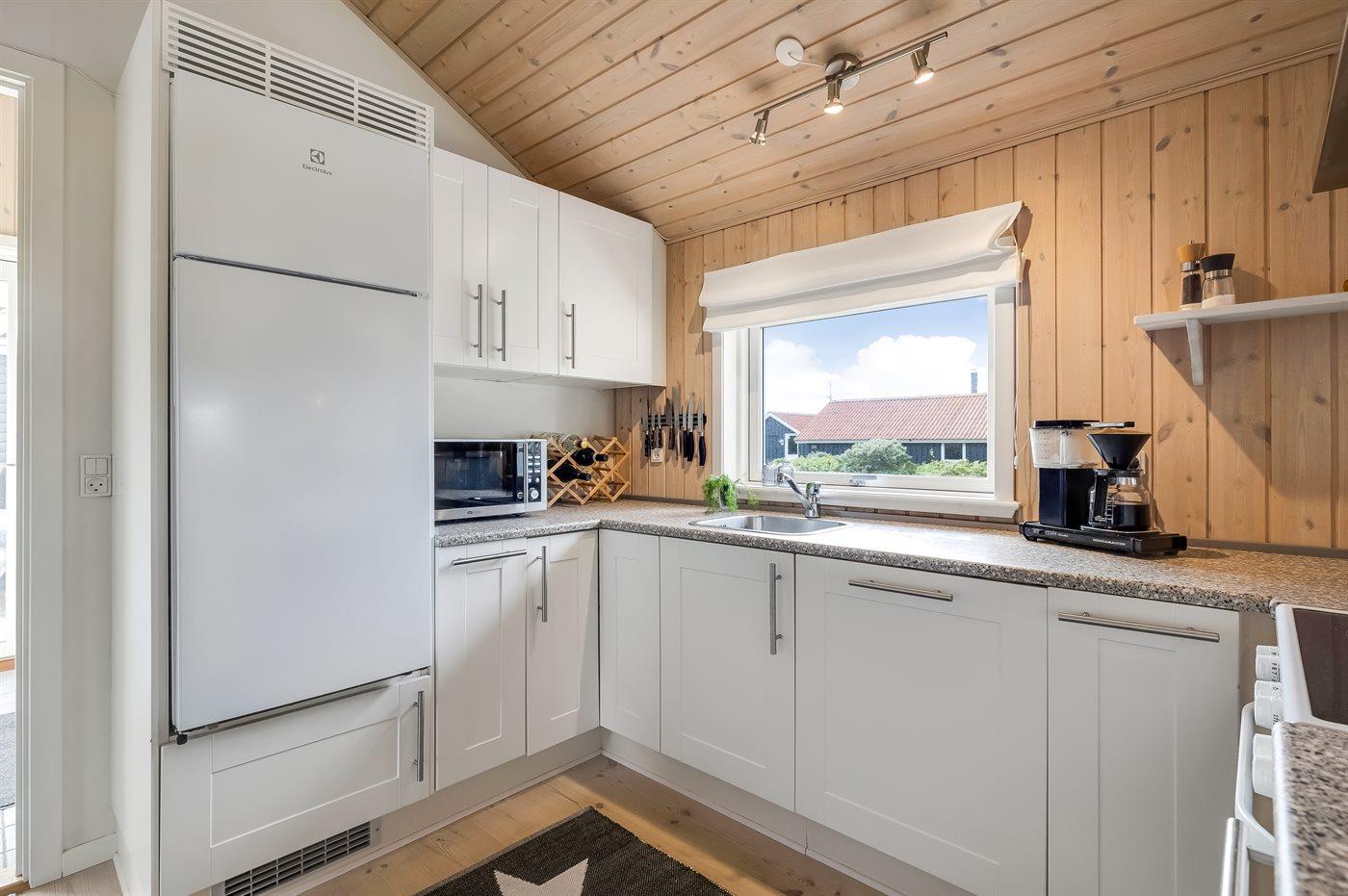 Køkkenet er udstyret med 1 køleskab. Der er 4 keramiske kogeplader, varmluftovn, mikrobølgeovn samt opvaskemaskine.