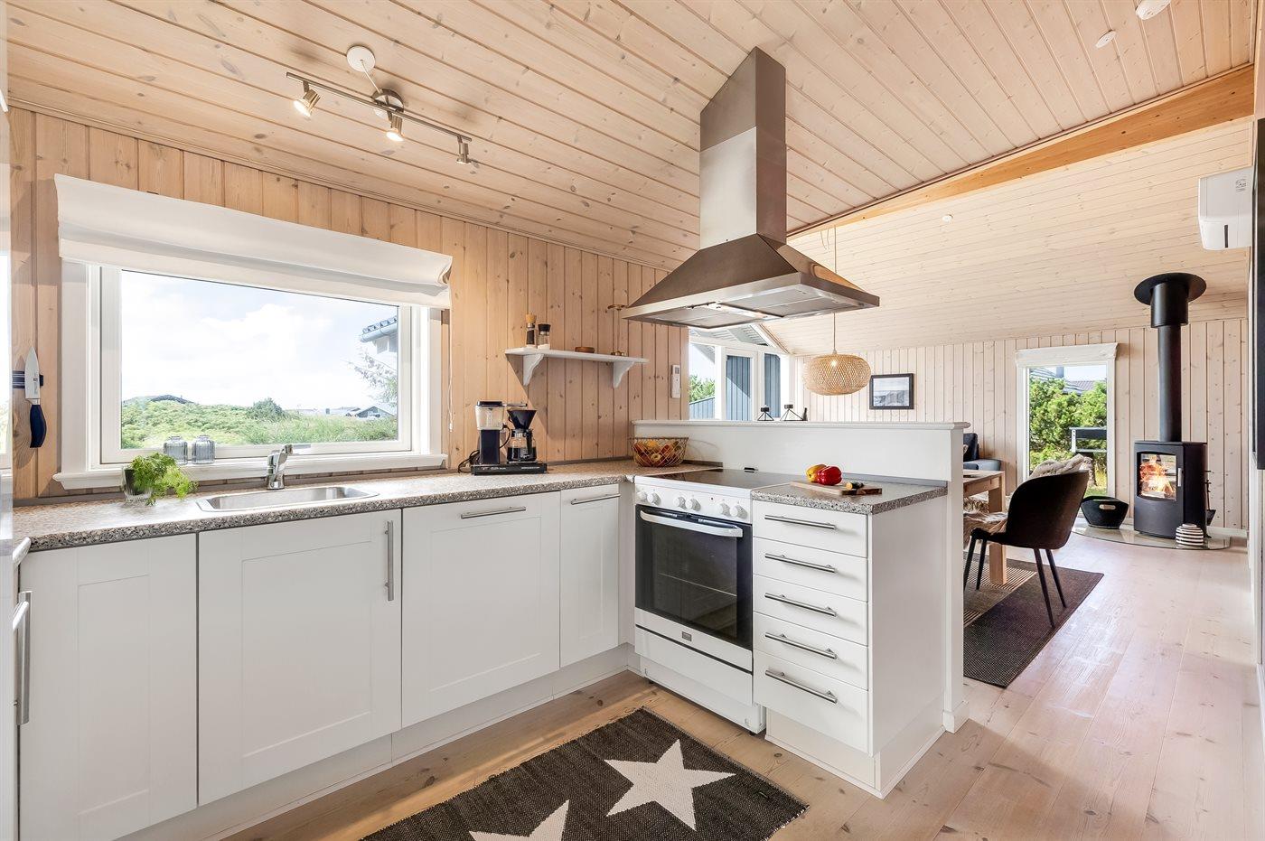 Drømmer du om ro, hygge og skøn natur? Dette sommerhus byder på en gennemført planløsning, hvor hver kvadratmeter er udnyttet optimalt. Det lyse og åbne køkken-alrum i forlængelse af stuen skaber den perfekte ramme om hyggelige stunder med familie og venner – ferieidyl helt tæt på Vesterhavet.