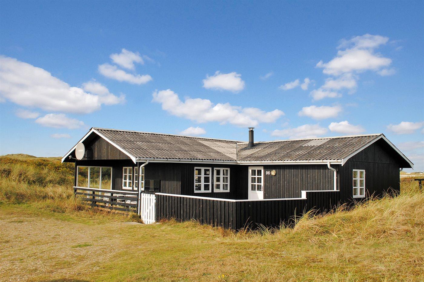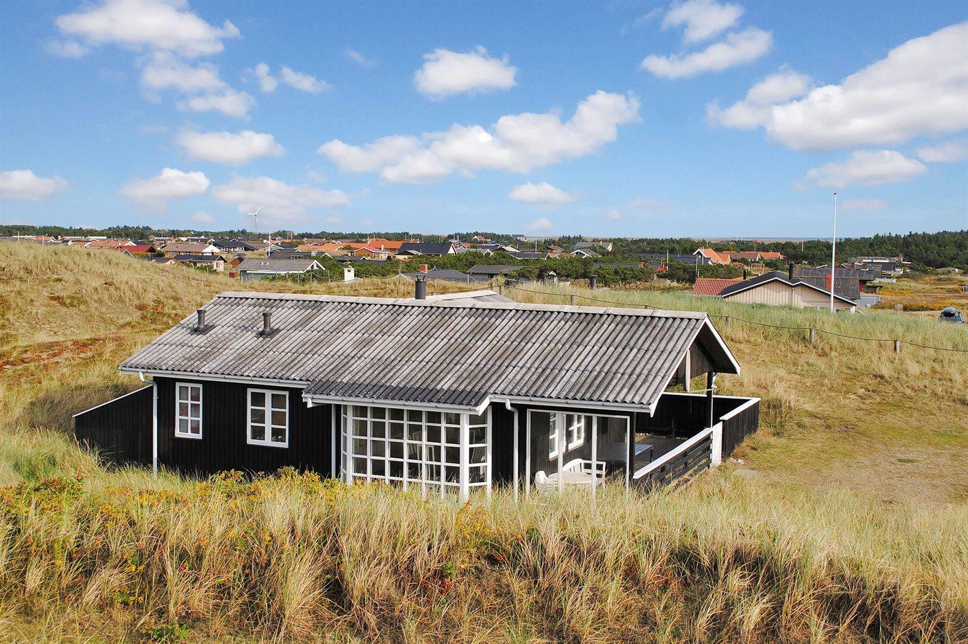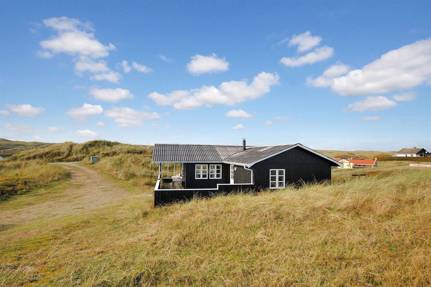 Sommerhus beliggende på en åben og kuperet grund tæt ved stranden og Vesterhavet.