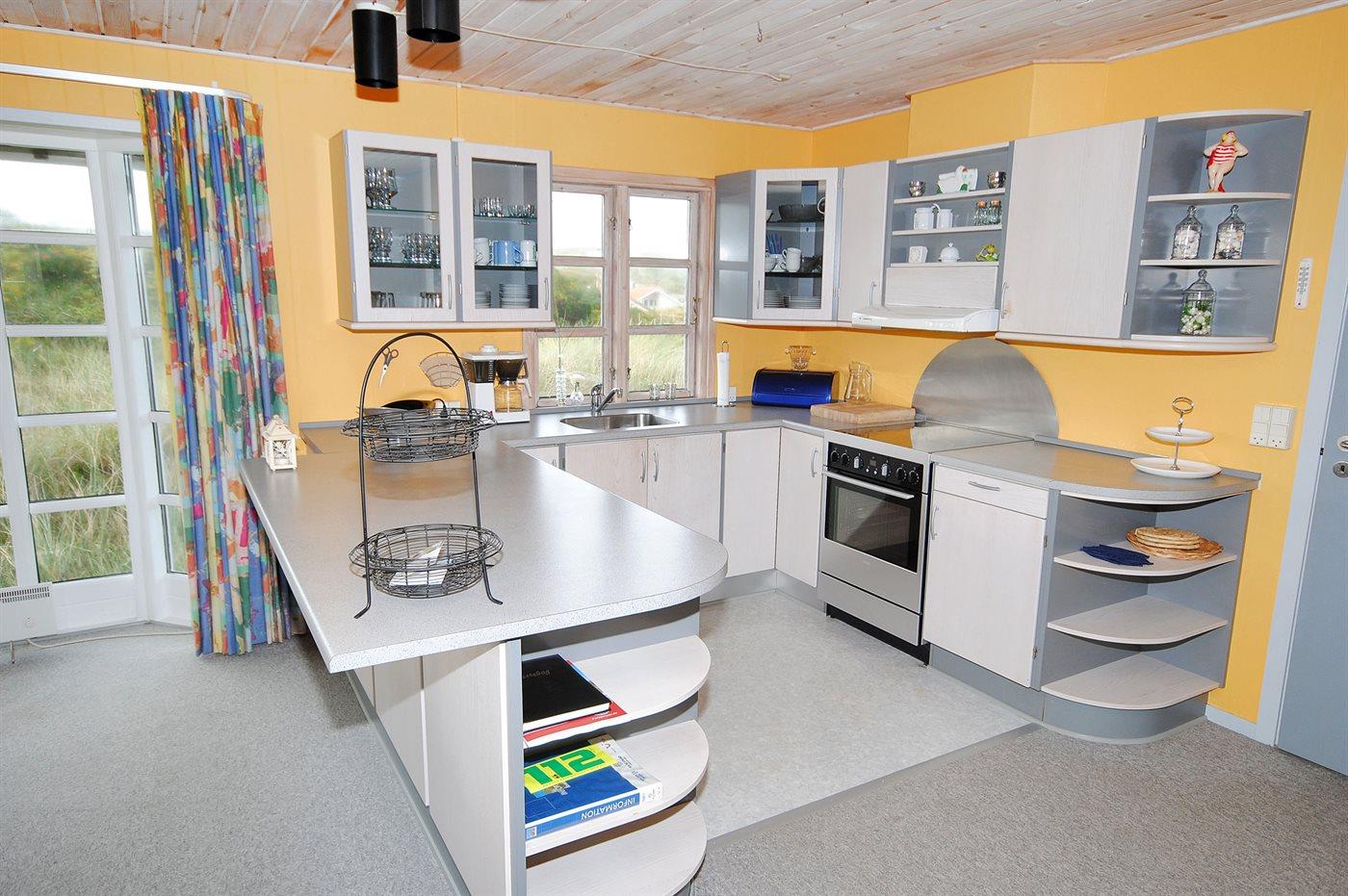Køkkenet er udstyret med 1 køleskab. Der er 4 elkogeplader, bageovn, mikrobølgeovn.
