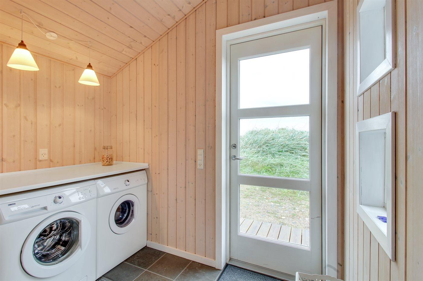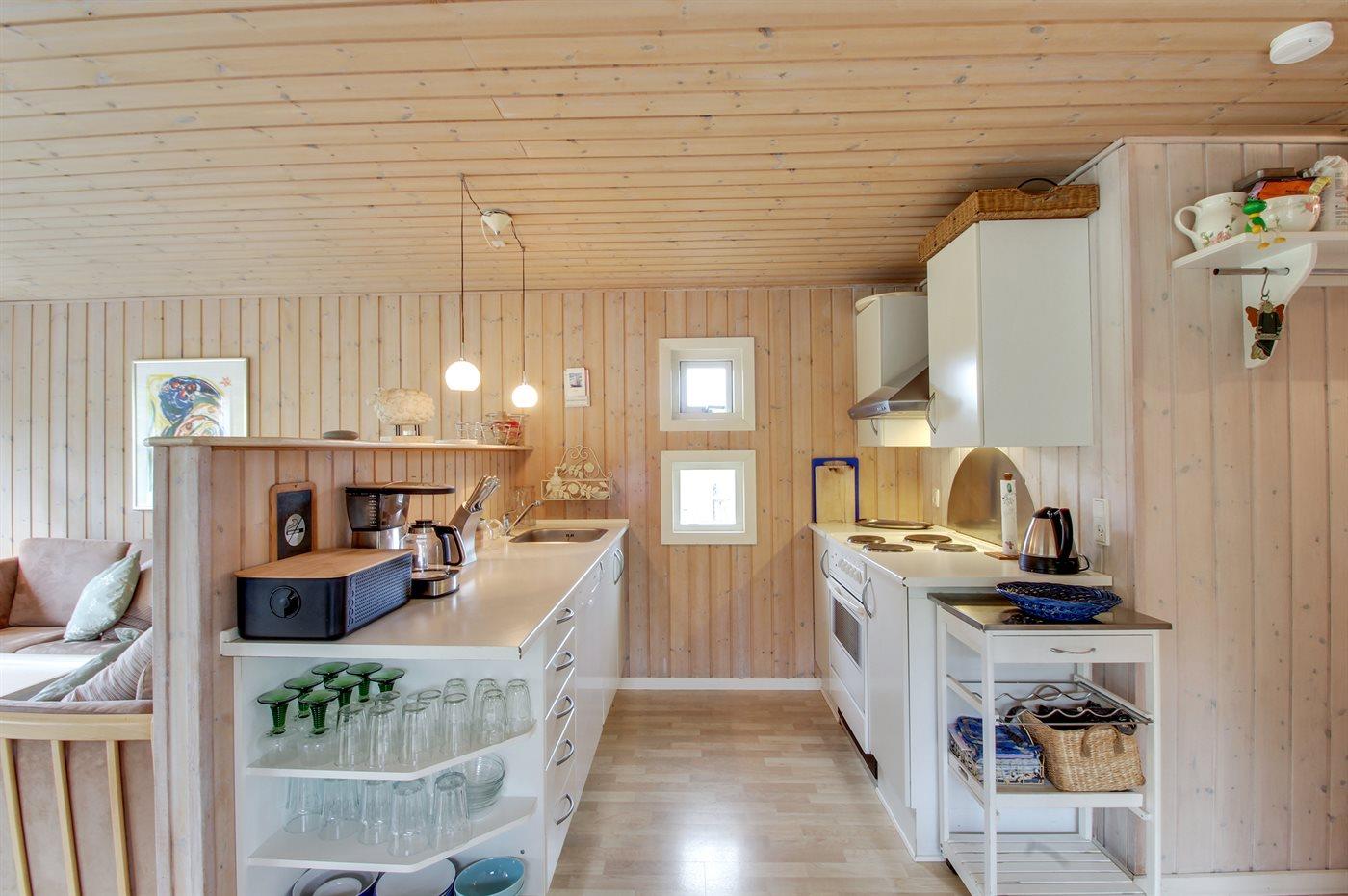 Køkkenet er udstyret med 1 køleskab. Der er 4 elkogeplader, bageovn, mikrobølgeovn samt opvaskemaskine.