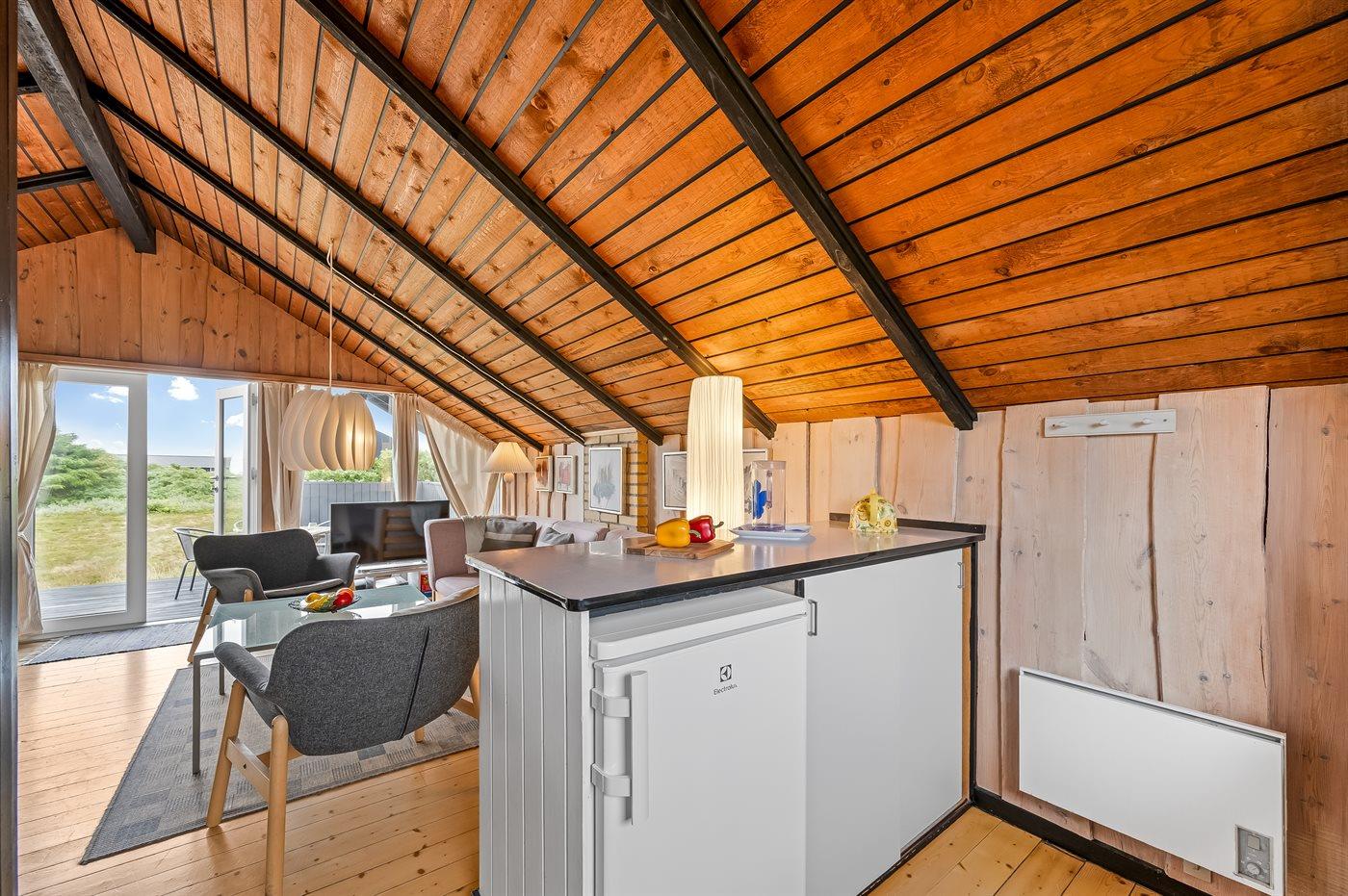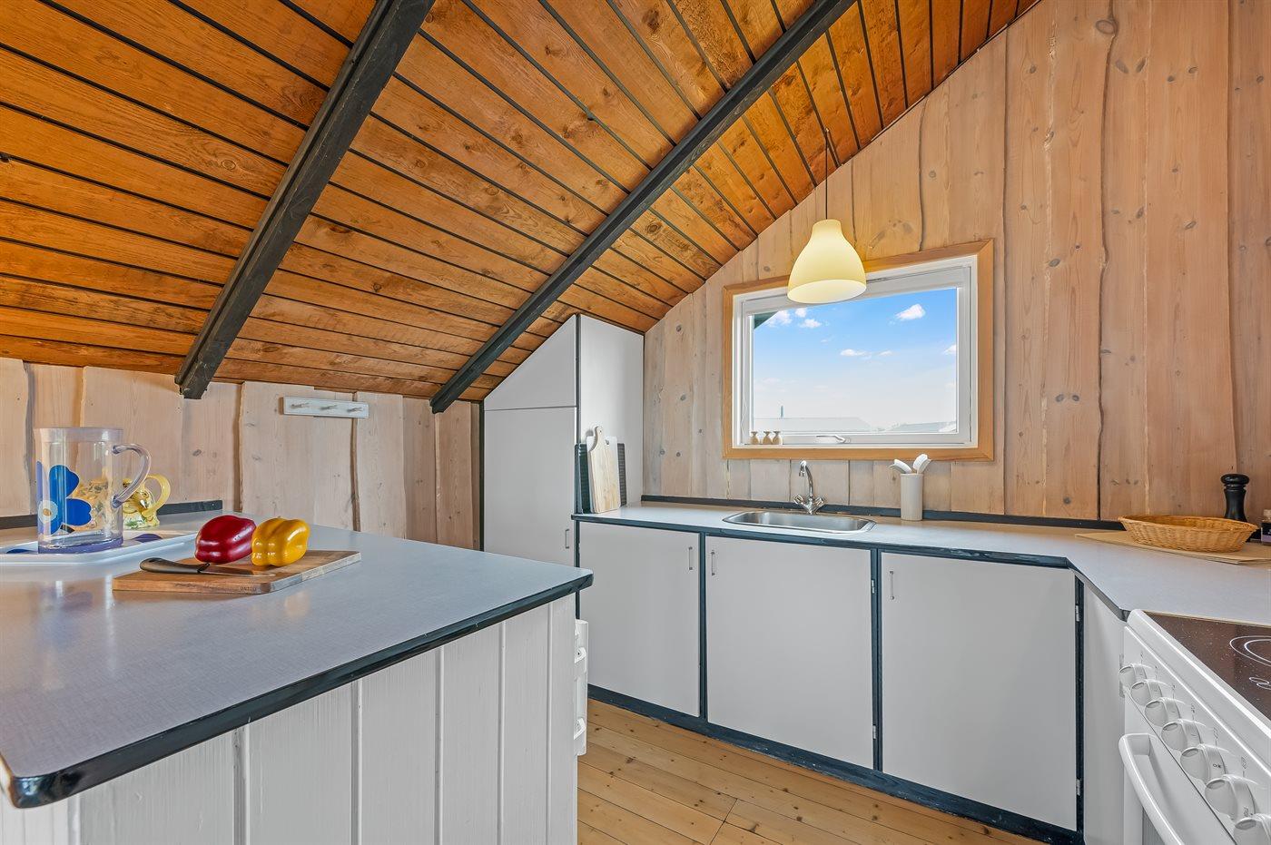 Køkkenet er udstyret med 1 køleskab. Der er 4 keramiske kogeplader, varmluftovn, mikrobølgeovn.
