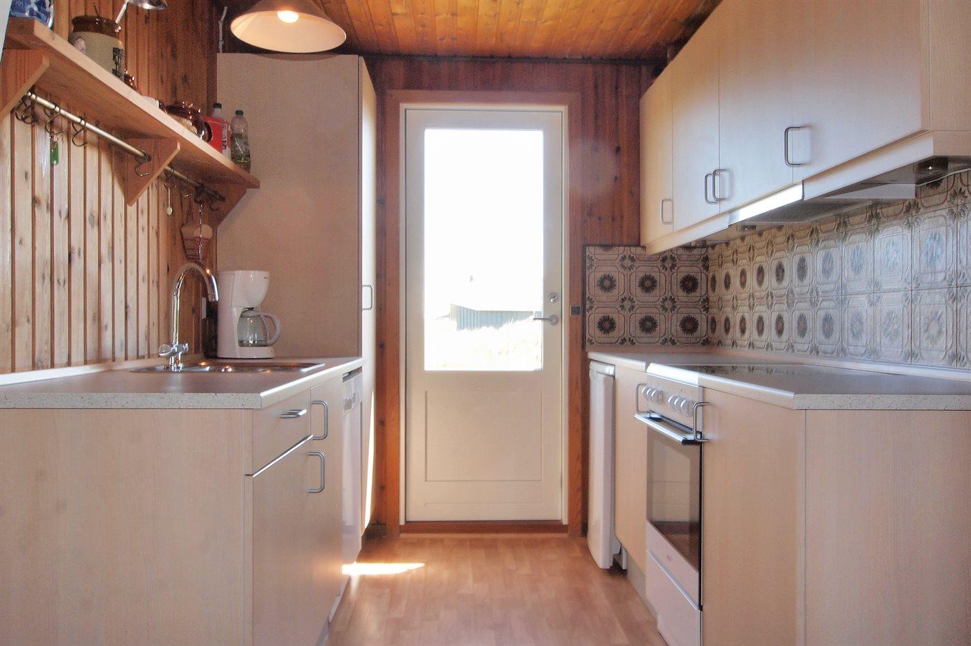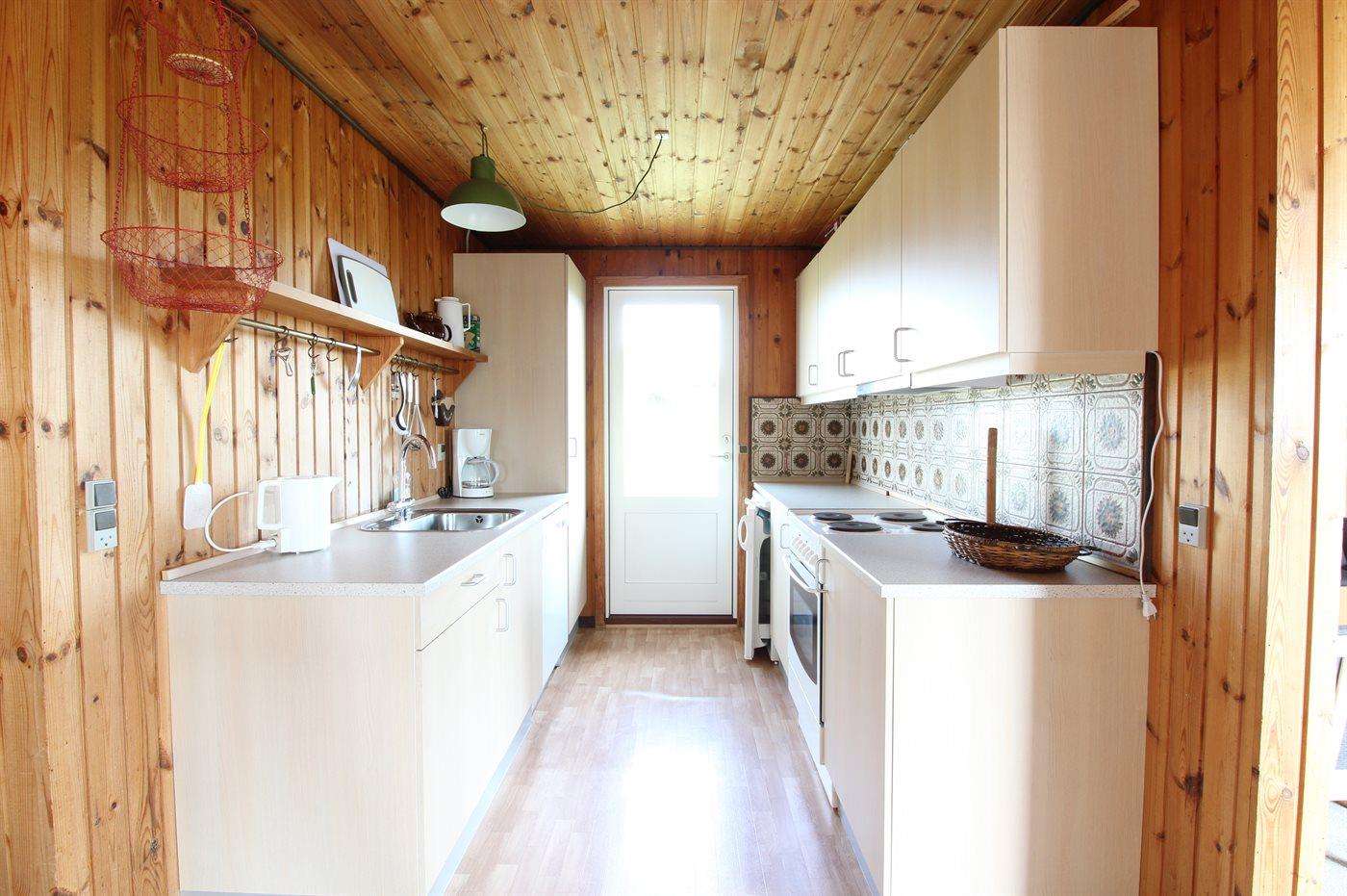 Køkkenet er udstyret med 1 køleskab. Der er 4 elkogeplader, bageovn samt opvaskemaskine.