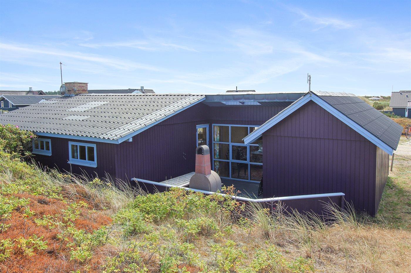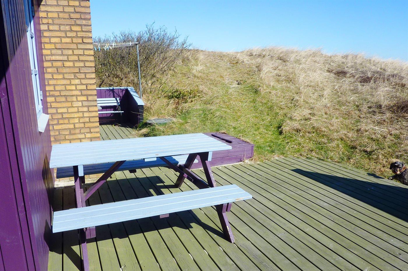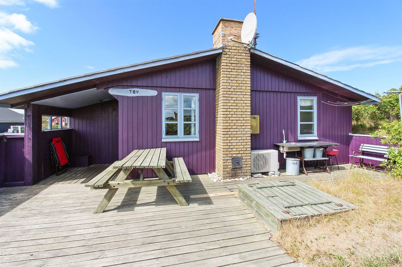 Charmerende træsommerhus med terrasse nær havet i Hvide Sande, perfekt til afslapning i naturskønne omgivelser.