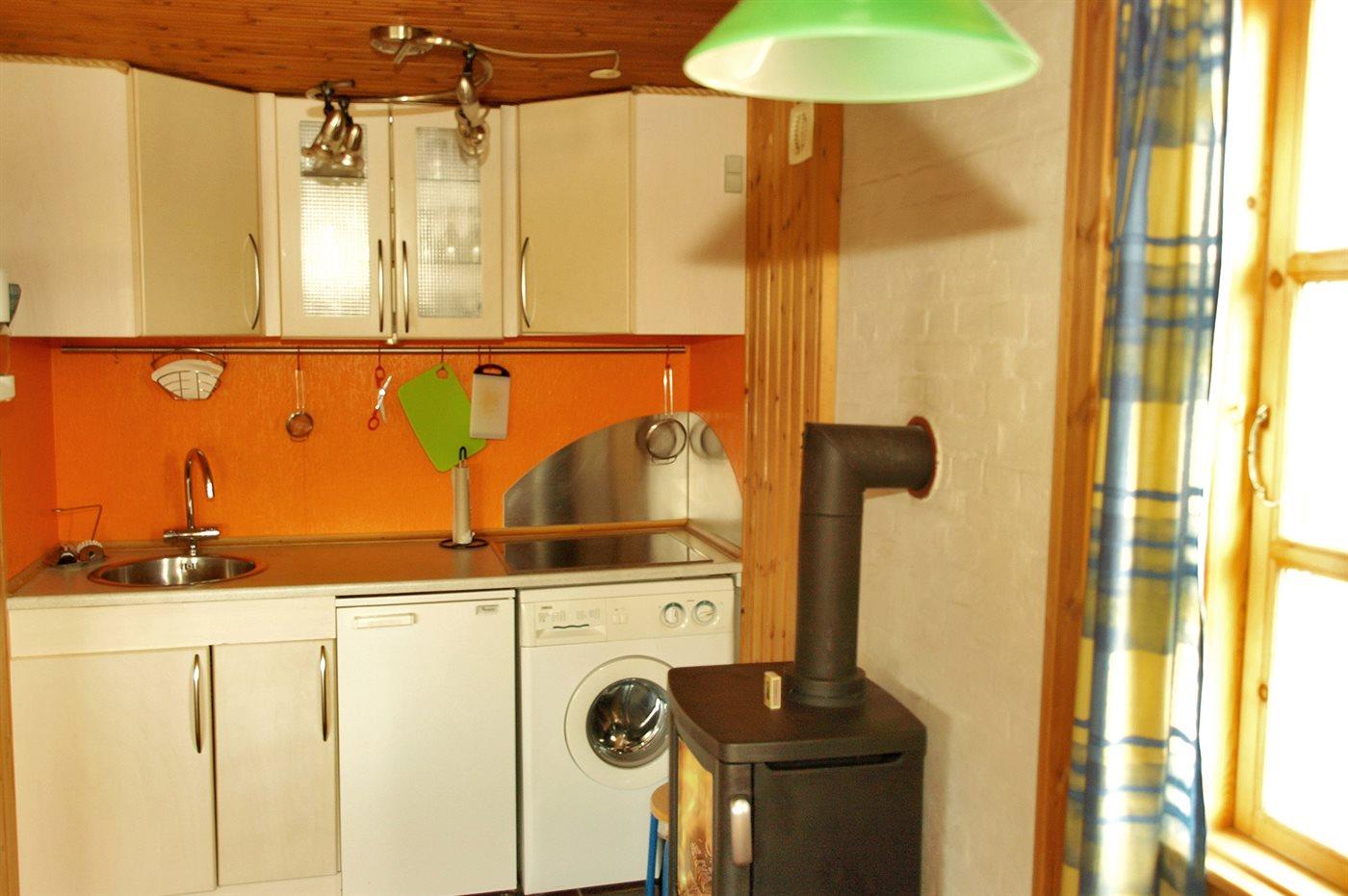 Køkkenet er udstyret med 1 køleskab. Der er 4 keramiske kogeplader. Miniovn er kombineret varmluftovn og mikrobølgeovn.