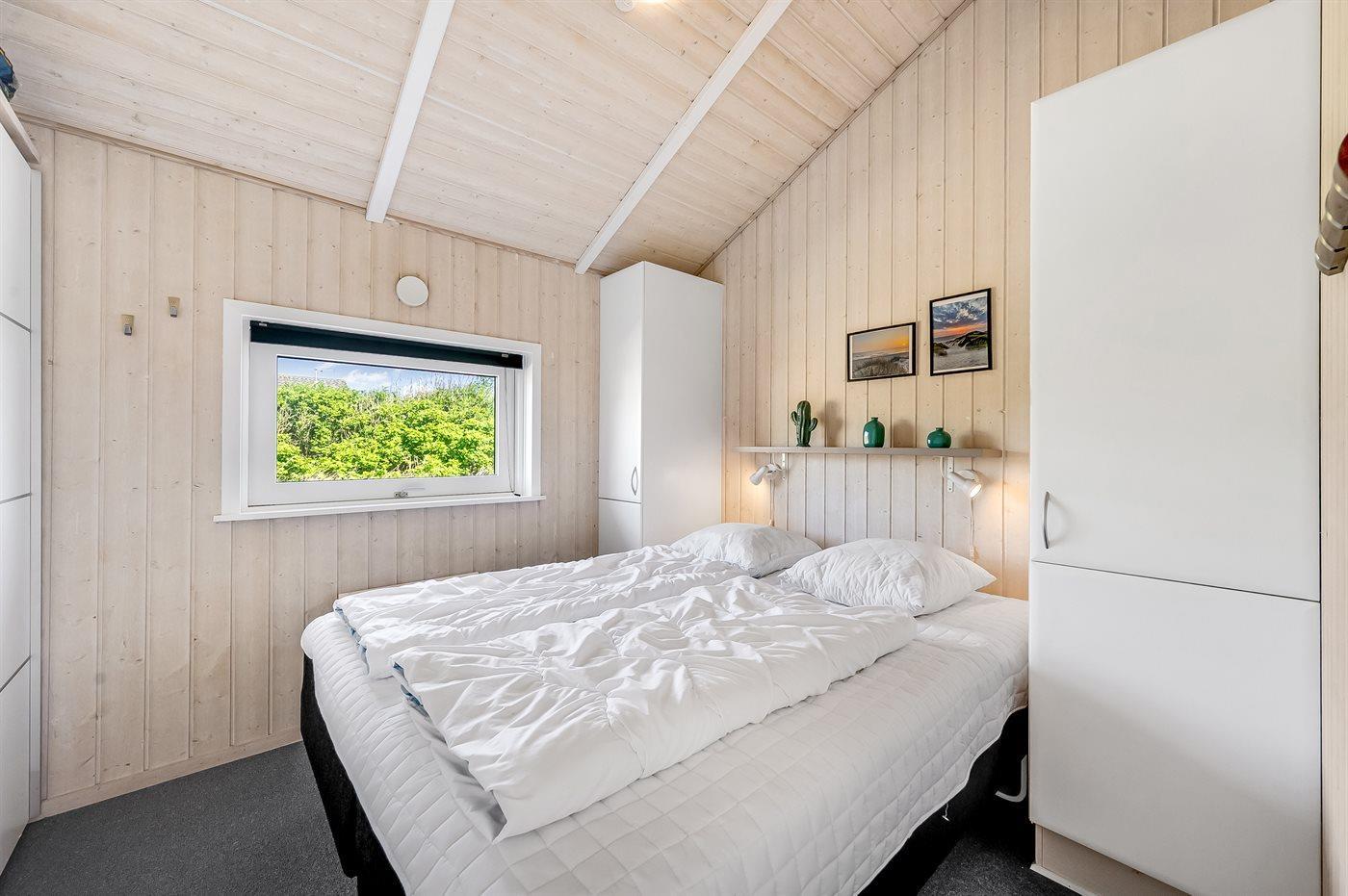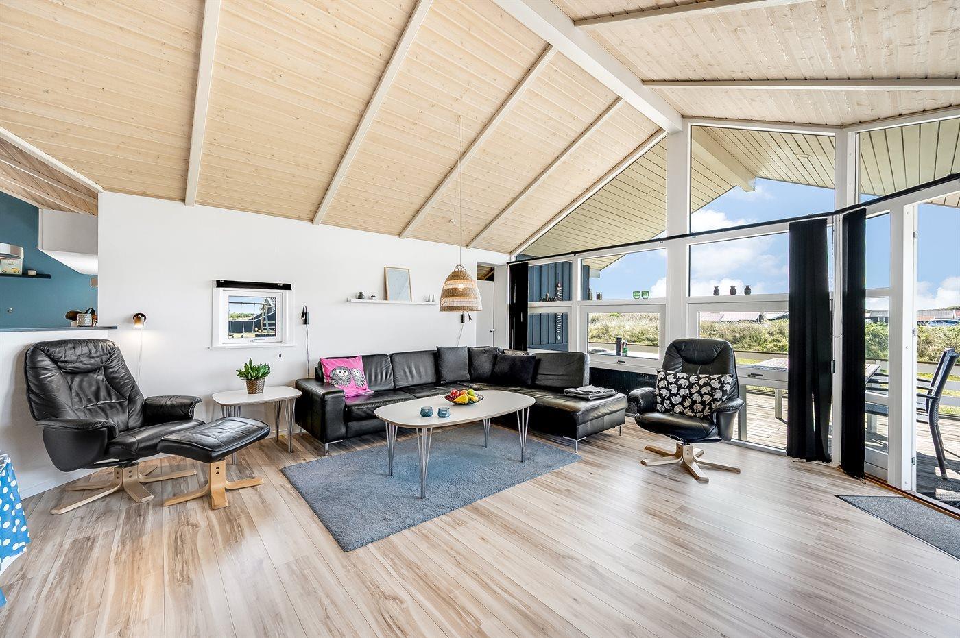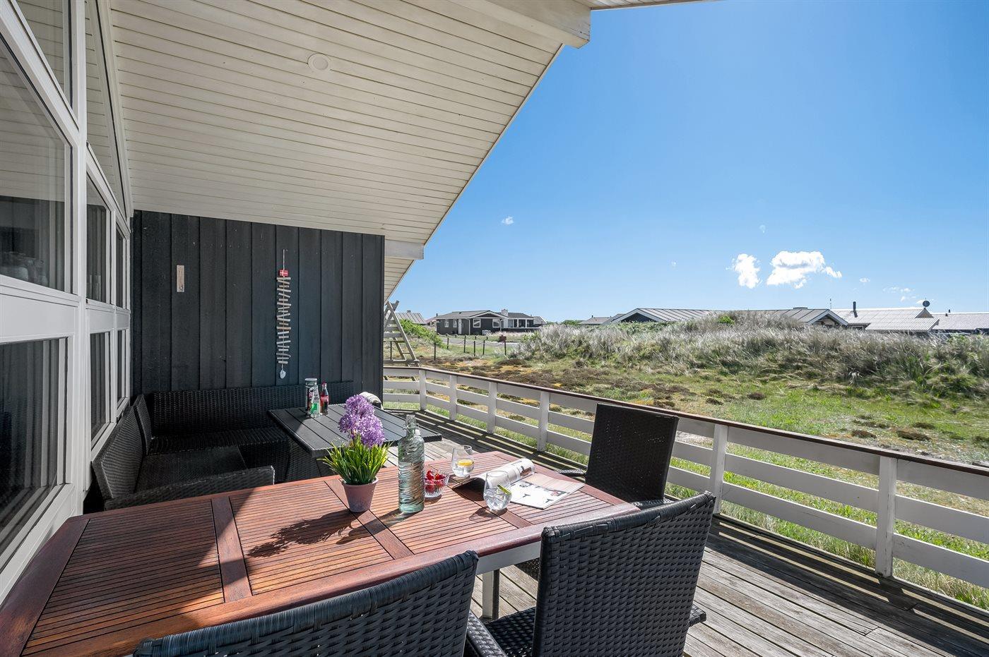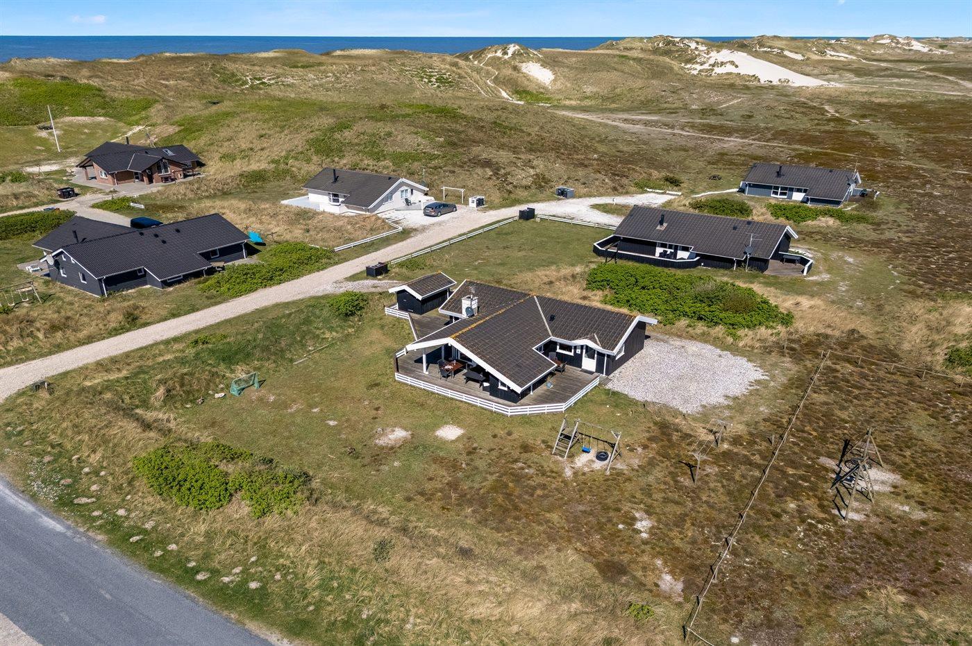 Virkelig lækkert sommerhus i træ med spa og sauna. Huset er bygget i 2003 og beliggende på en naturgrund kun 200 m fra Vesterhavet. Til huset hører stort terrasseareal, både åbent og overdækket, med havemøbler. Lyse trælofter og -vægge. Trægulv med løse tæpper, gulvtæppe i værelser, klinkegulv i gang. Lækkert badeværelse med spa, bruseniche og gulvvarme. Fra badeværelset direkte adgang til husets sauna. Gæstetoilette. Det moderne veludstyrede køkken indeholder bl.a. varmluftovn, mikrobølgeovn, opvaskemaskine og fryser. Hyggelig og smagfuldt indrettet opholdsstue med brændeovn, TV med parabol (digital), DVD-afspiller og stereoanlæg med CD-afspiller. Husets sovepladser fordeler sig på 3 værelser, alle med dobbeltseng. Huset er yderligere udstyret med gratis ADSL-internetforbindelse (computer medbringes), samt vaskemaskine og tørretumbler. Sandkasse og gynge på grunden. Et flot, lyst, venligt og anbefalelsesværdigt sommerhus med udsigt til klitterne.