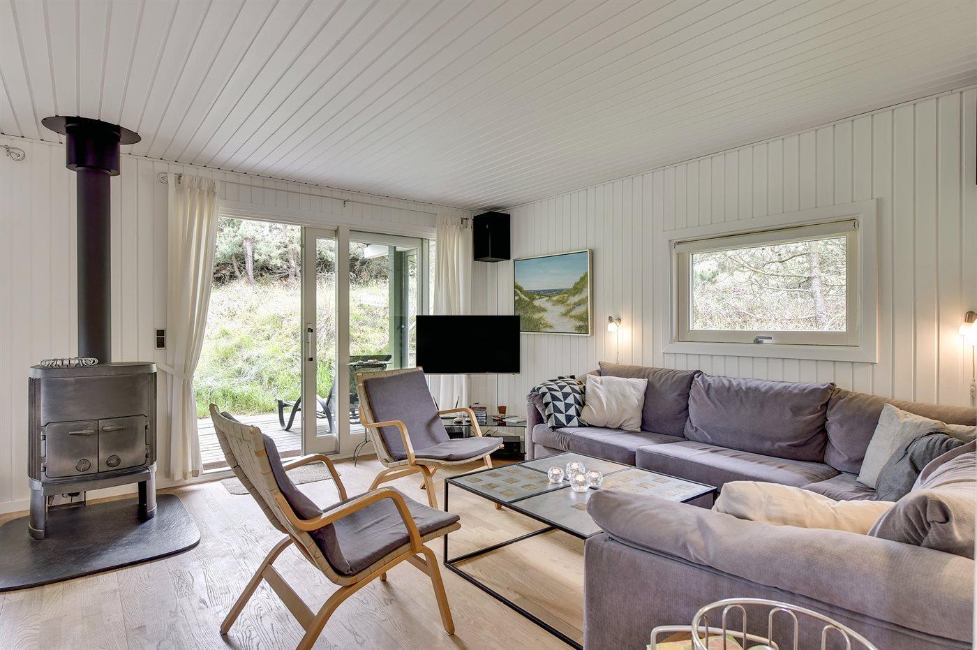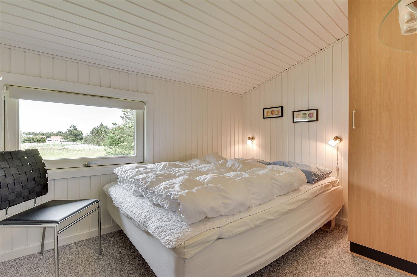 På en skøn natur- og kuperet klitgrund, hvorfra der er udsigt over Ringkøbing Fjord, ligger dette sommerhus for enden af en lukket vej. Til huset hører flere terrasser med gode læforhold.