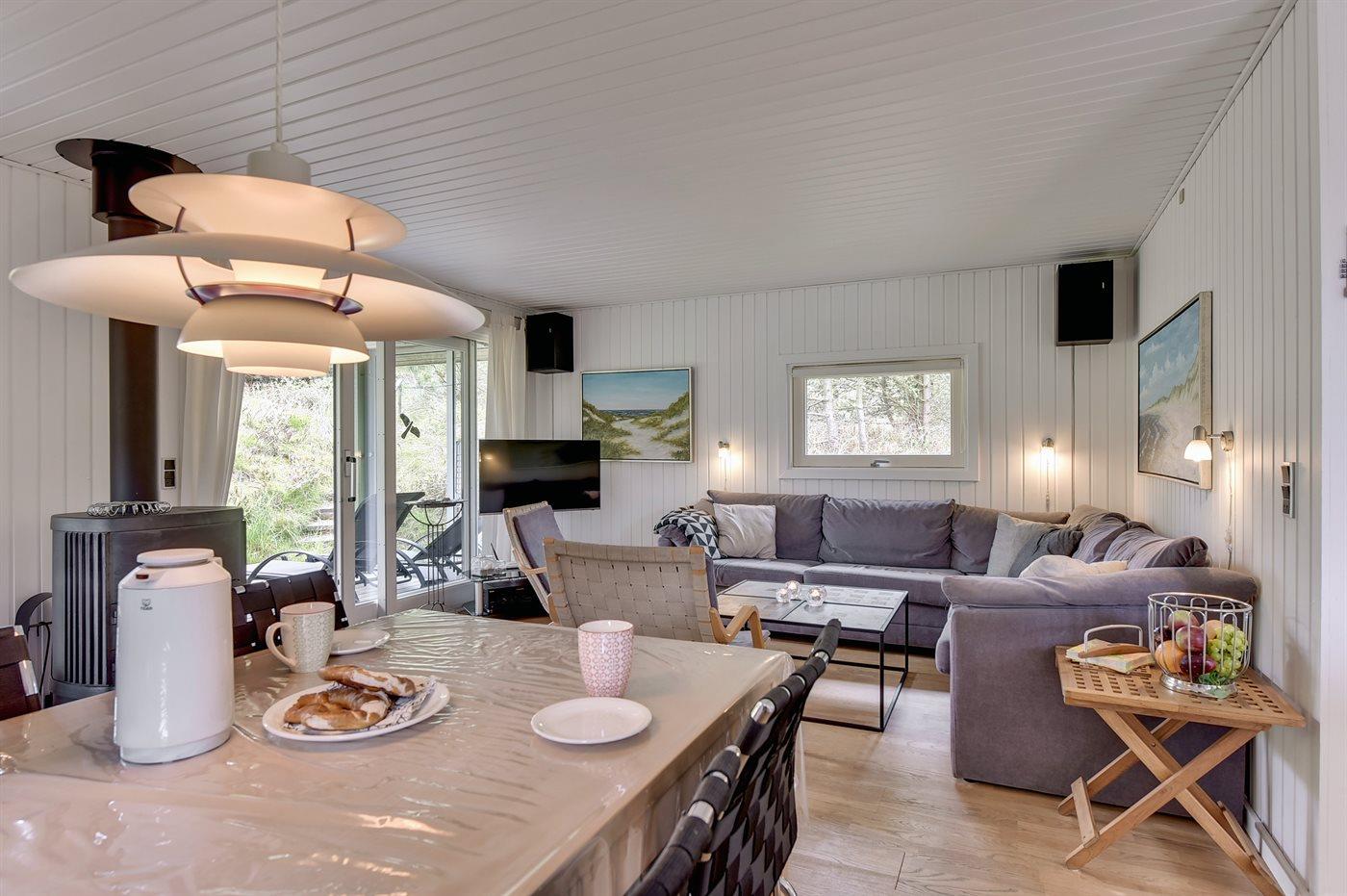 Hyggeligt sommerhus i Hvide Sande med udsigt over Ringkøbing Fjord og flere terrasser.