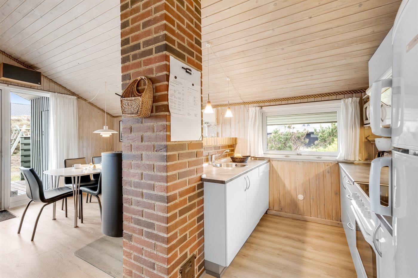 På en dejlig, kuperet klitgrund kun 200 m fra Vesterhavet ligger dette dejlige og velholdte sommerhus af træ, bygget i 1985 og moderniseret i 2008. Åbent og overdækket terrasseareal med diverse havemøbler og gode læforhold. Trævægge og -lofter samt gulvtæppe overalt - dog vinylgulv i køkkenet. Badeværelse med bruseniche og gulvvarme. Køkken med bl.a. opvaskemaskine, mikrobølgeovn og fryser. Hyggelig opholdsstue med brændeovn og fladskærms-TV med parabol (digital). 3 værelser; 1 med dobbeltseng, 1 med 2 enkeltsenge og 1 med køjeseng. Desuden vaskemaskine samt tørretumbler til rådighed og der er installeret energibesparende varmepumpe. Til børnene er der sandkasse, gynge, barneseng og høj barnestol. Et godt beliggende sommerhus.