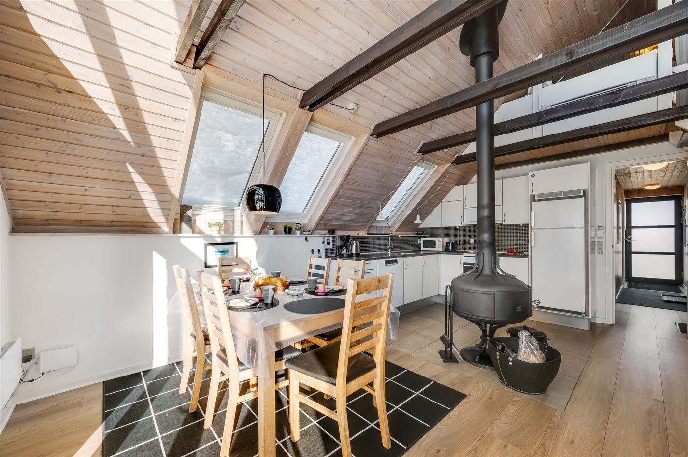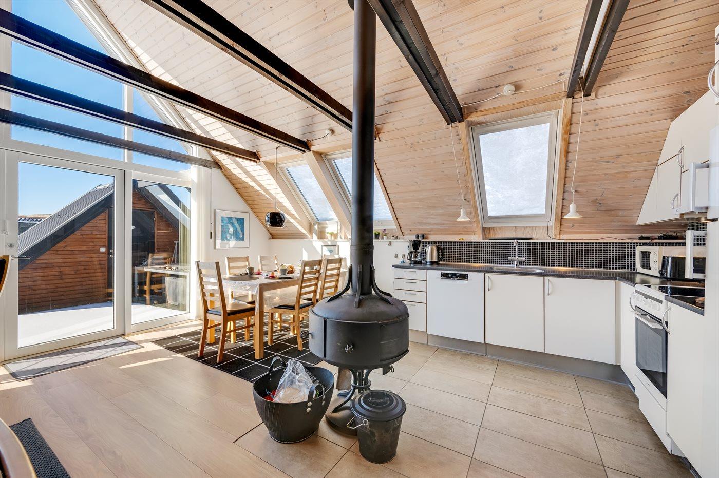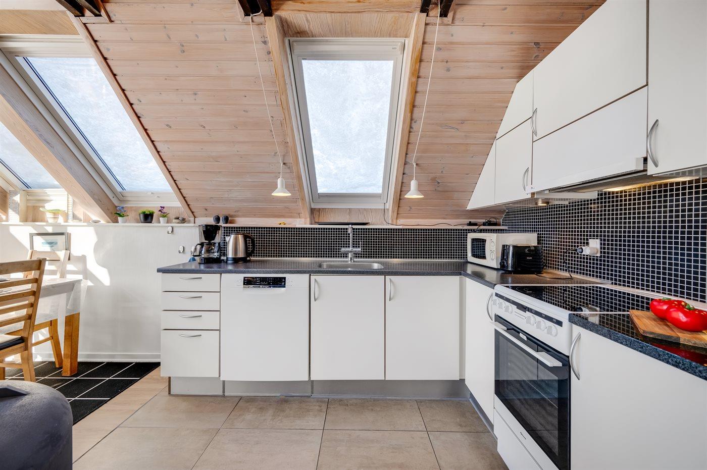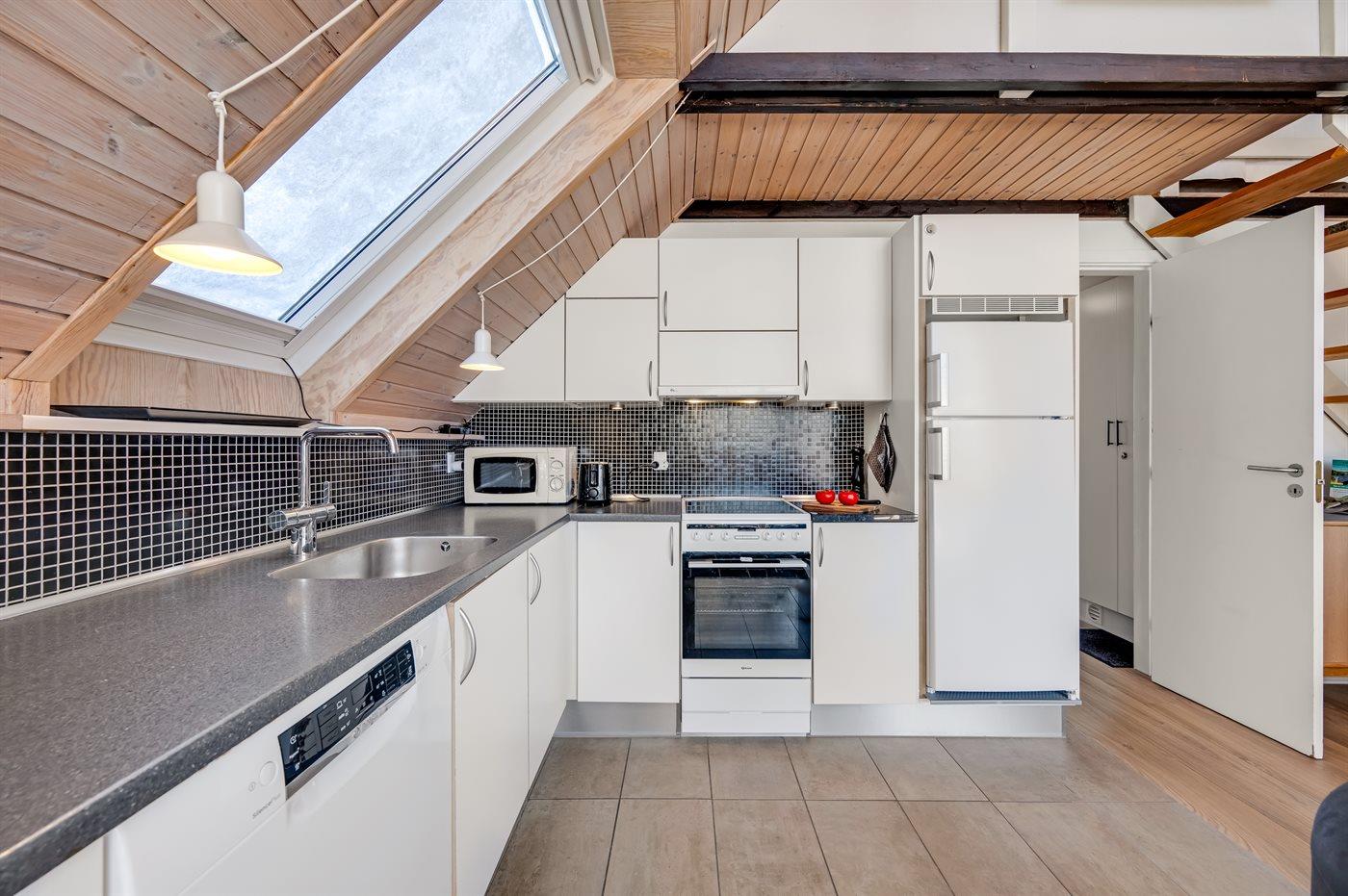 Køkkenet er udstyret med 1 køleskab. Der er 4 keramiske kogeplader, varmluftovn, mikrobølgeovn samt opvaskemaskine.