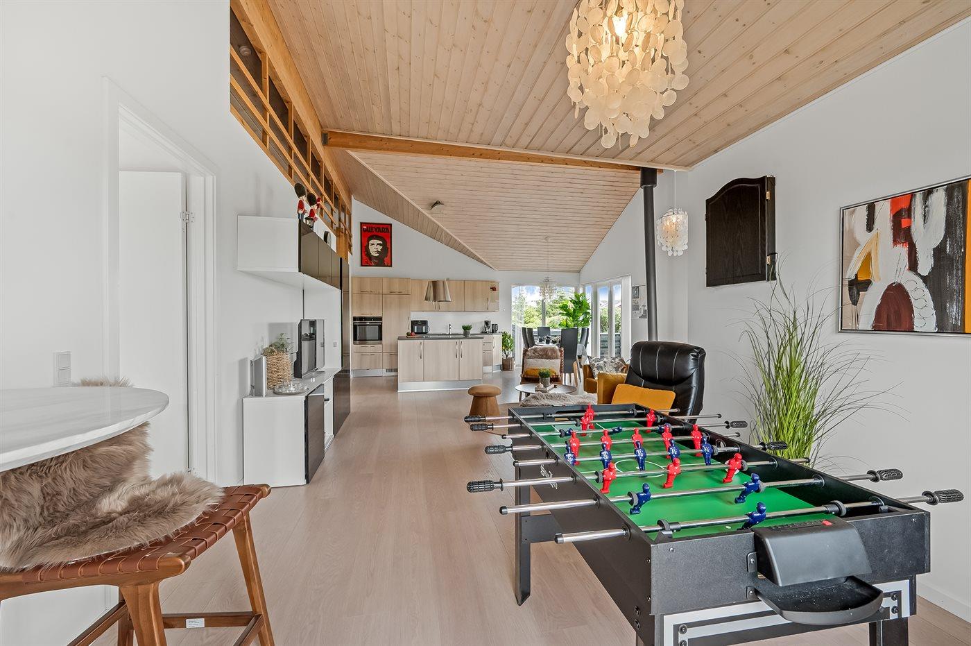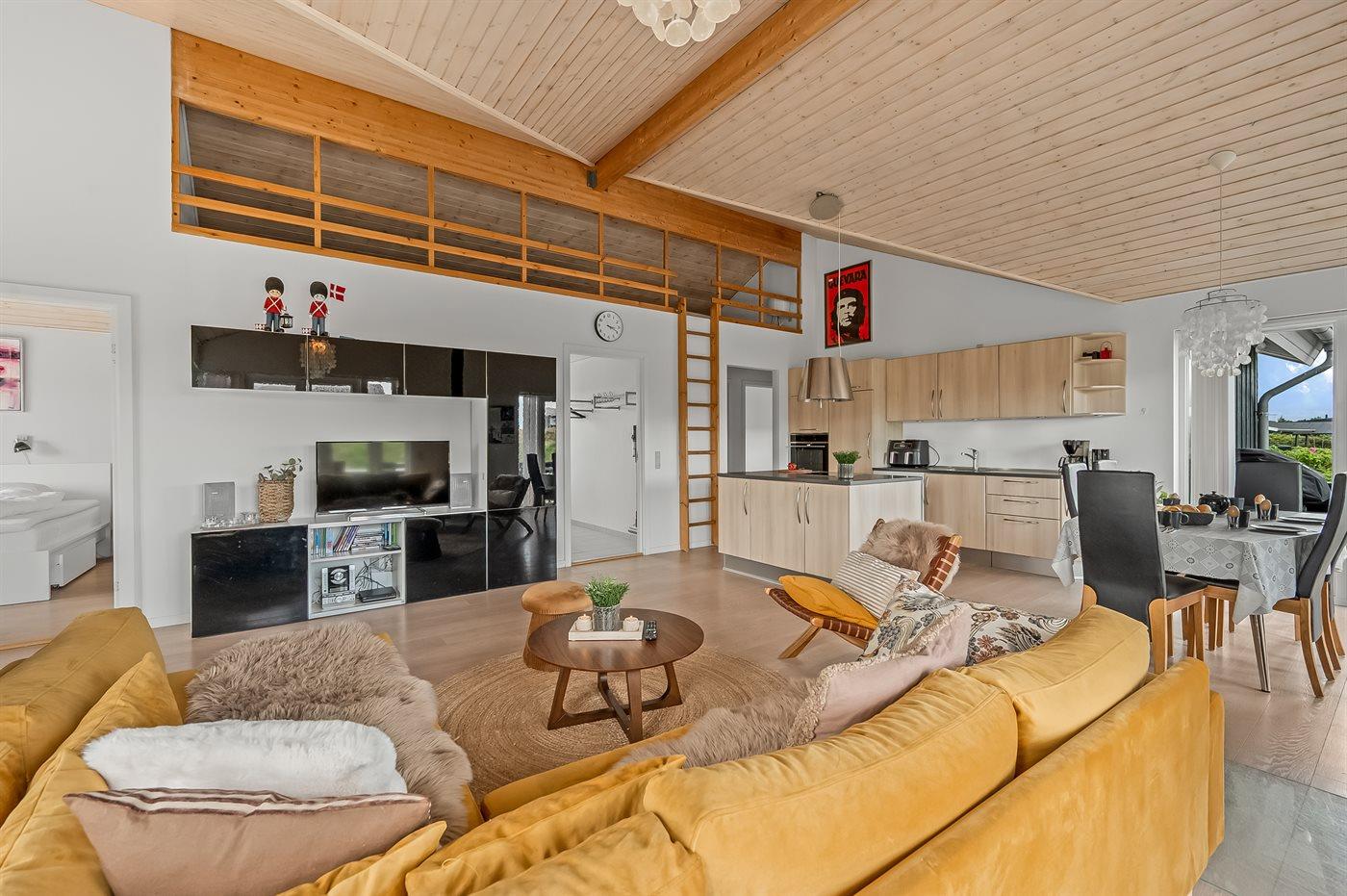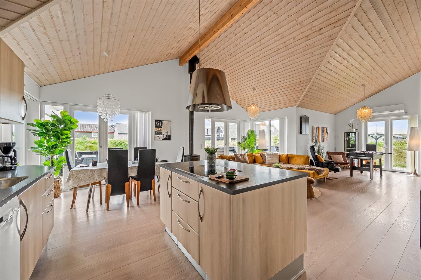 Indenfor i sommerhuset venter dig et stort og lyst køkken-alrum, hvor I kan slappe af, nyde hinandens selskab, samt forberede og nyde måltiderne sammen. Køkkenet er fuldt udstyret med alt, hvad I behøver for at lave lækre måltider.